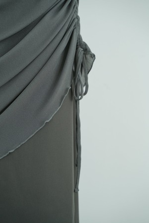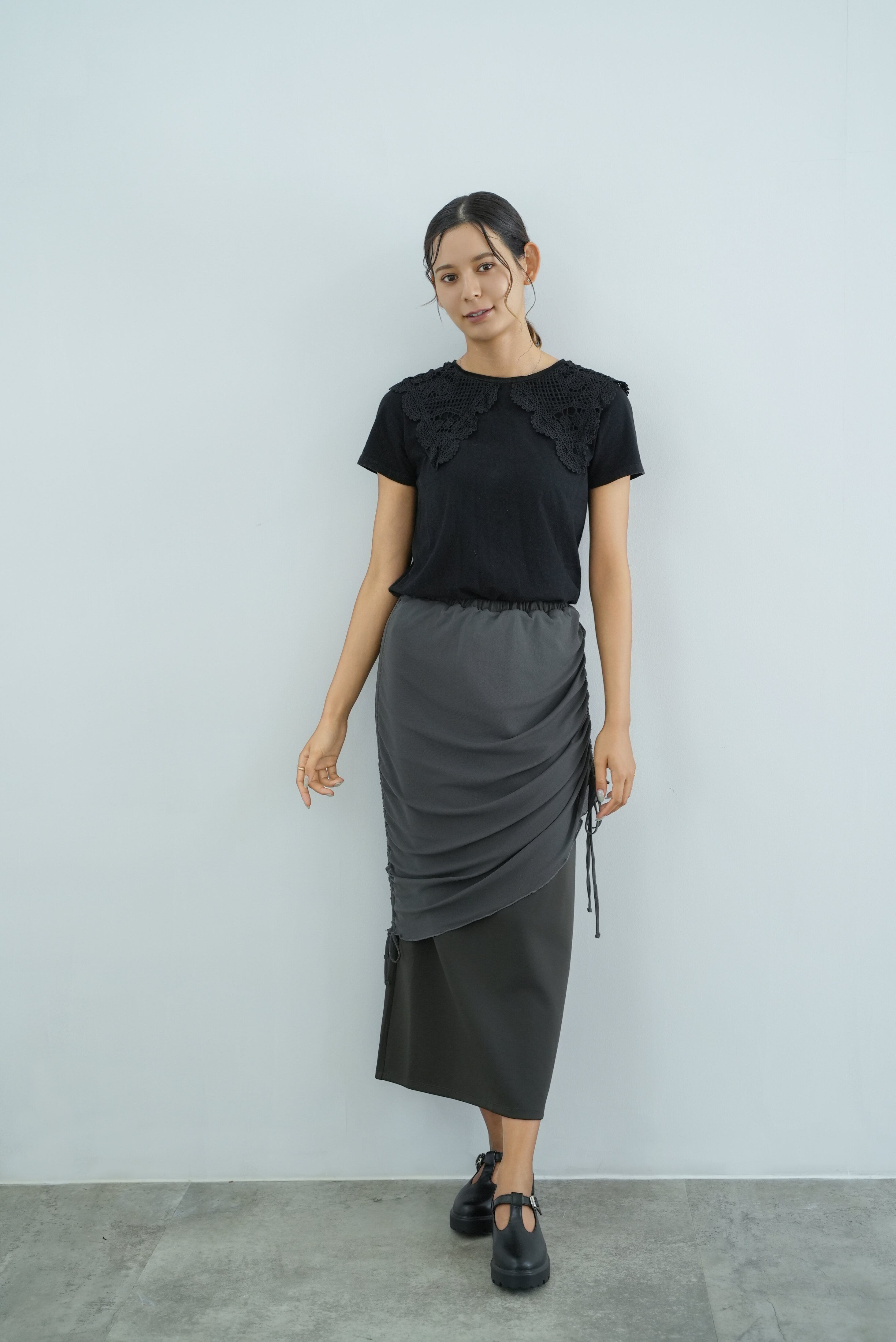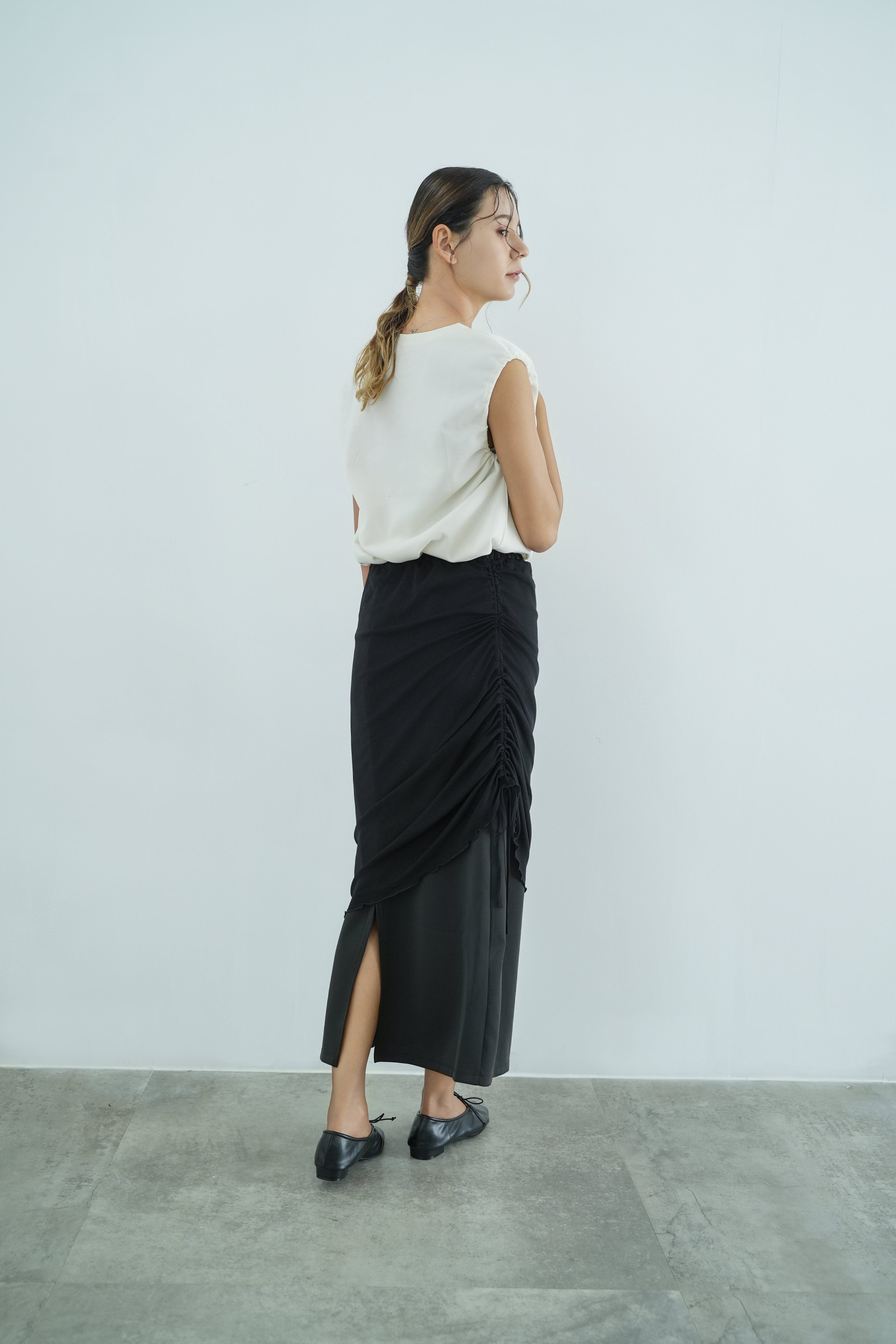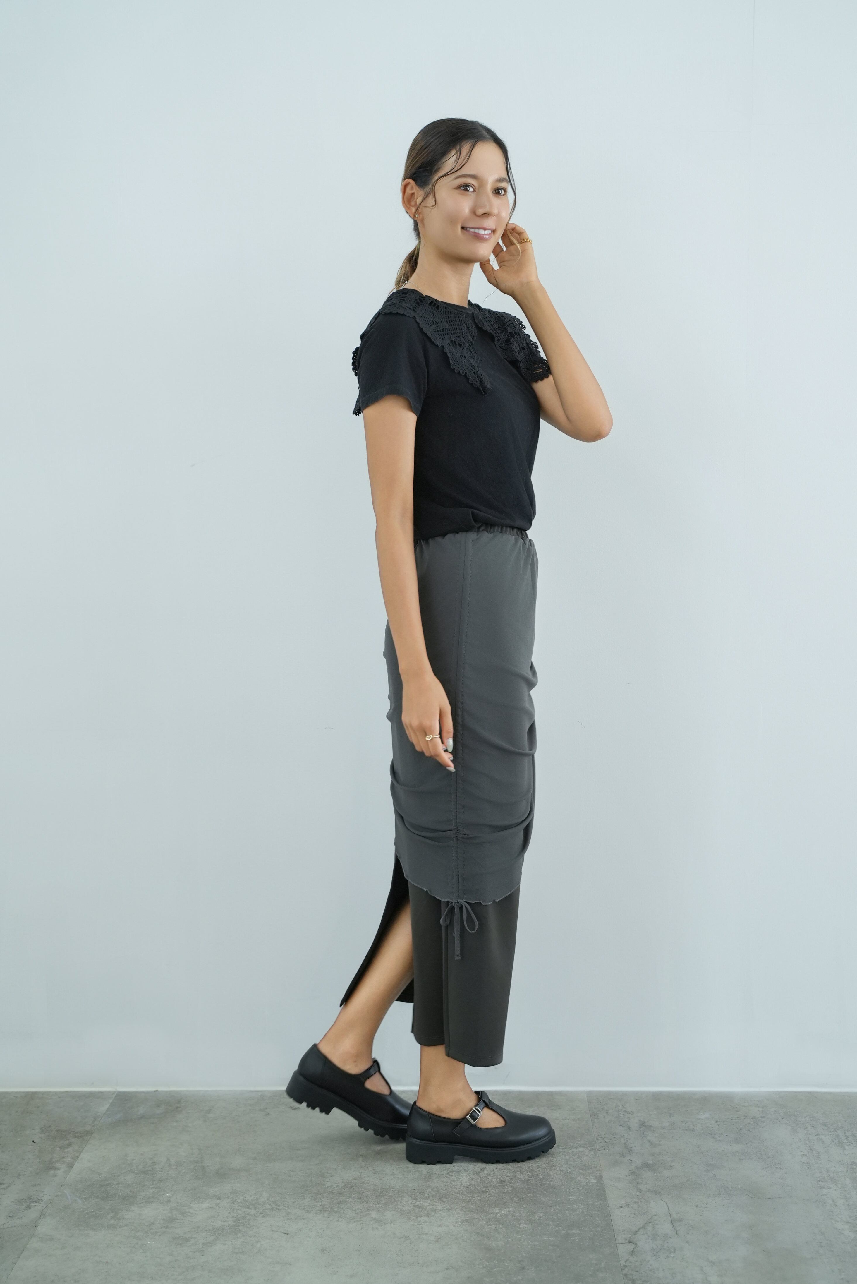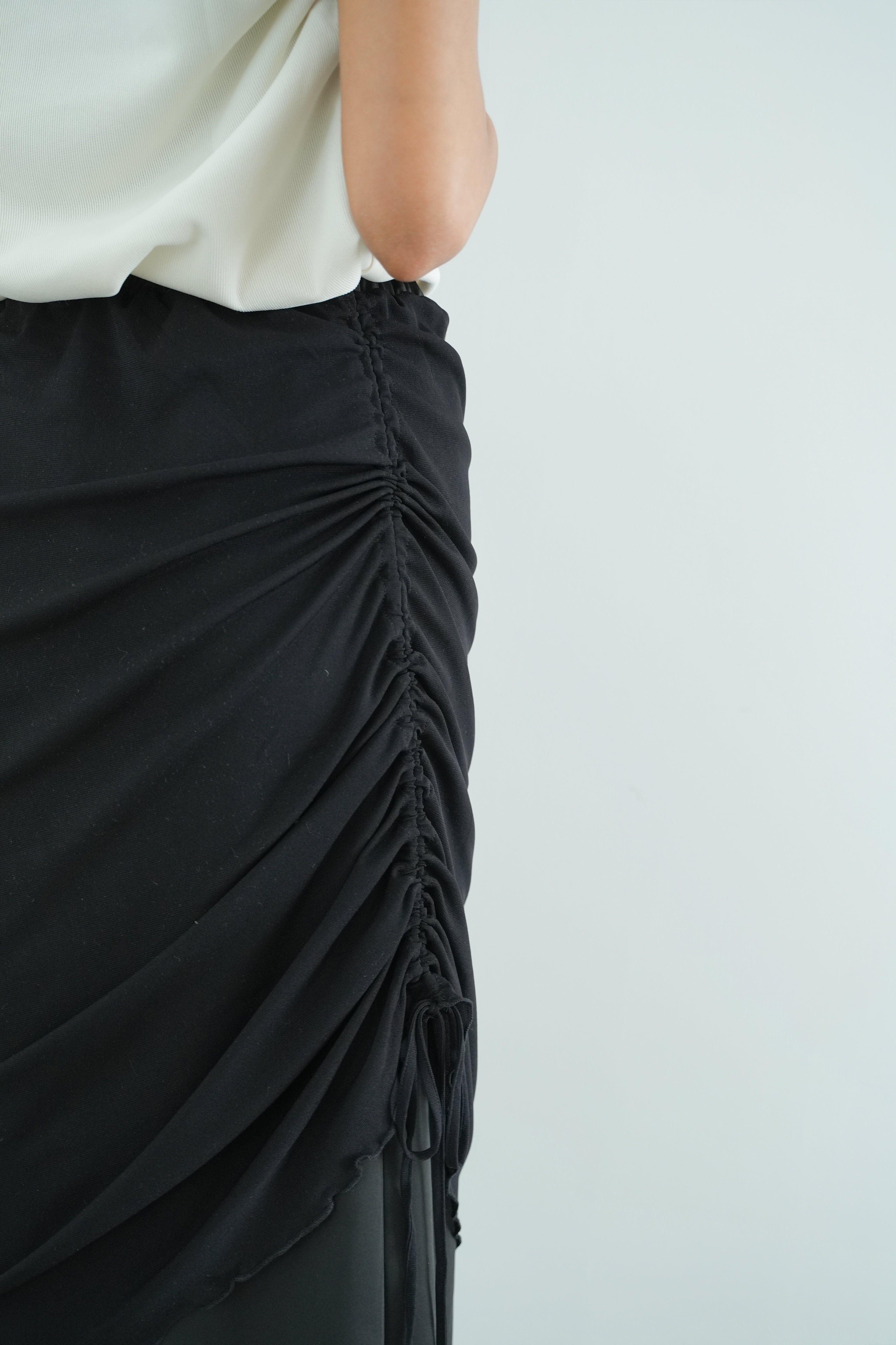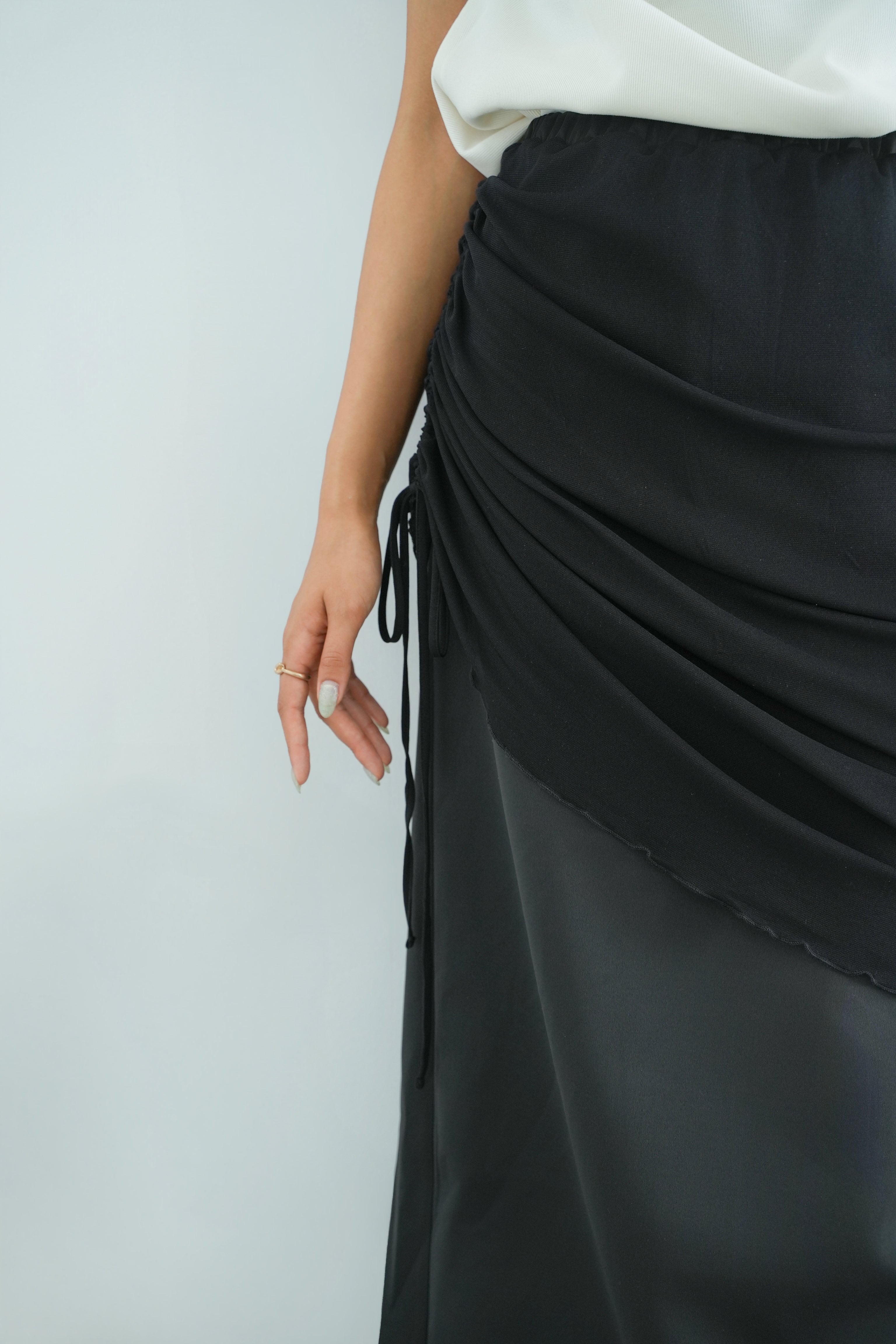 シンプルで洗練された印象を与えるブラックの異素材レイヤードスカート。さらりと落ち感のあるベースに、シフォンのような軽やかな素材を重ね、ドローストリングで自由に表情を変えられる2WAY仕様が魅力です。片側に寄せたギャザーが生むアシンメトリーなラインが、動きにニュアンスを加え、着こなしに奥行きをプラス。ウエストはゴム仕様でストレスフリーな穿き心地。モードにもフェミニンにも振れる、タイムレスでミニマルな一枚です。