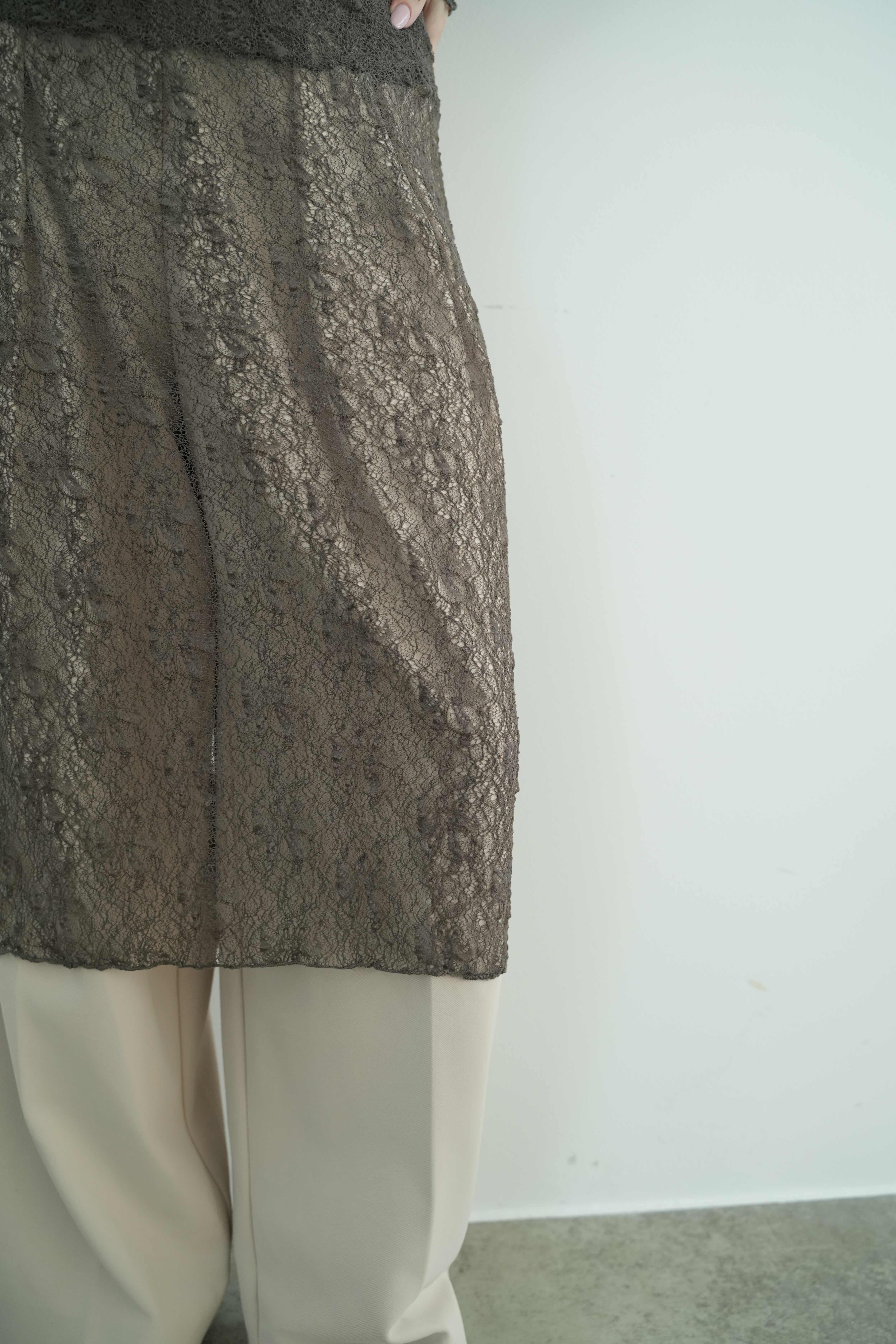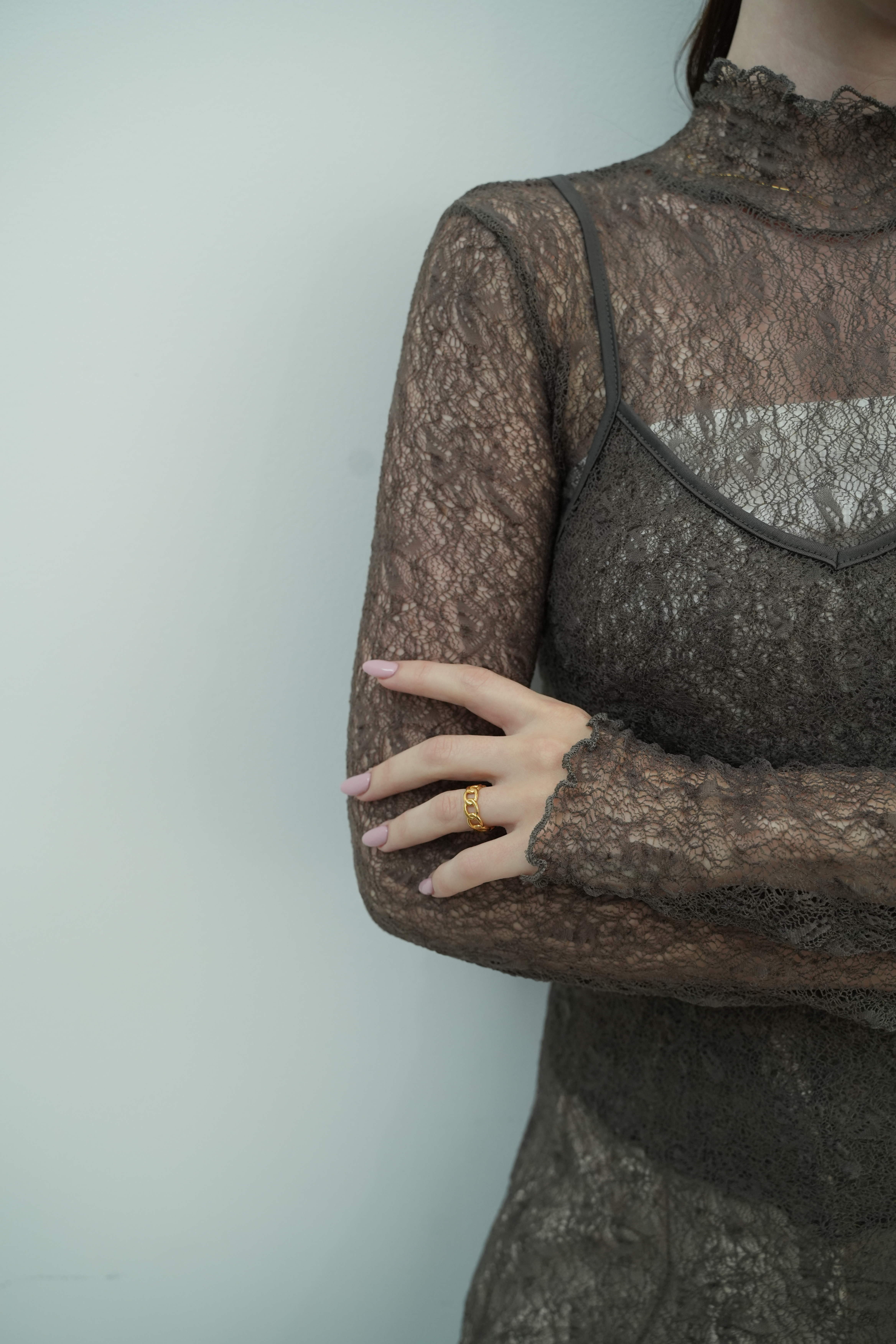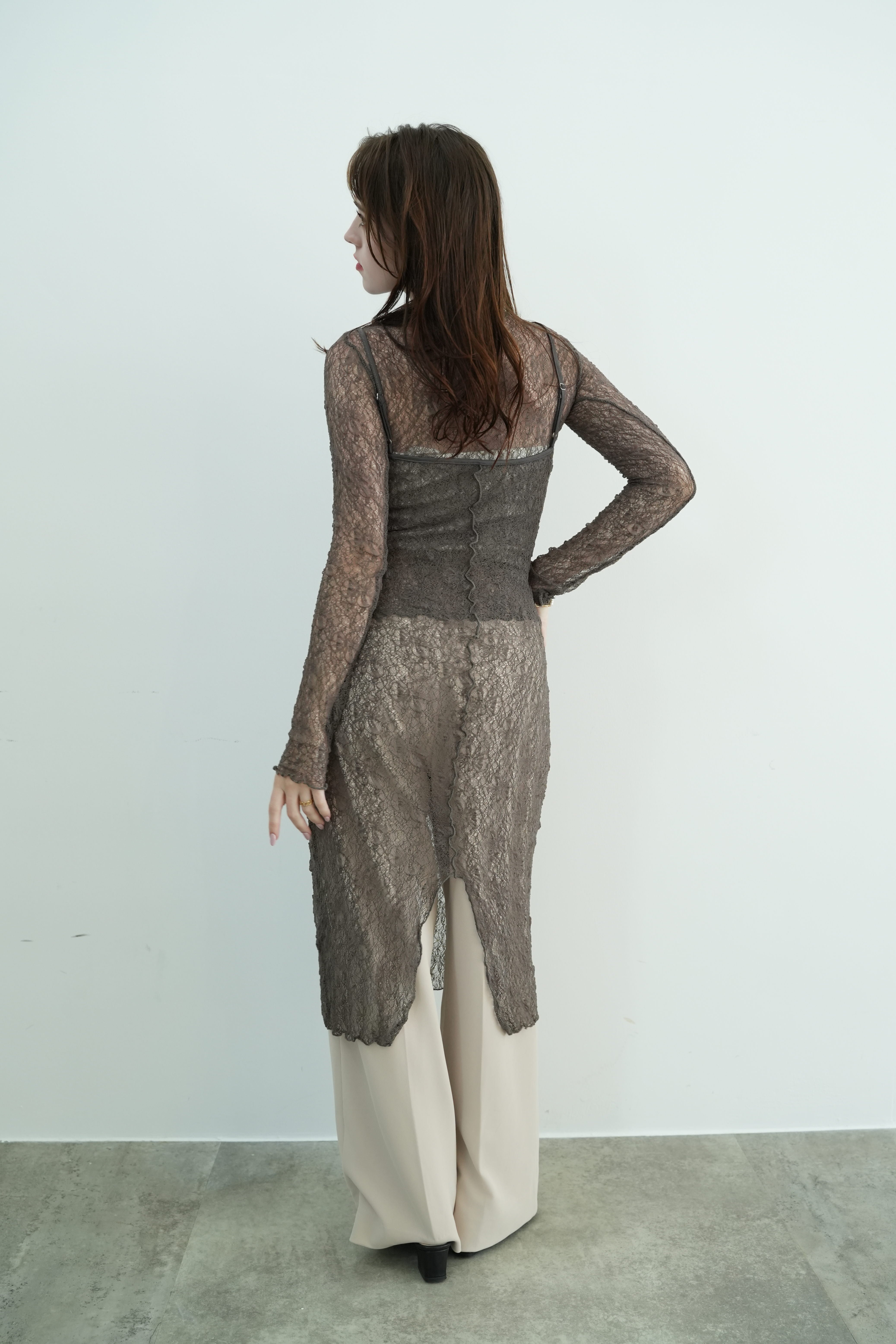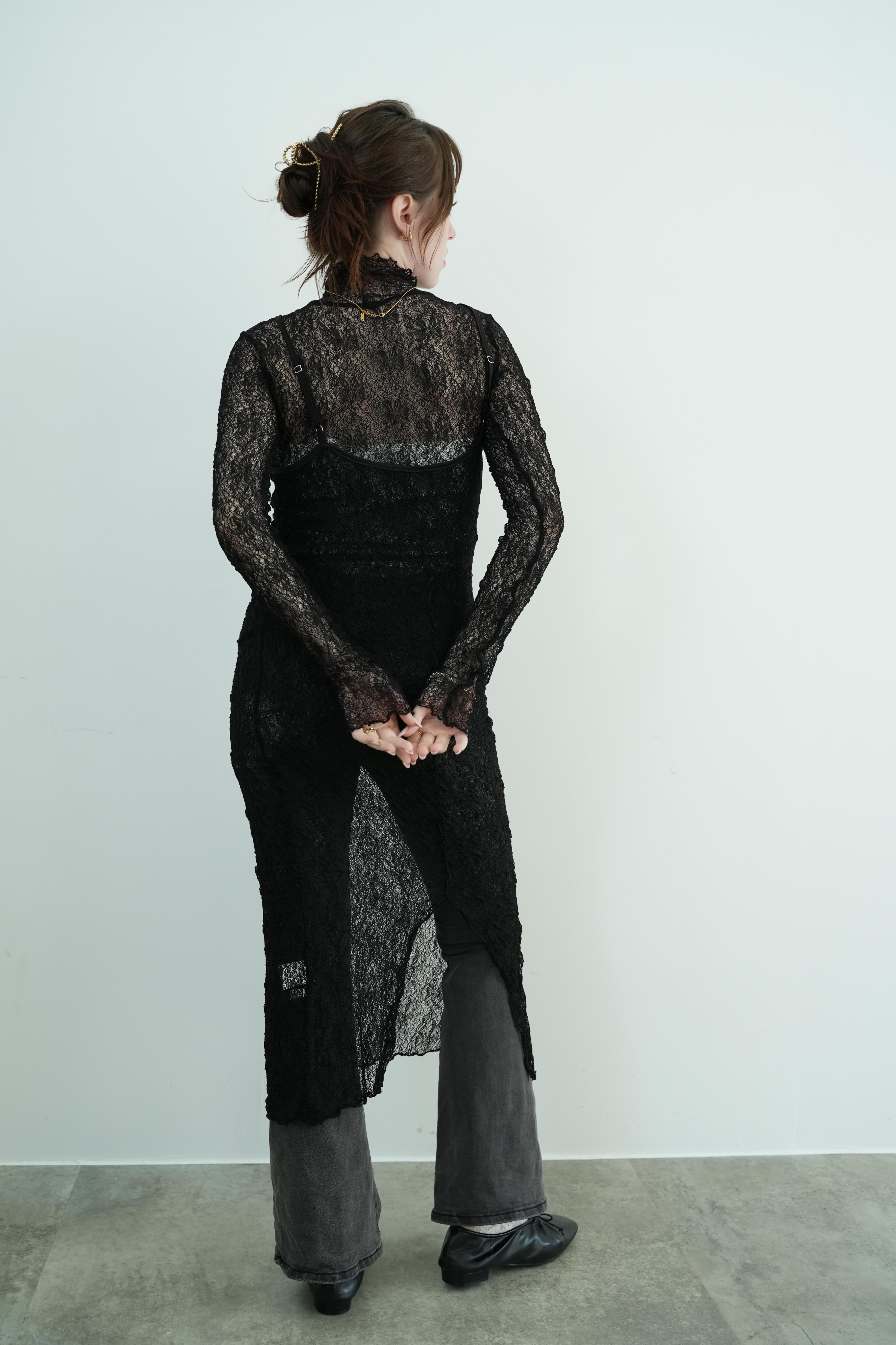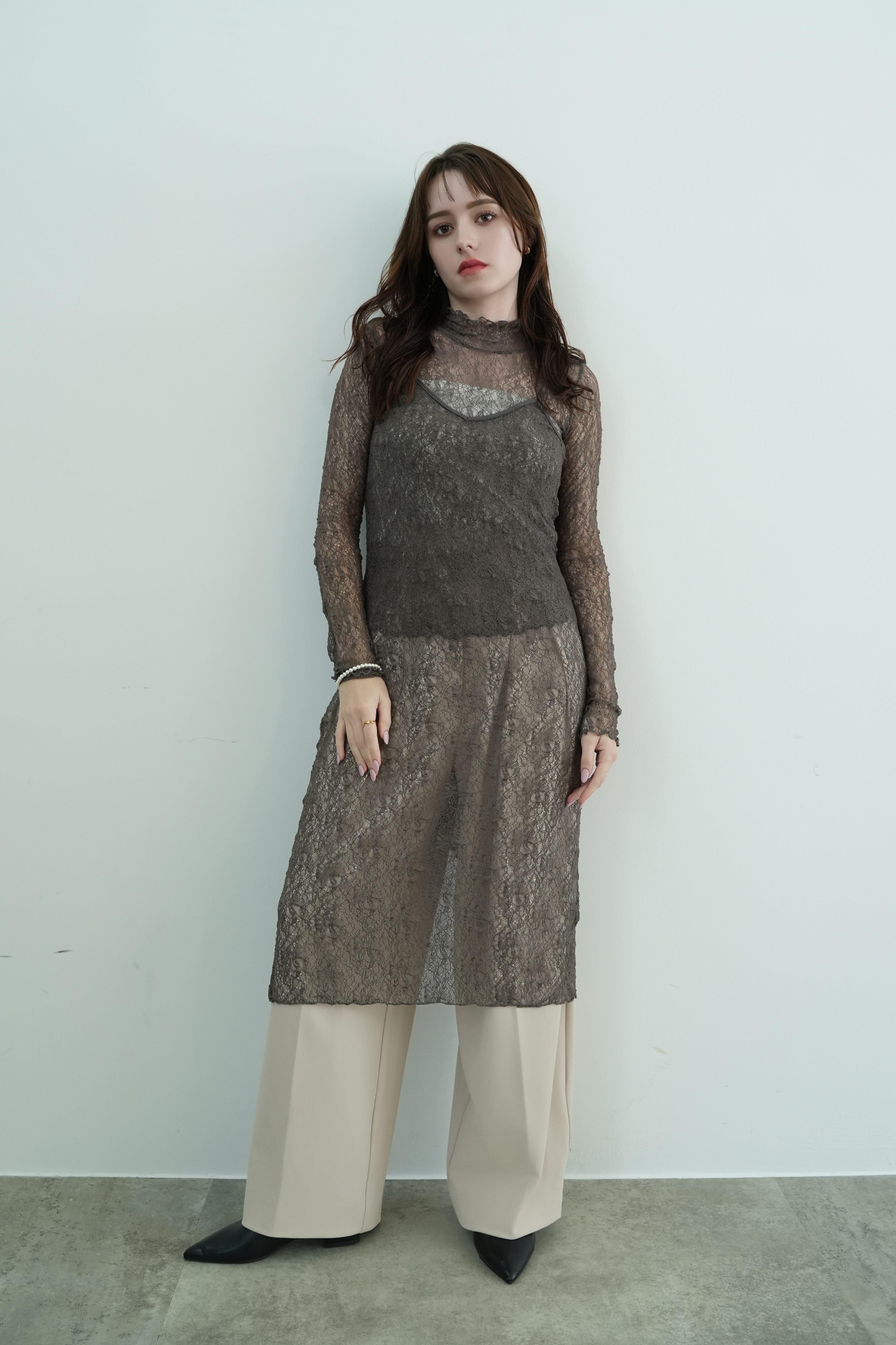 繊細なレースのハイネックトップスと、同素材のキャミワンピースがセットになったレイヤードアイテム。シアー感と立体感のあるデザインのレースが、装いにニュアンスと奥行きを与えます。ワンピースはヒップ下までの絶妙な丈感で、パンツとのレイヤードにも最適。トップス単体でも、タートルとしてインナー使いができる万能さが魅力です。透け感を活かしたスタイリングで、都会的なエレガンスとリラックスムードを両立。旅先や週末のお出かけスタイルを、ぐっと洗練させるセットアイテムです。
