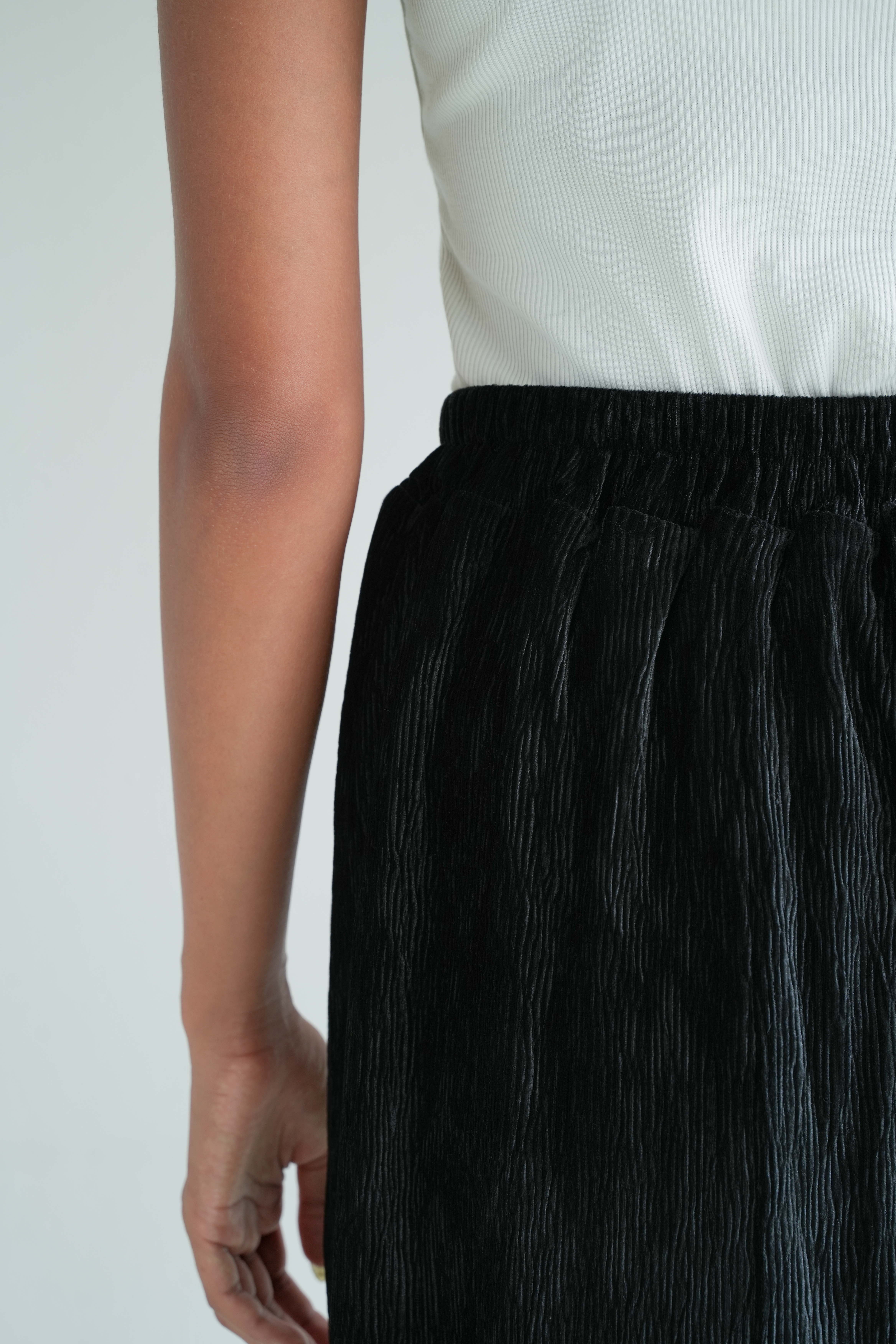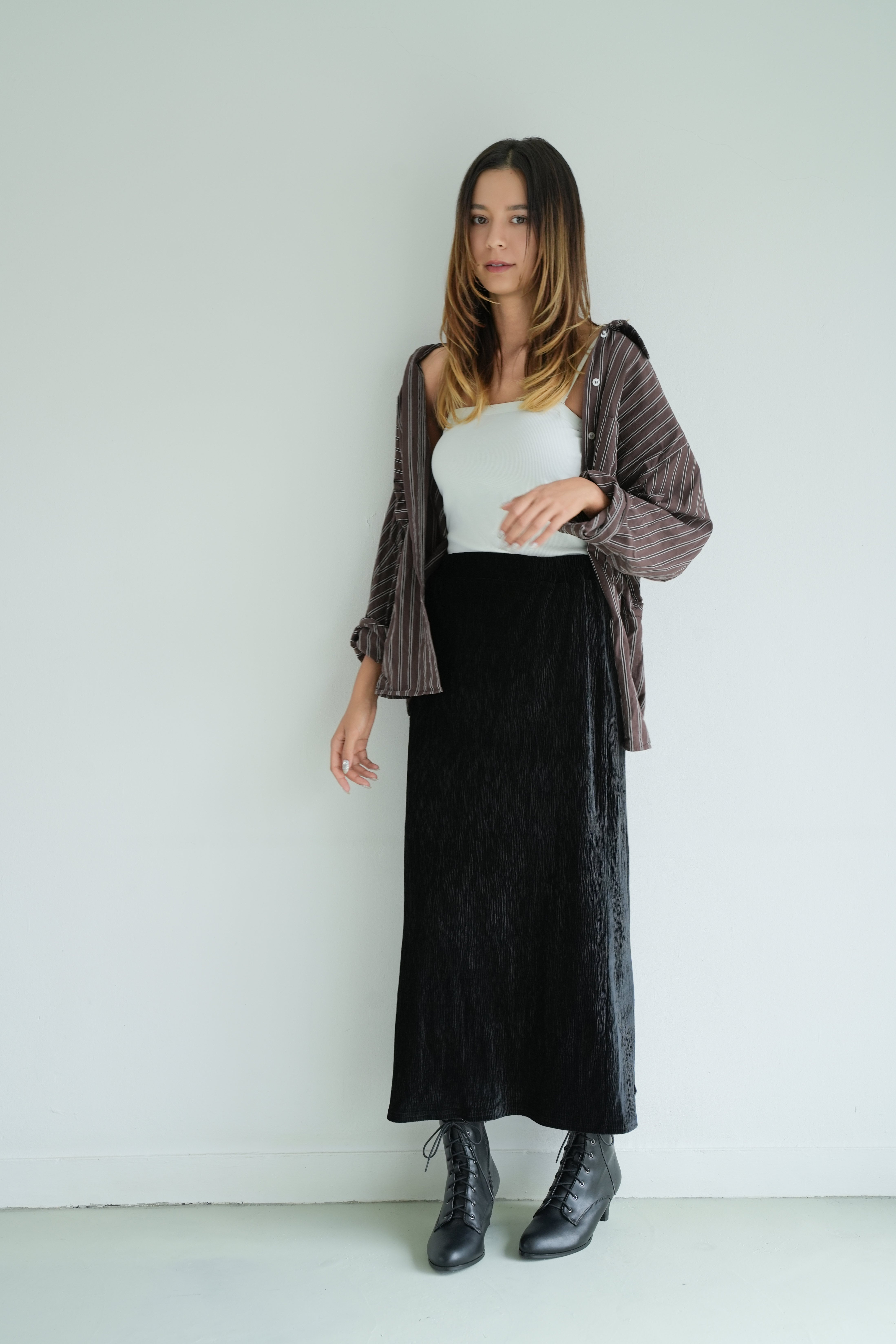 ベロアの光沢と陰影が美しい、ロゼらしい洗練を纏ったロングスカート。わずかに立体感のあるベロア素材が、歩くたびに柔らかなニュアンスを演出します。程よく体のラインを拾うストレートシルエットで、縦のラインを強調しつつ、バックにはスリット入りで足さばきも快適。トップスをインすることで美しいバランスに仕上がり、ブラウスやニット、カットソーなどどんな素材とも好相性。カジュアルにもドレスアップにも活躍する、タイムレスな一着です。