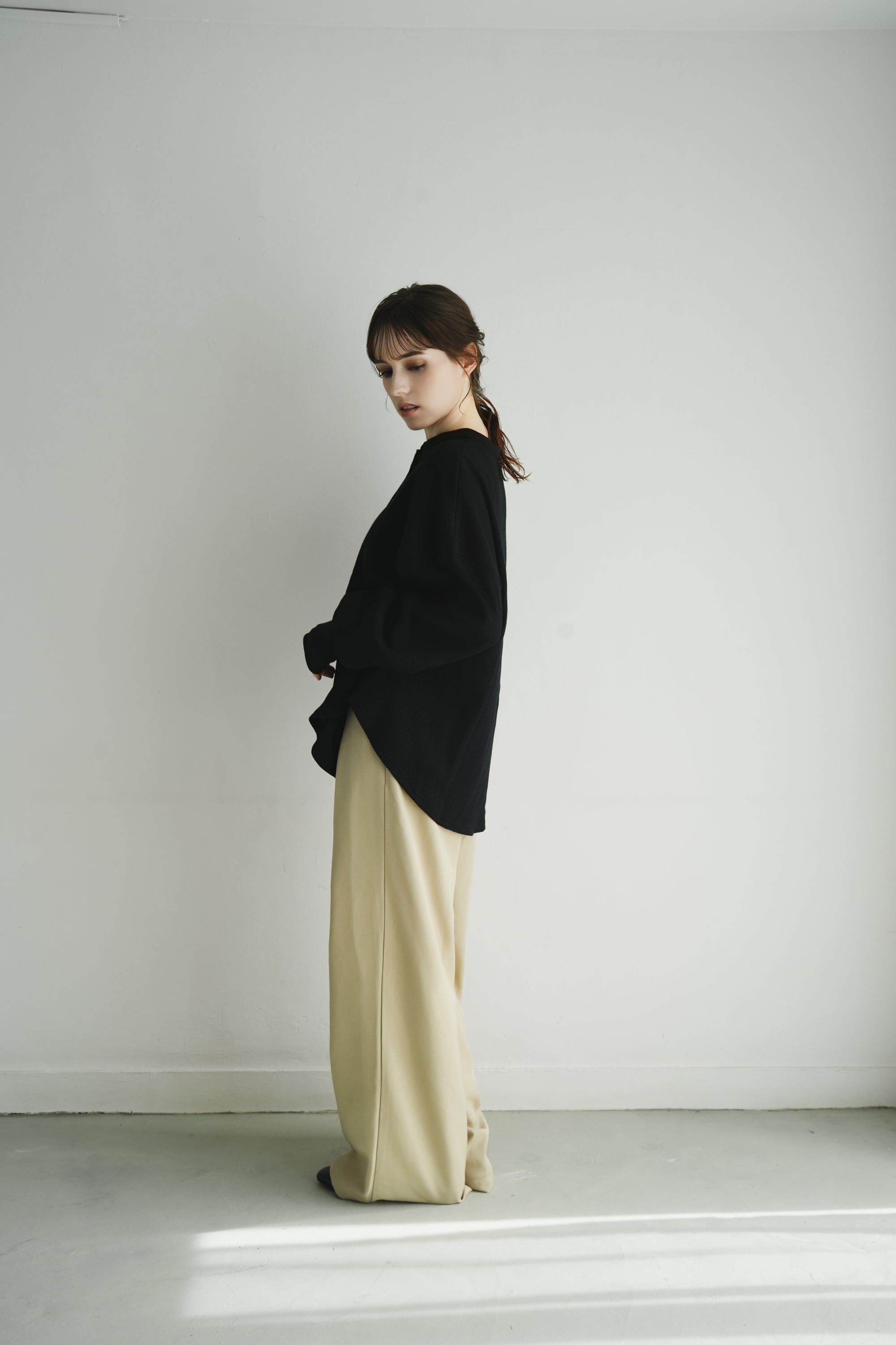 フロントの小さめボタンが程よいアクセントになり、単調にならずに視線を引き寄せるデザイン。サイドにかけてボリュームのある裾がスタイリングに動きを生み、ワイドパンツやロングスカートとも好相性。シンプルだからこそ、ワードローブの定番として長く愛せる一着です。