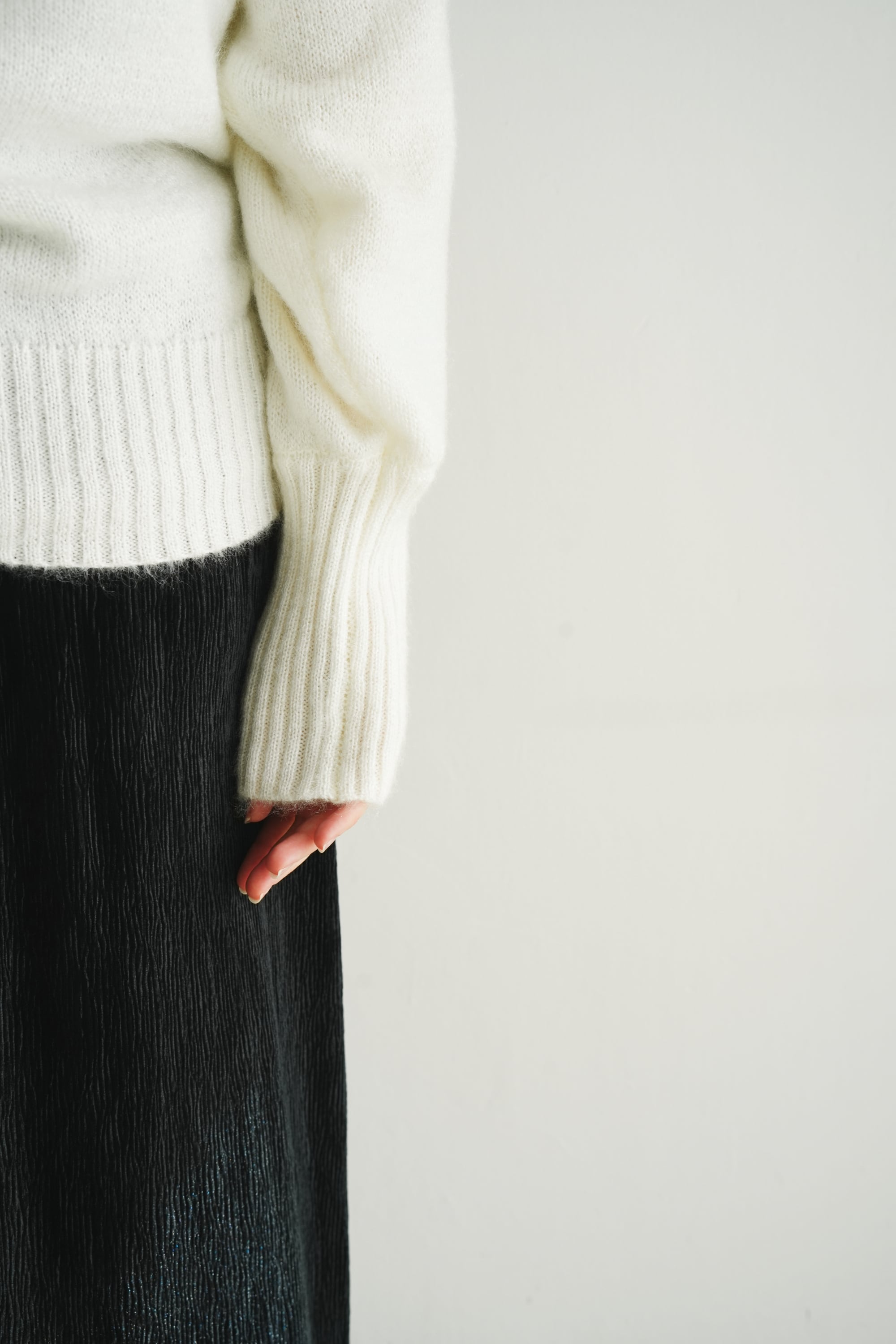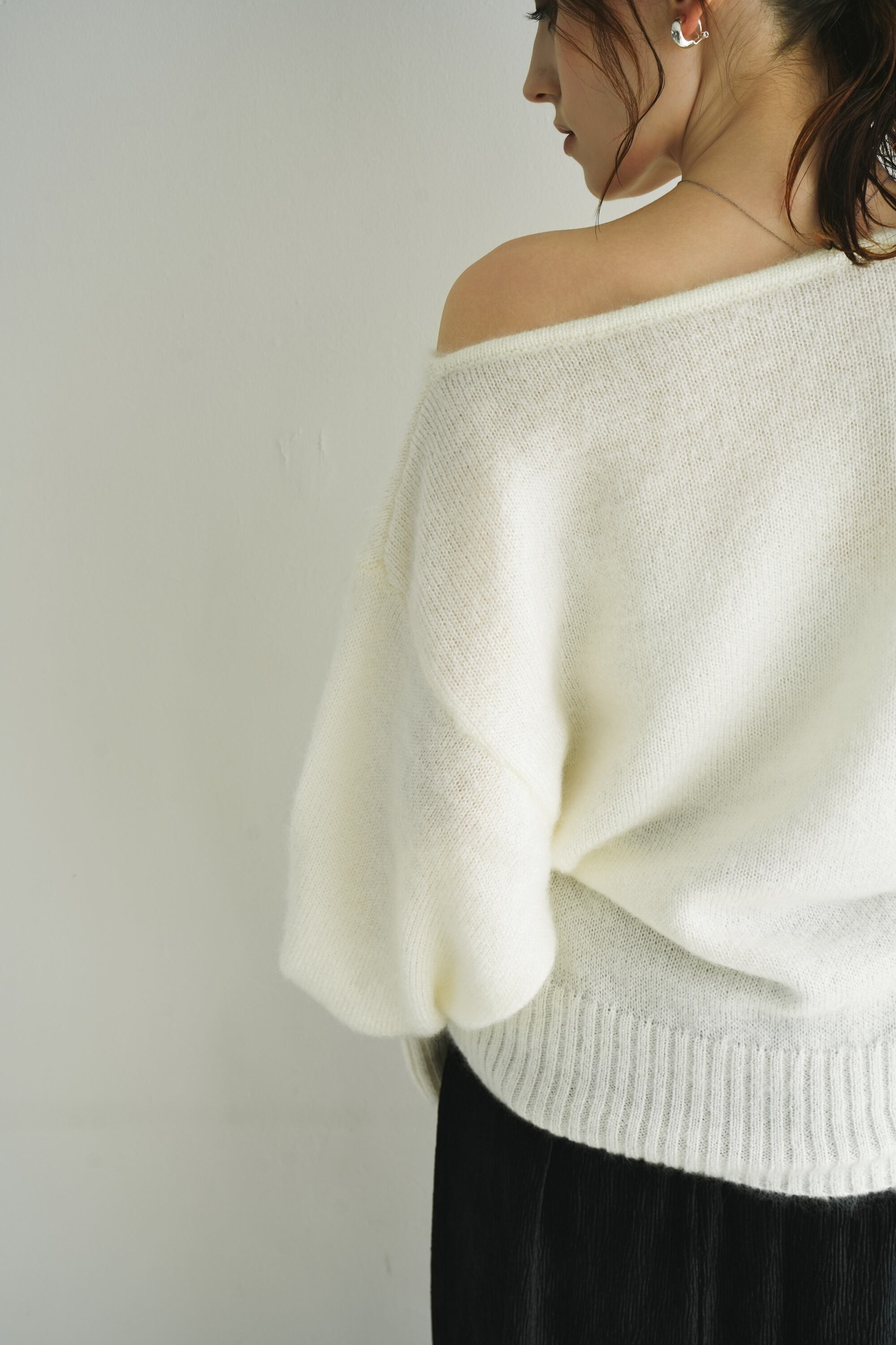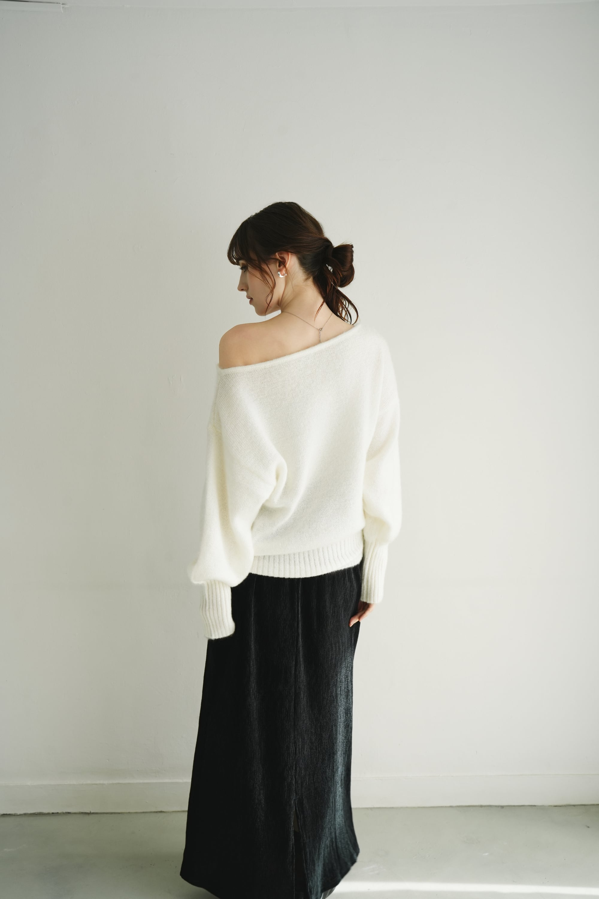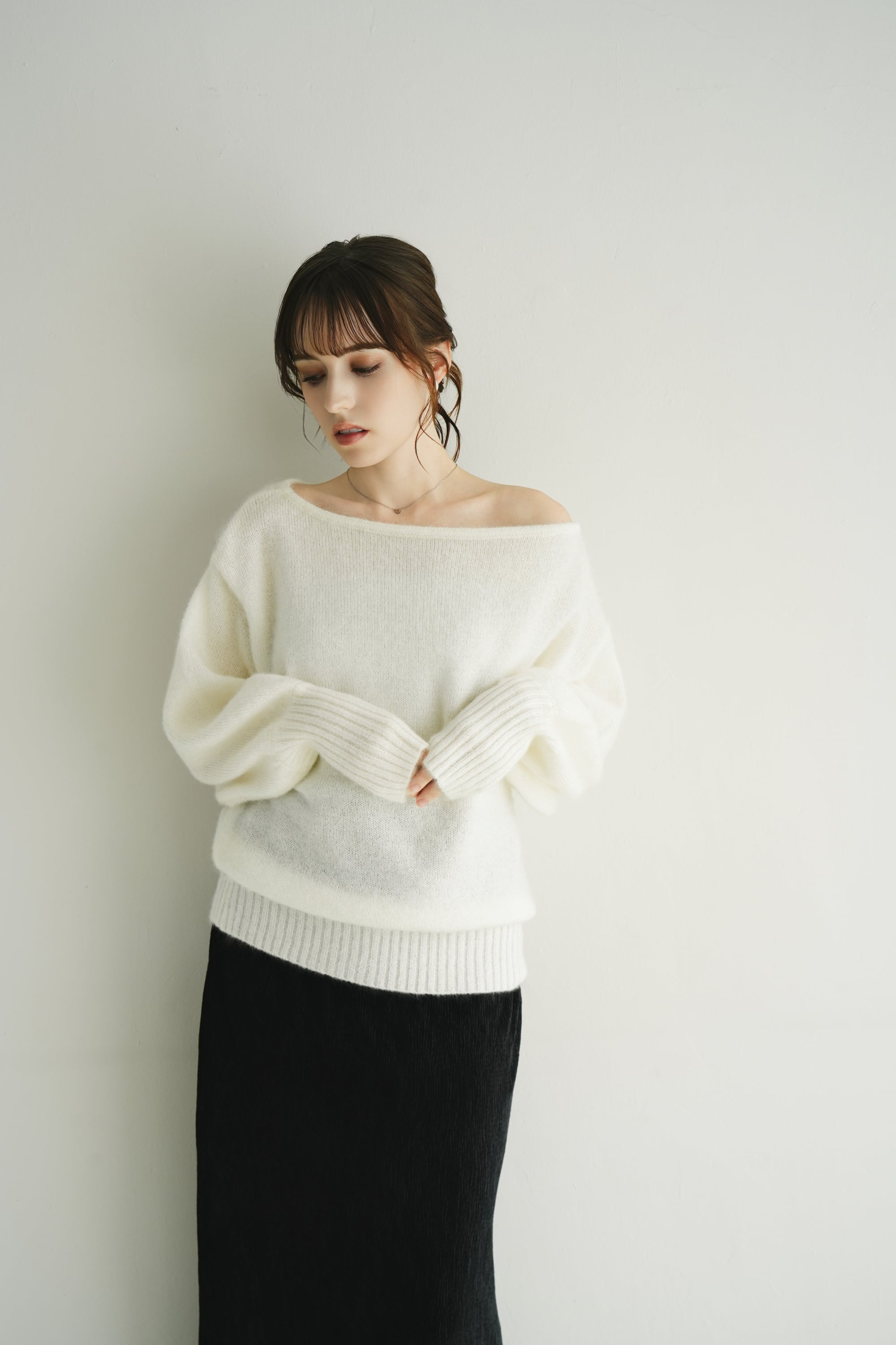 ふわっと柔らかな質感と、女性らしい肌見せが絶妙に調和したオフショルダーニット。
