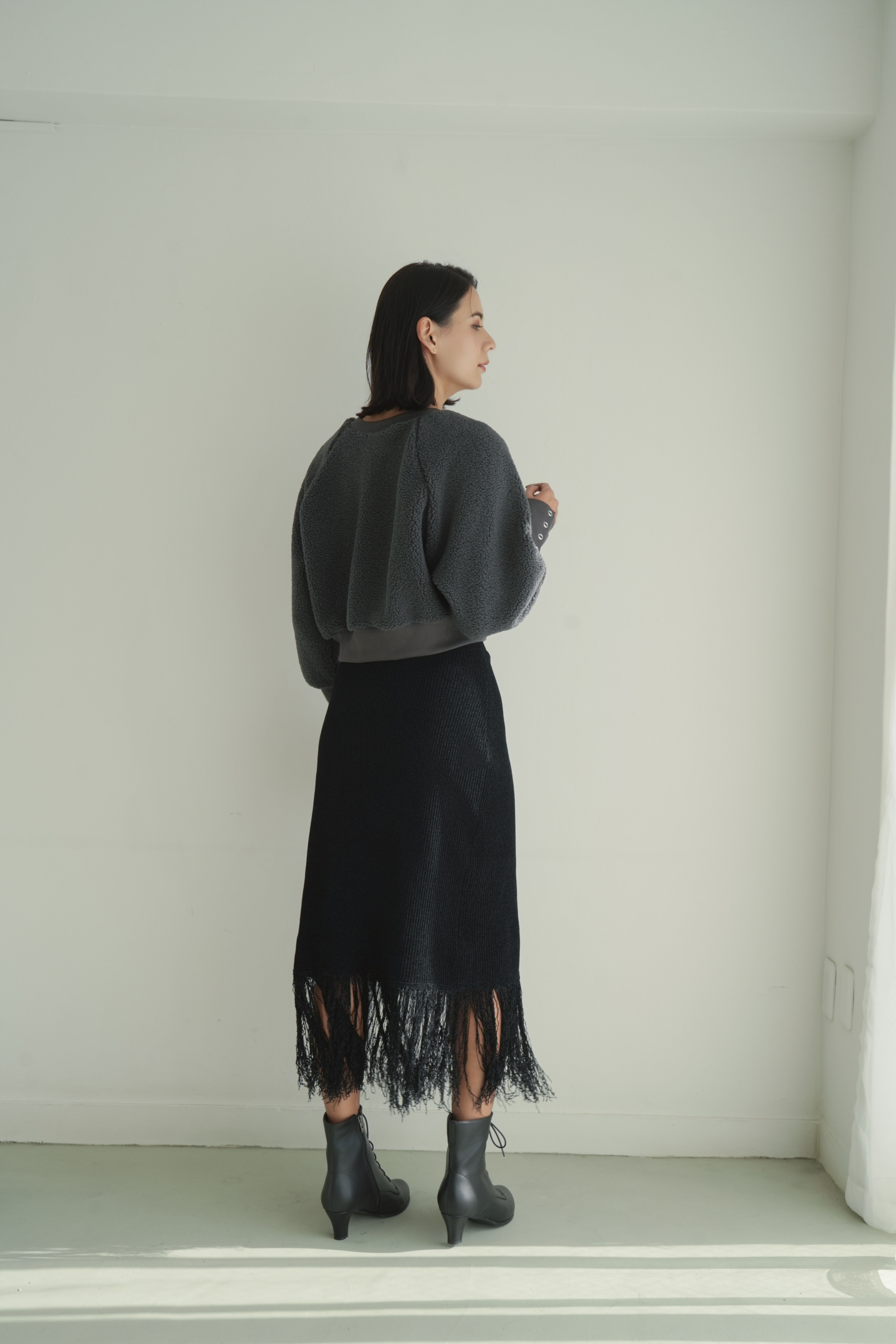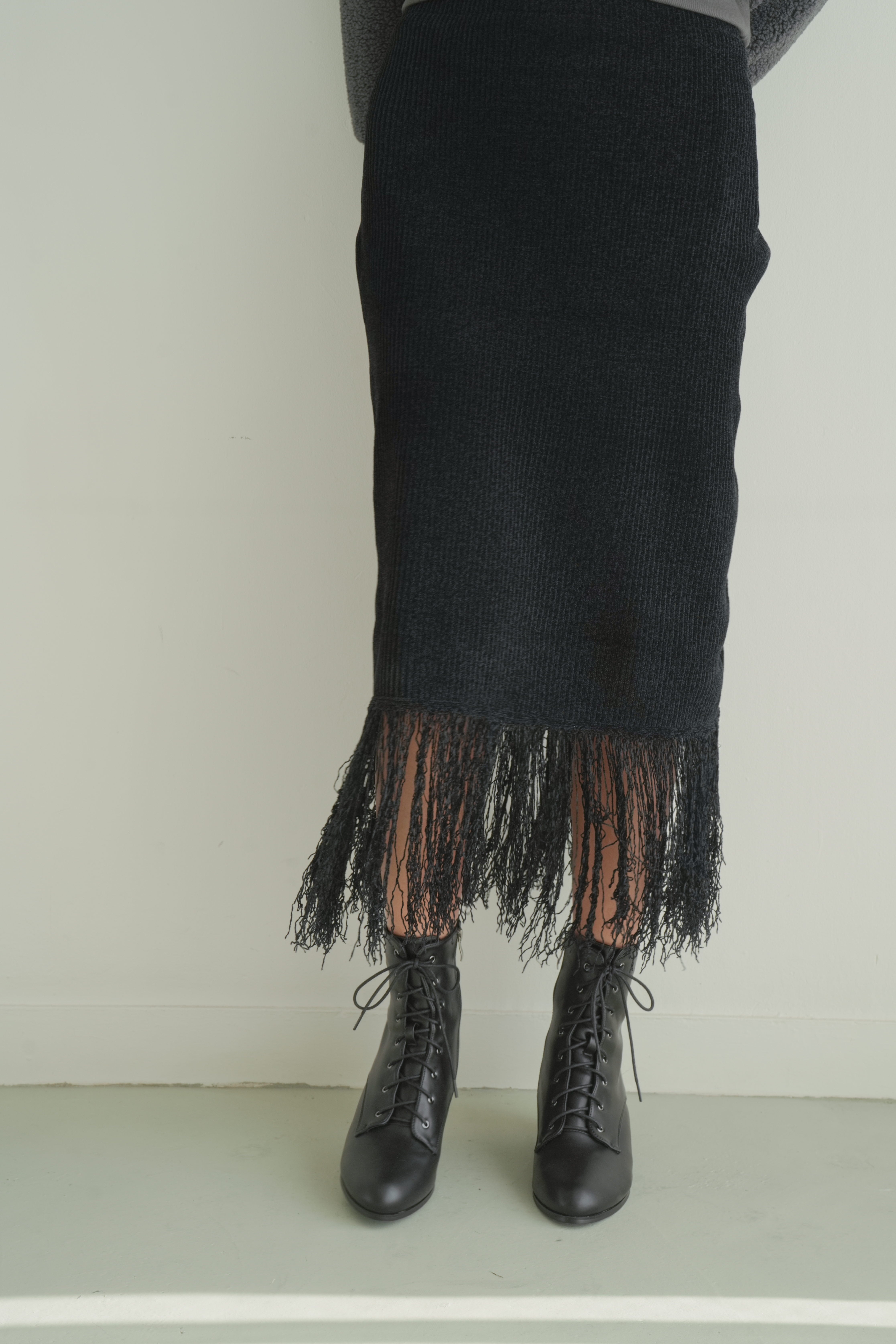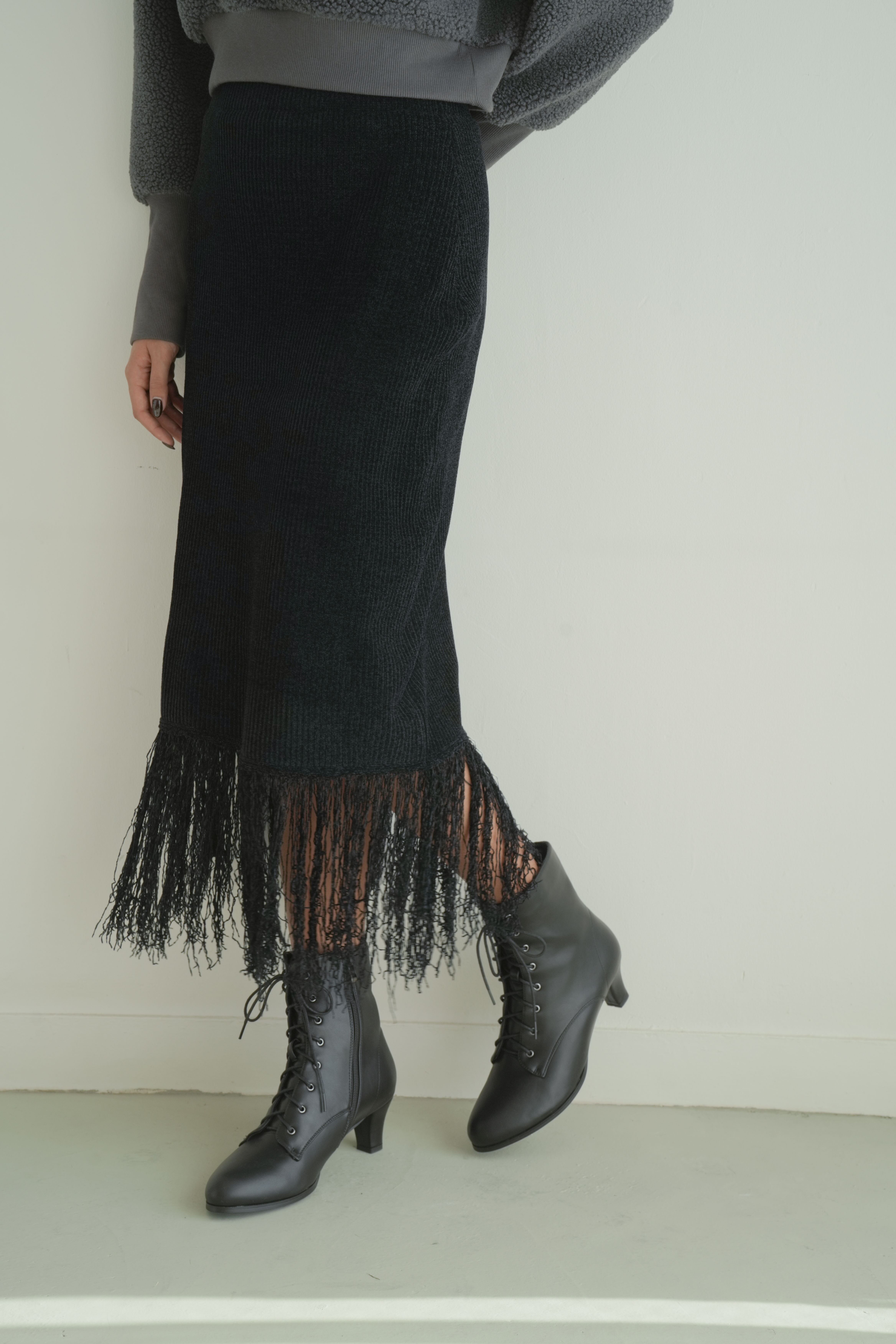 縦長のリブ編みが美しい表情を生む、フリンジ付きニットスカート。腰回りはすっきりと、裾にはたっぷりのフリンジがあしらわれており、動きのあるデザインが魅力です。フィット感のあるリブ素材が体のラインを程よく包み込み、縦のラインが強調されることでスタイルアップも実現。ブラックでもリブの陰影とフリンジの揺れが軽やかさを演出します。タイムレスなアイテムながら、装いにリズムを与える洗練された1枚です。
