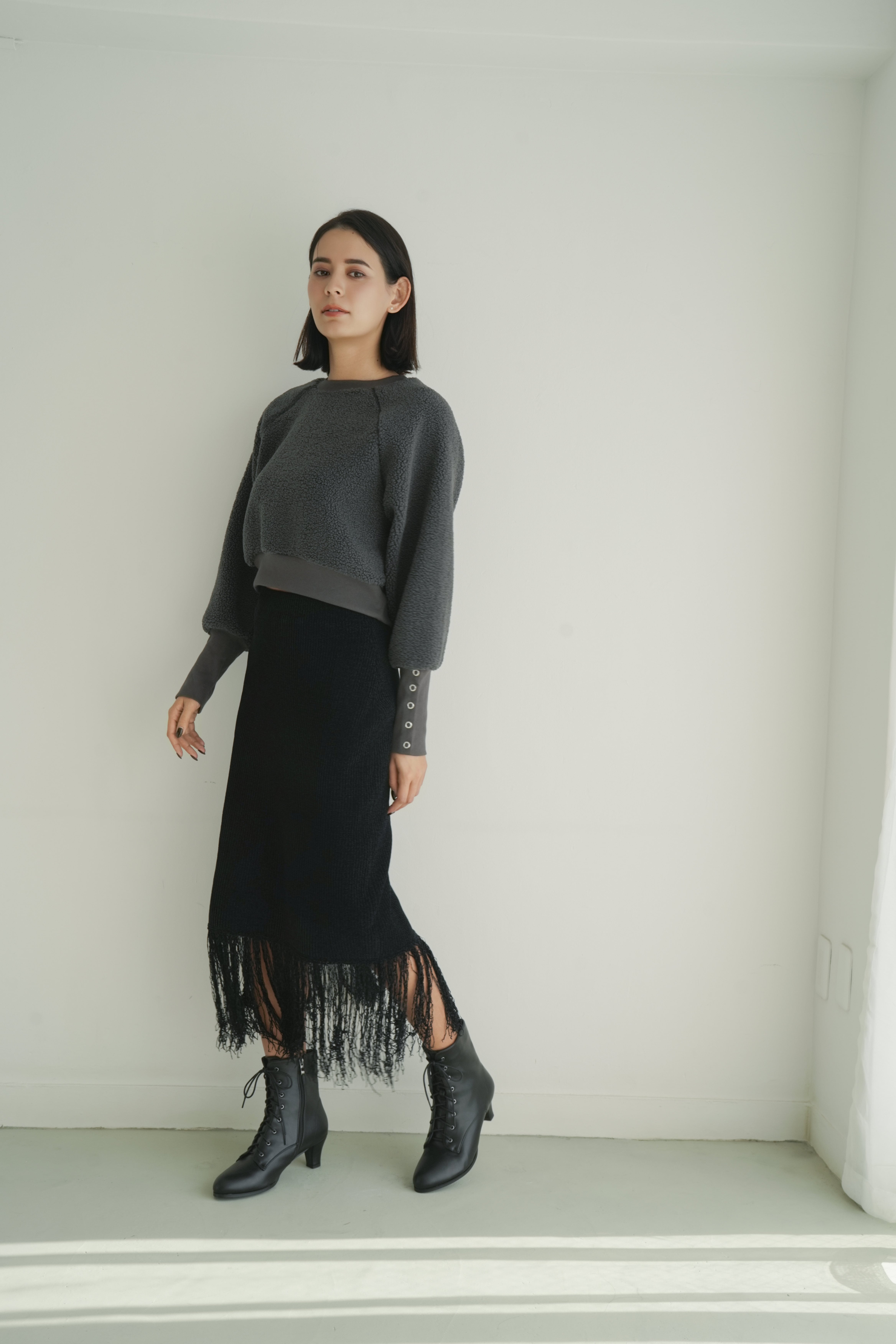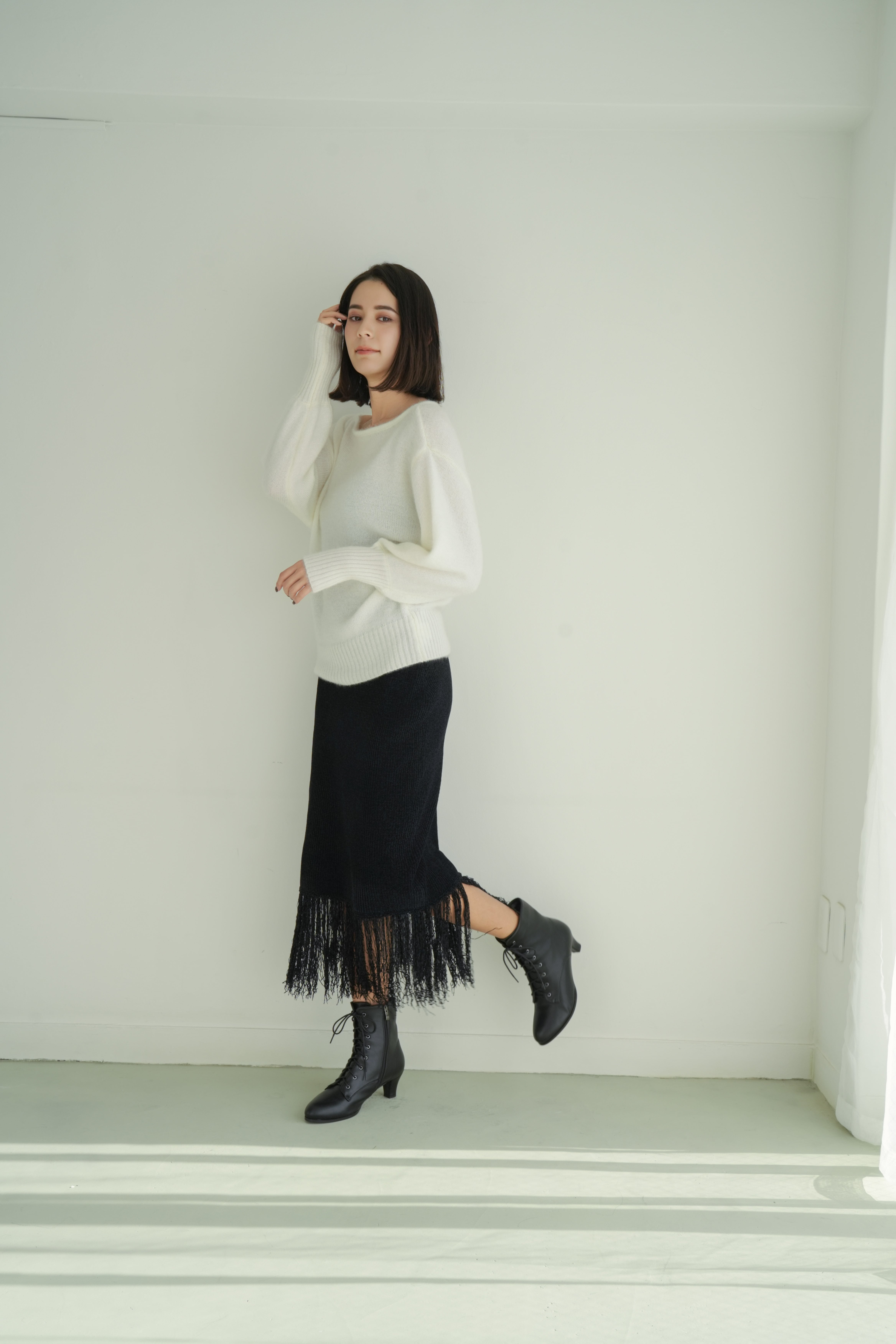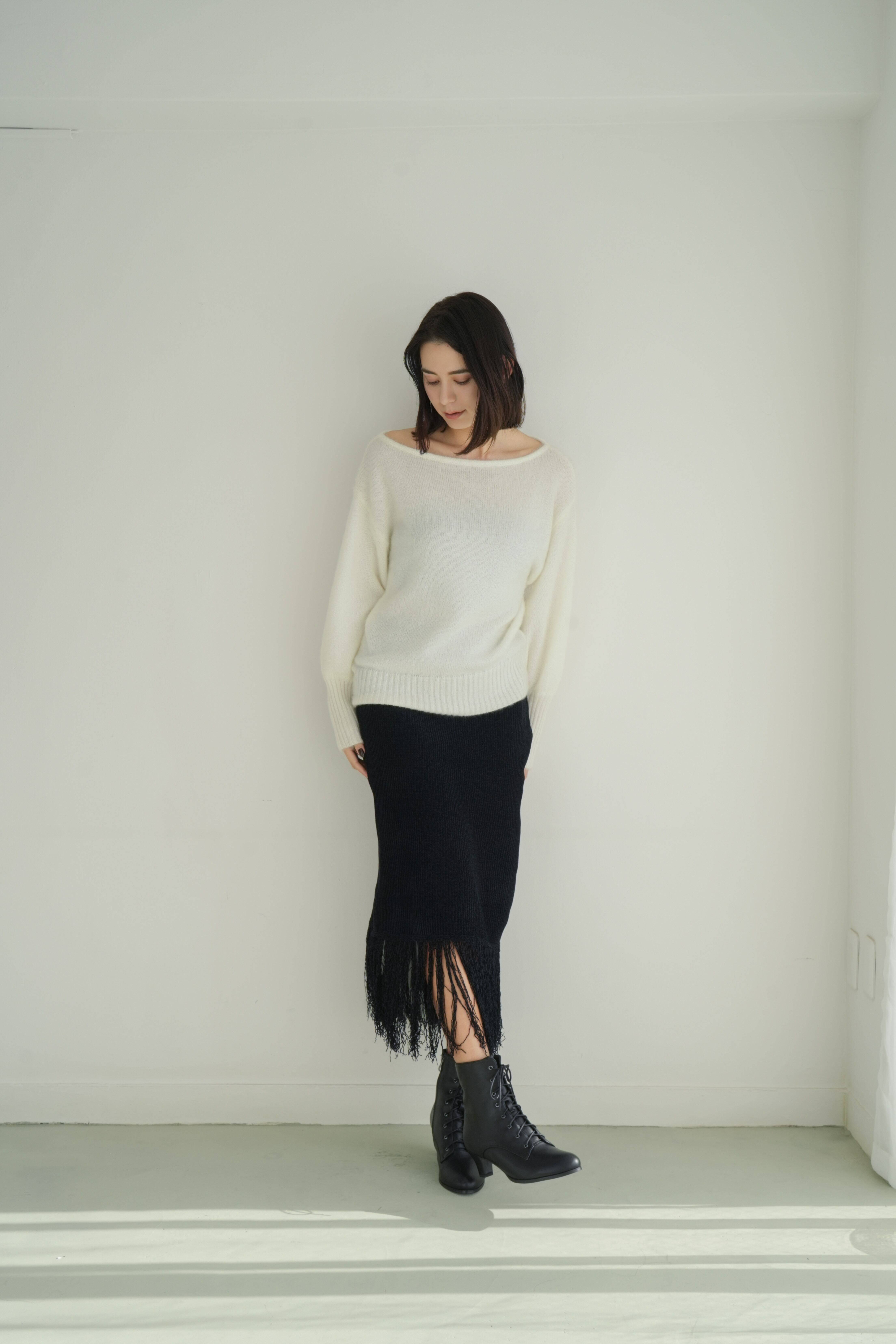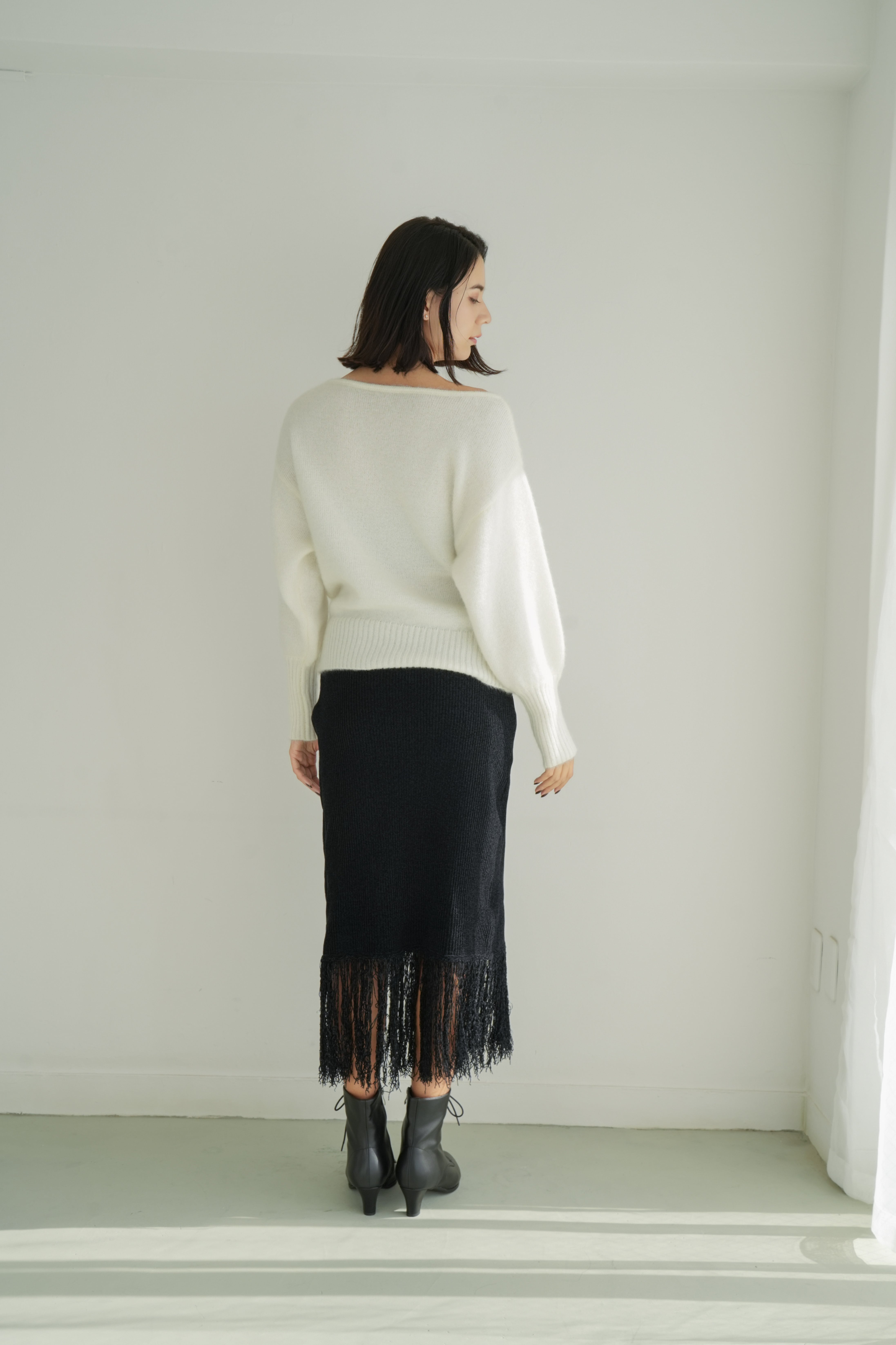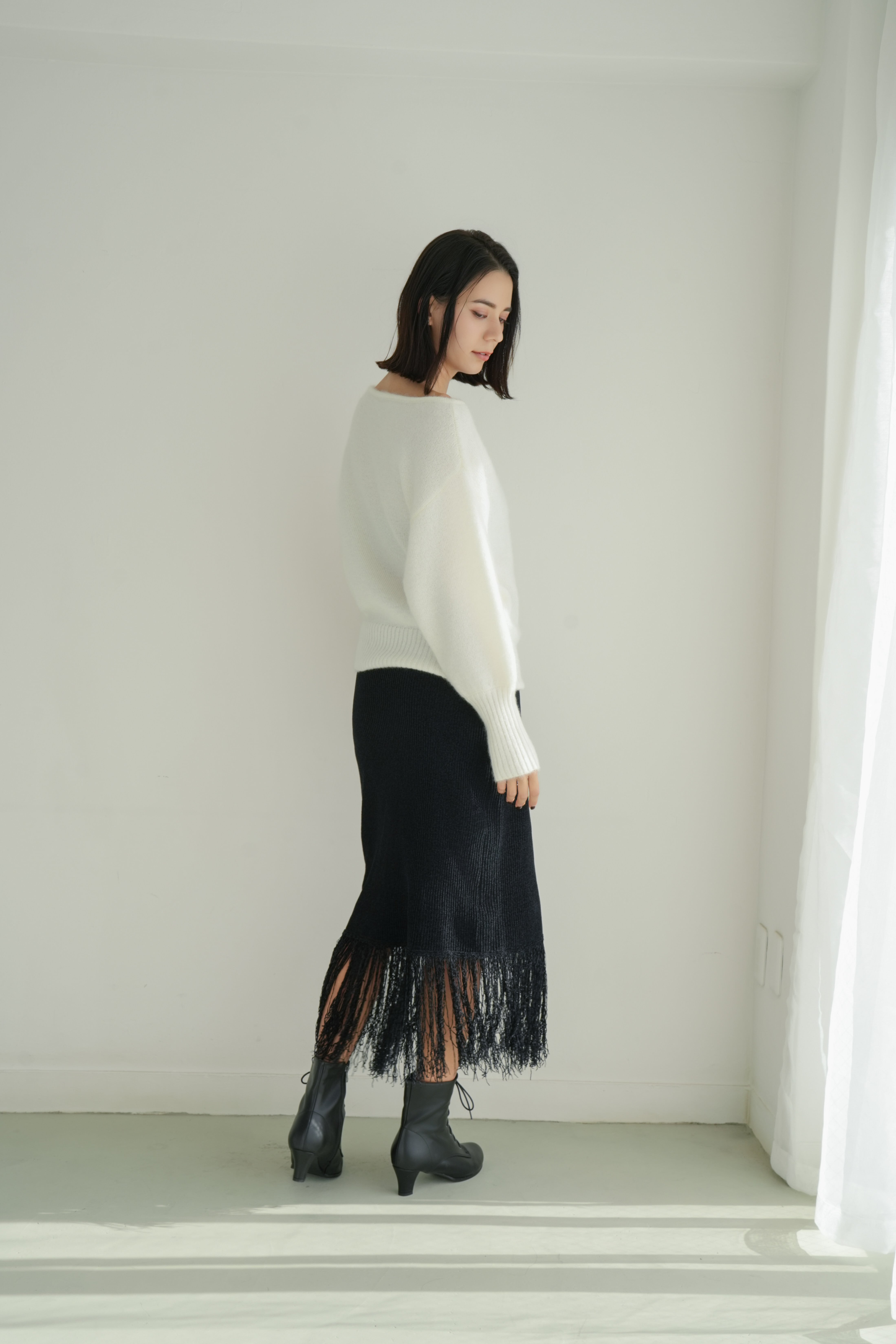 →Iラインシルエットと透け感フリンジで軽やかな印象に