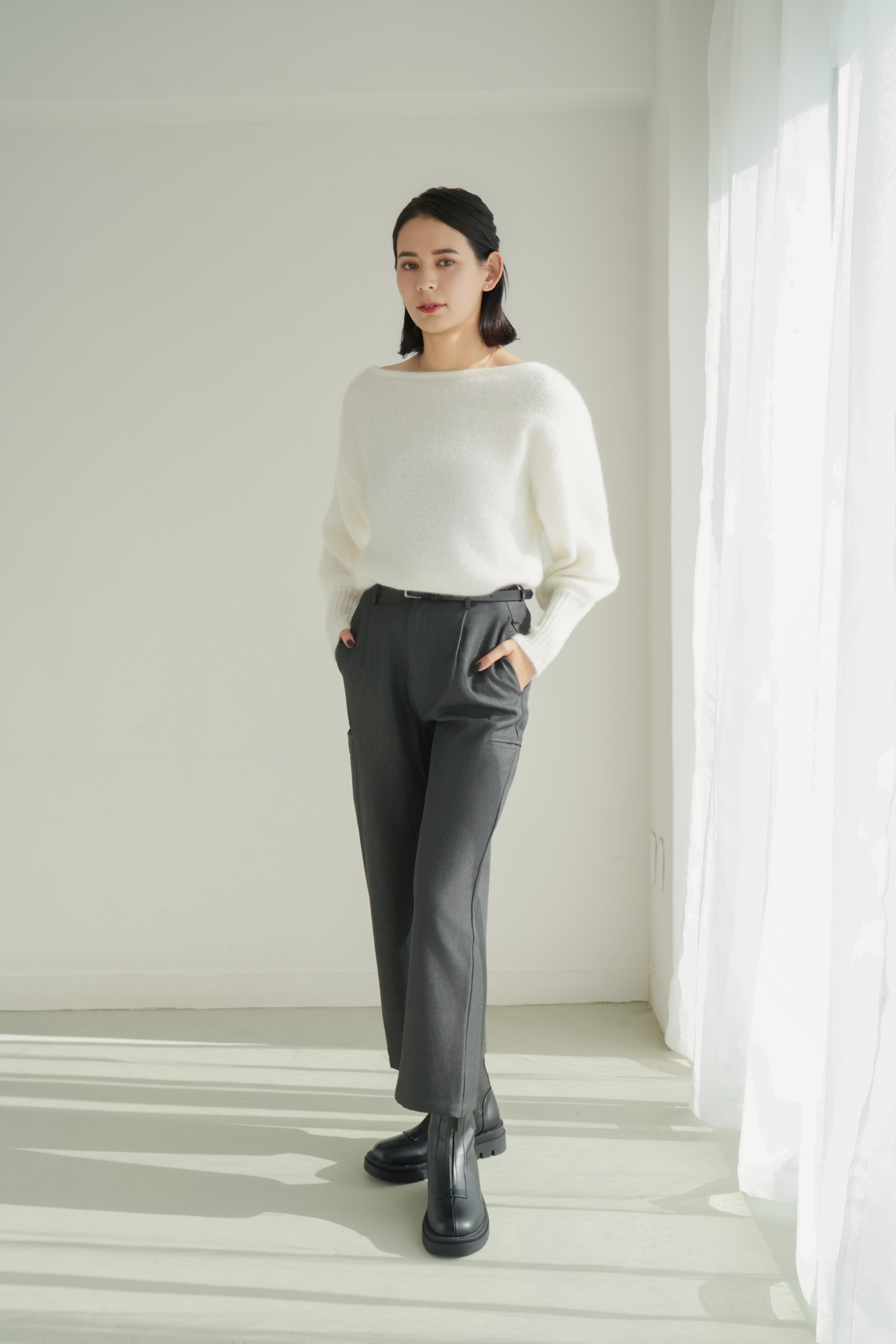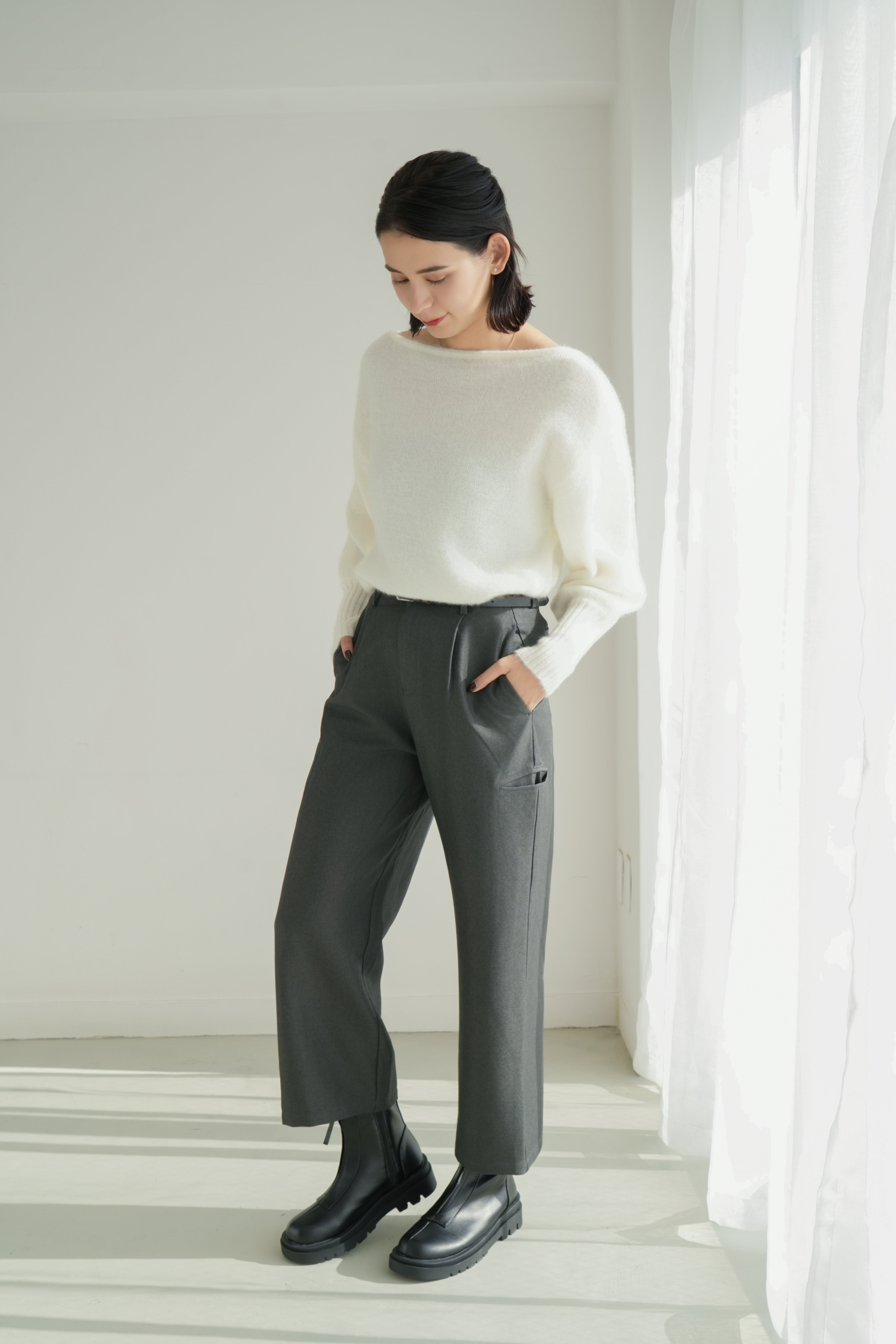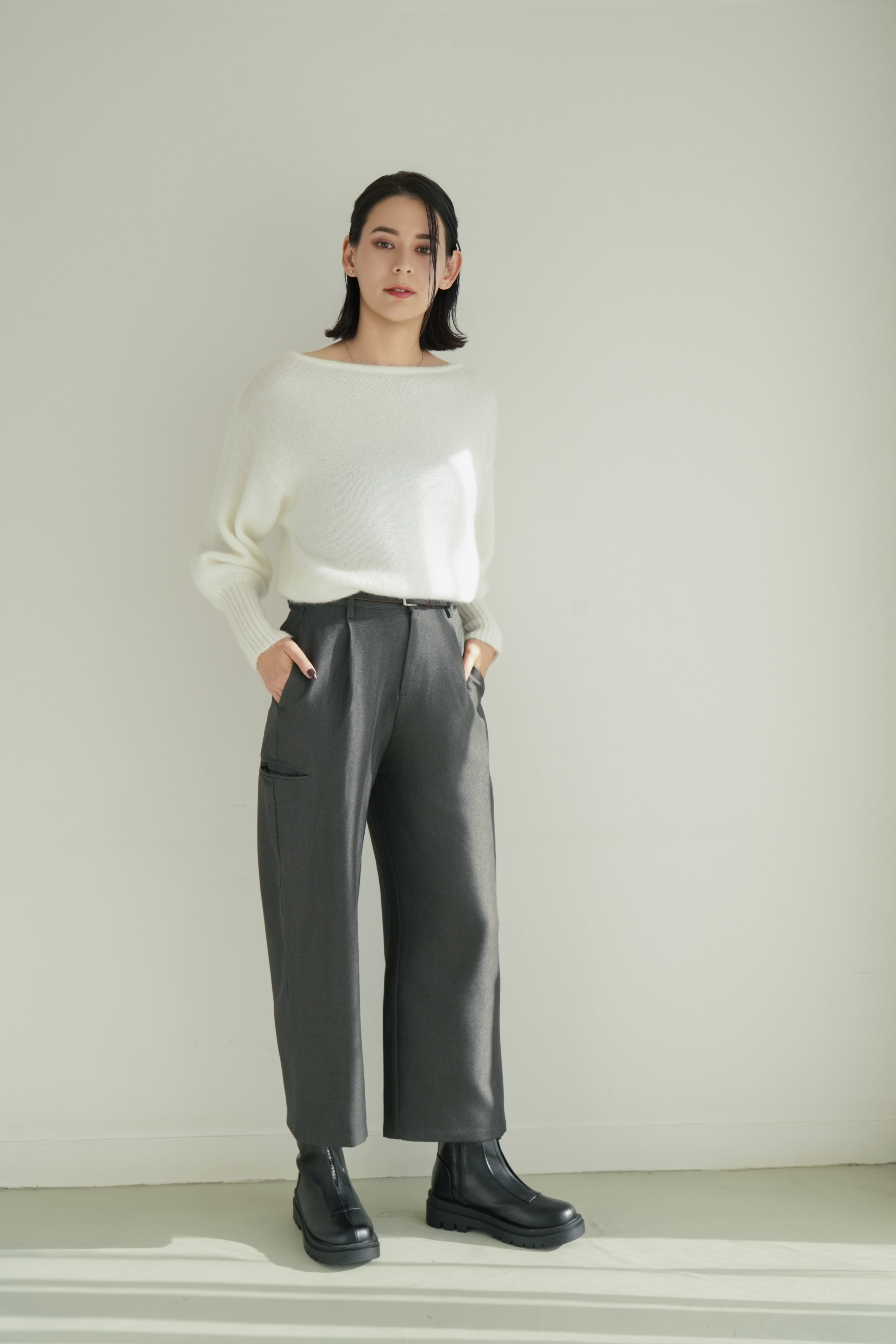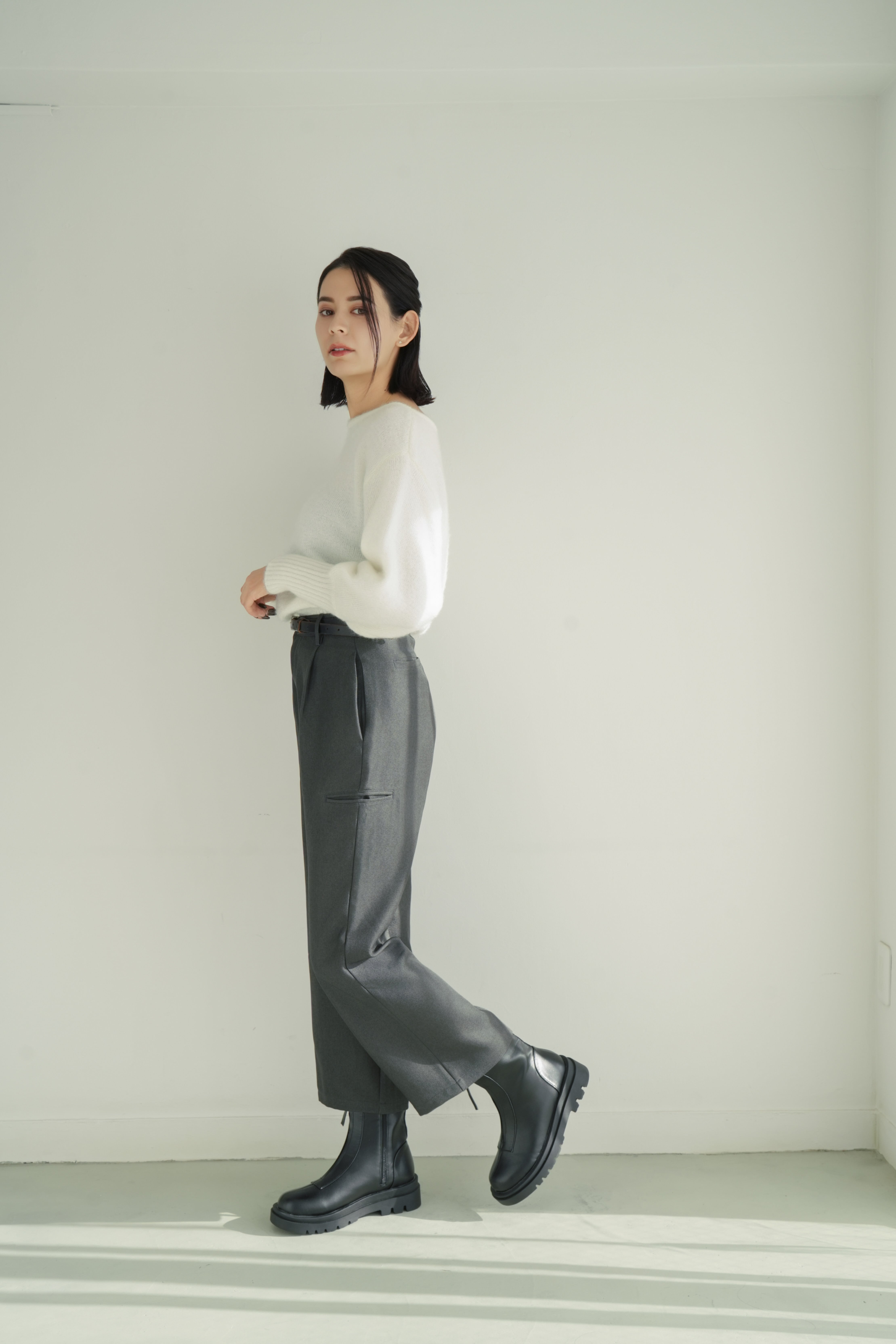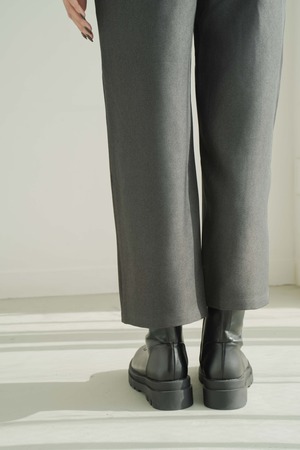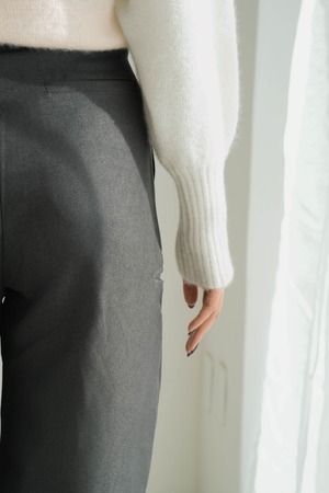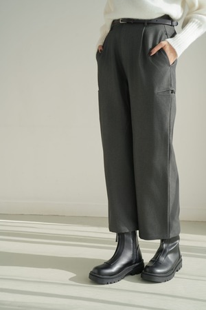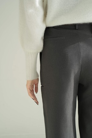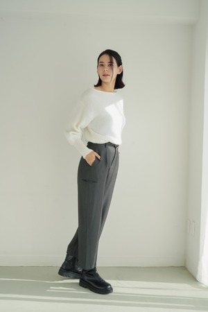 すっきりとしたタック入りのフロントデザインが、美脚ラインを自然に演出。程よい厚みと落ち感のある素材で、秋冬らしい重厚さを感じながらも快適な穿き心地をキープします。