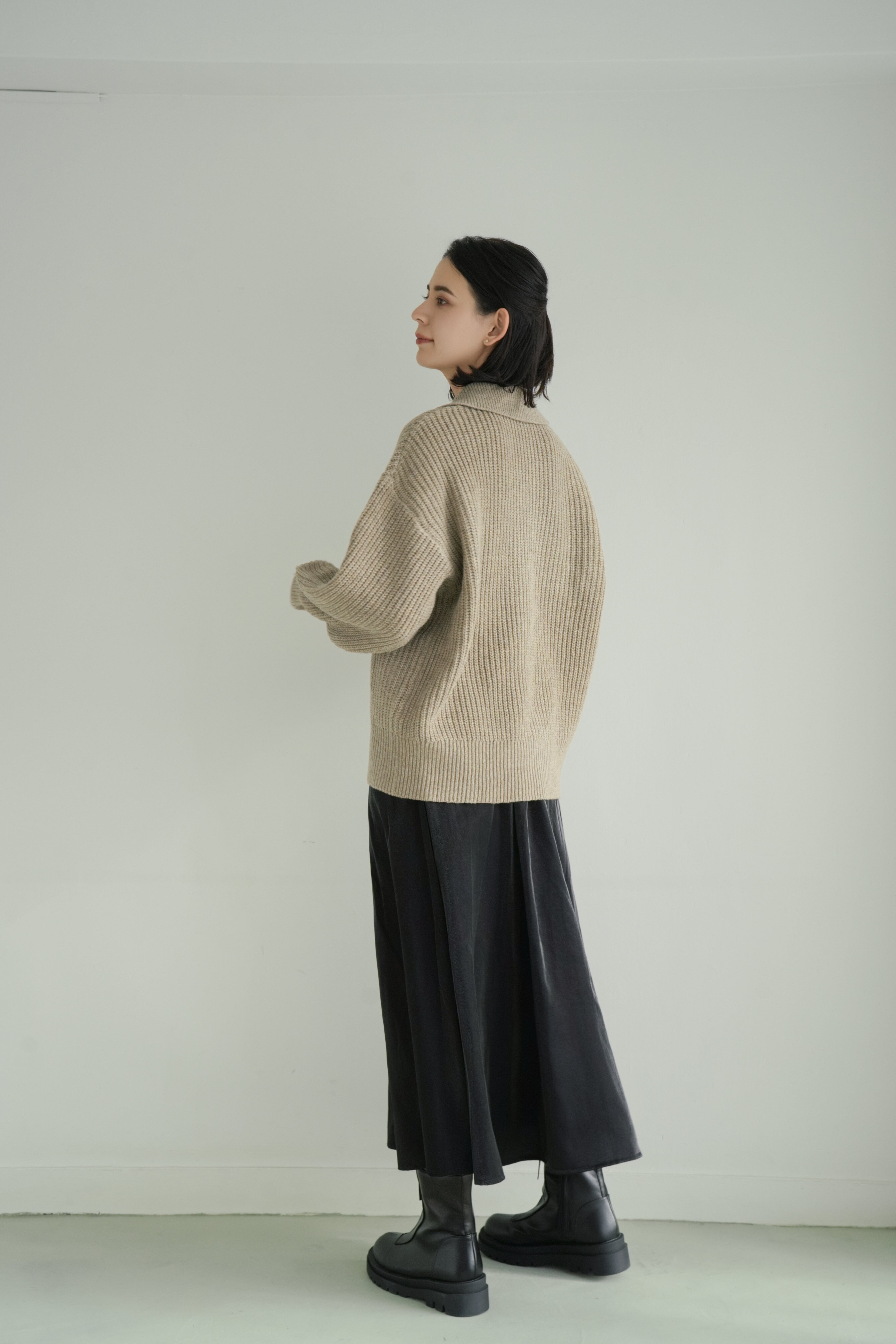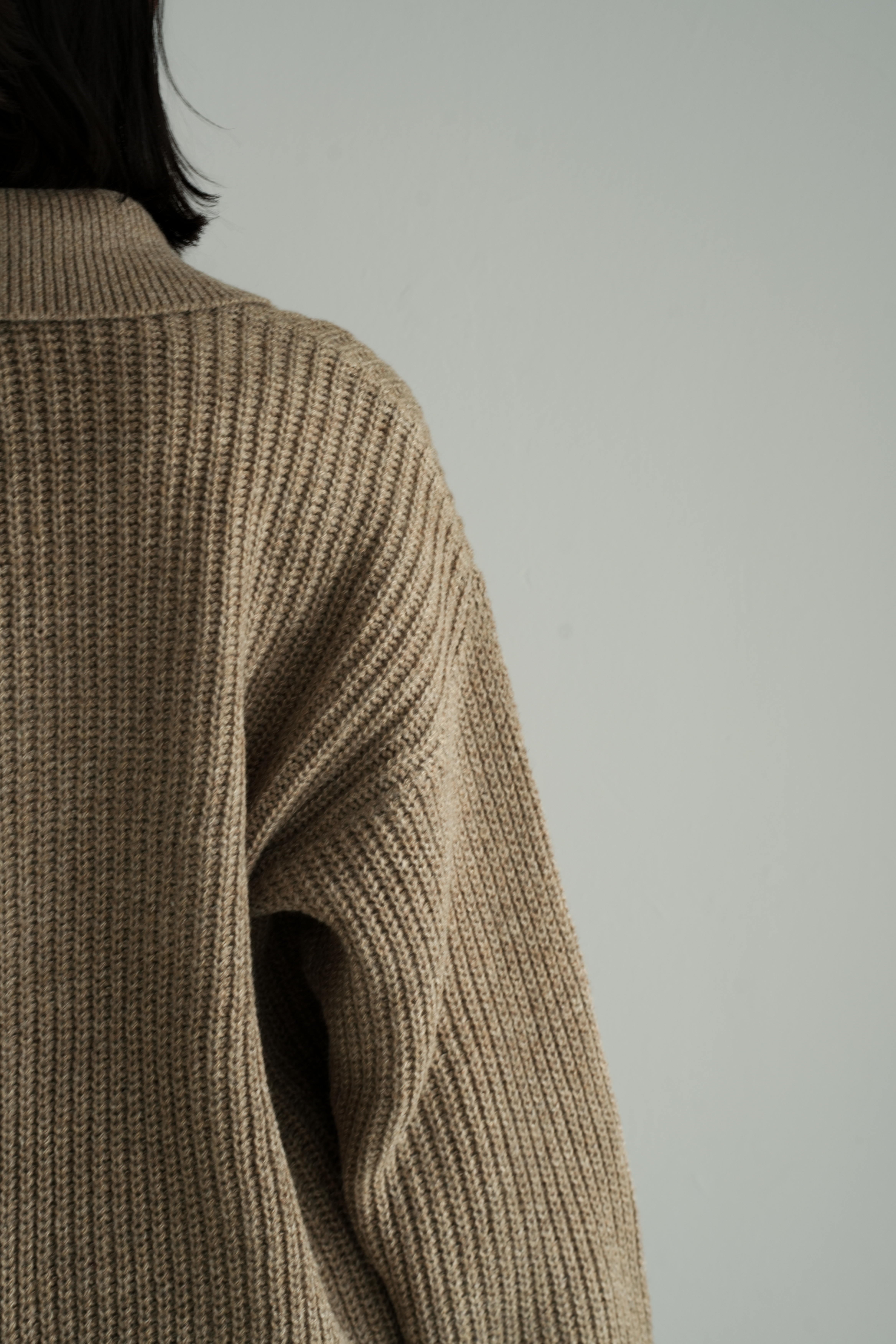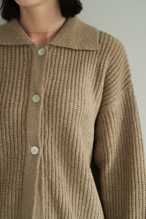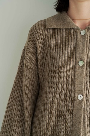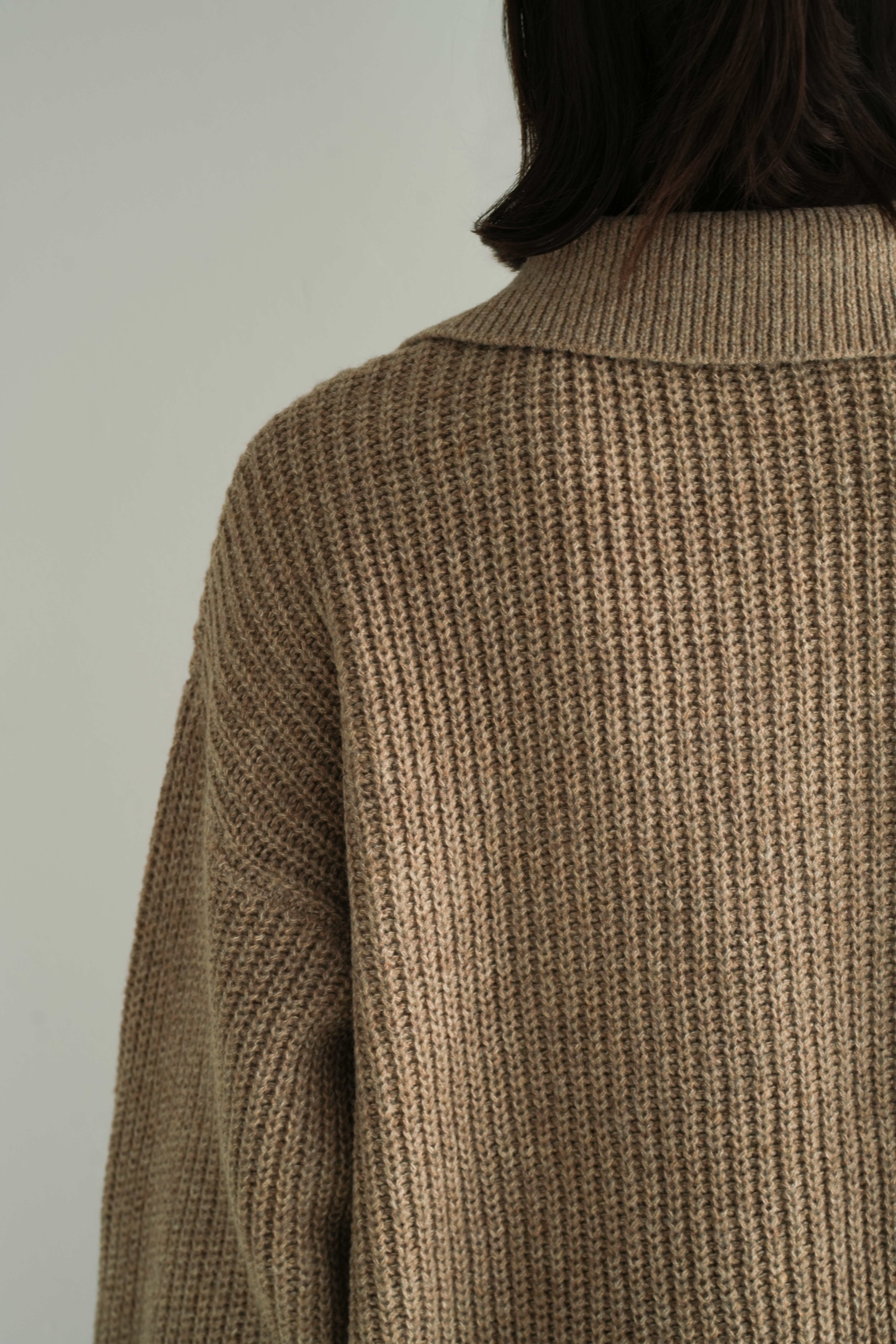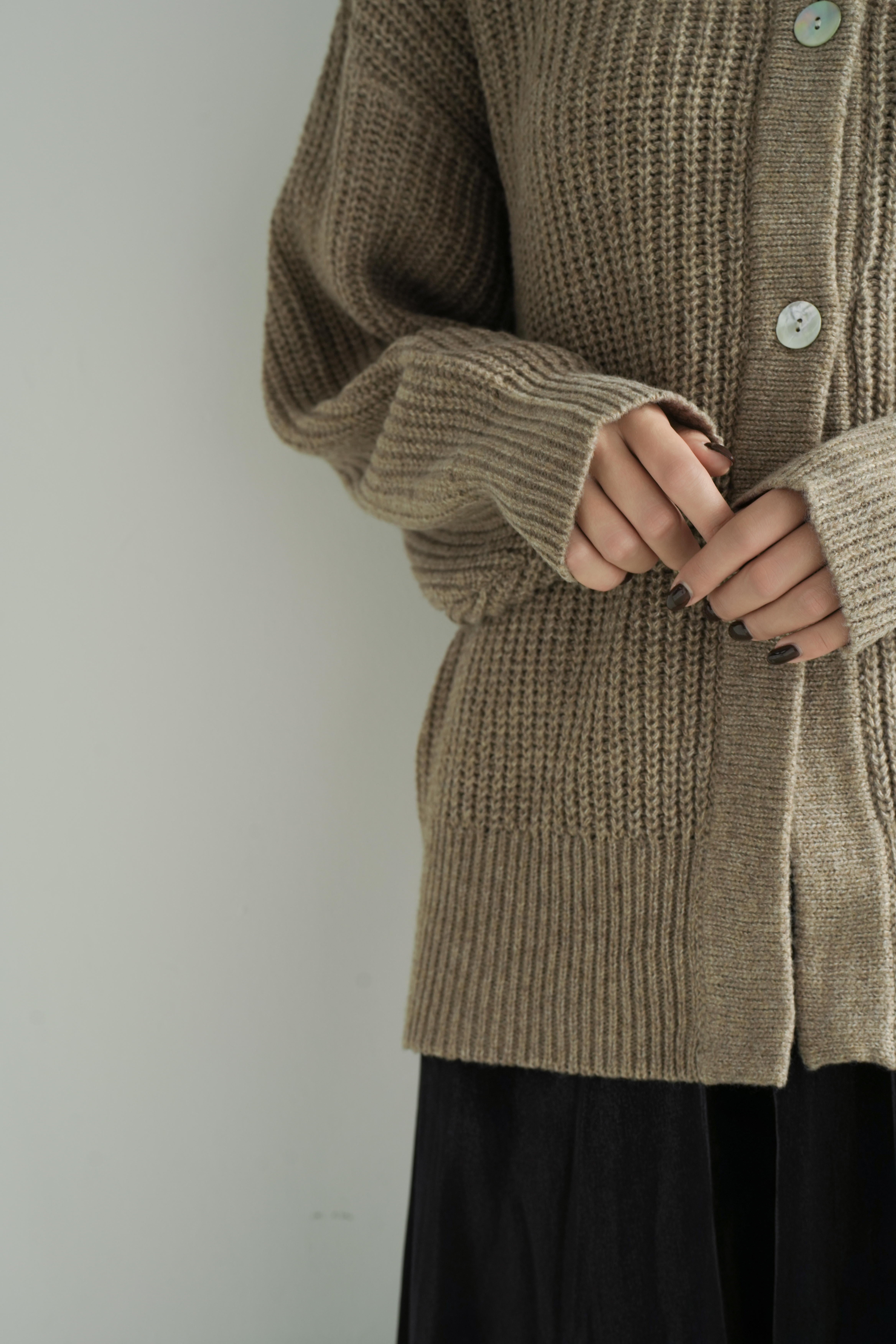 しっとりとした空気感を纏う、ゆとりのあるシルエットが魅力のリブ編みカーディガン。ベーシックでありながら、ほんのりモードを感じさせるオープンカラーと、抜け感のあるドロップショルダーが、装いに優しいリズムを加えます。深みのあるベージュトーンは、肌なじみも良く、さまざまな色と調和。ブラックの光沢スカートやブーツと合わせれば、日常に溶け込みながらも洗練された印象に仕上がります。肩肘張らないのにきちんと見える。そんな“ロゼ・ウィークエンド”にふさわしい、上質な一枚です。
