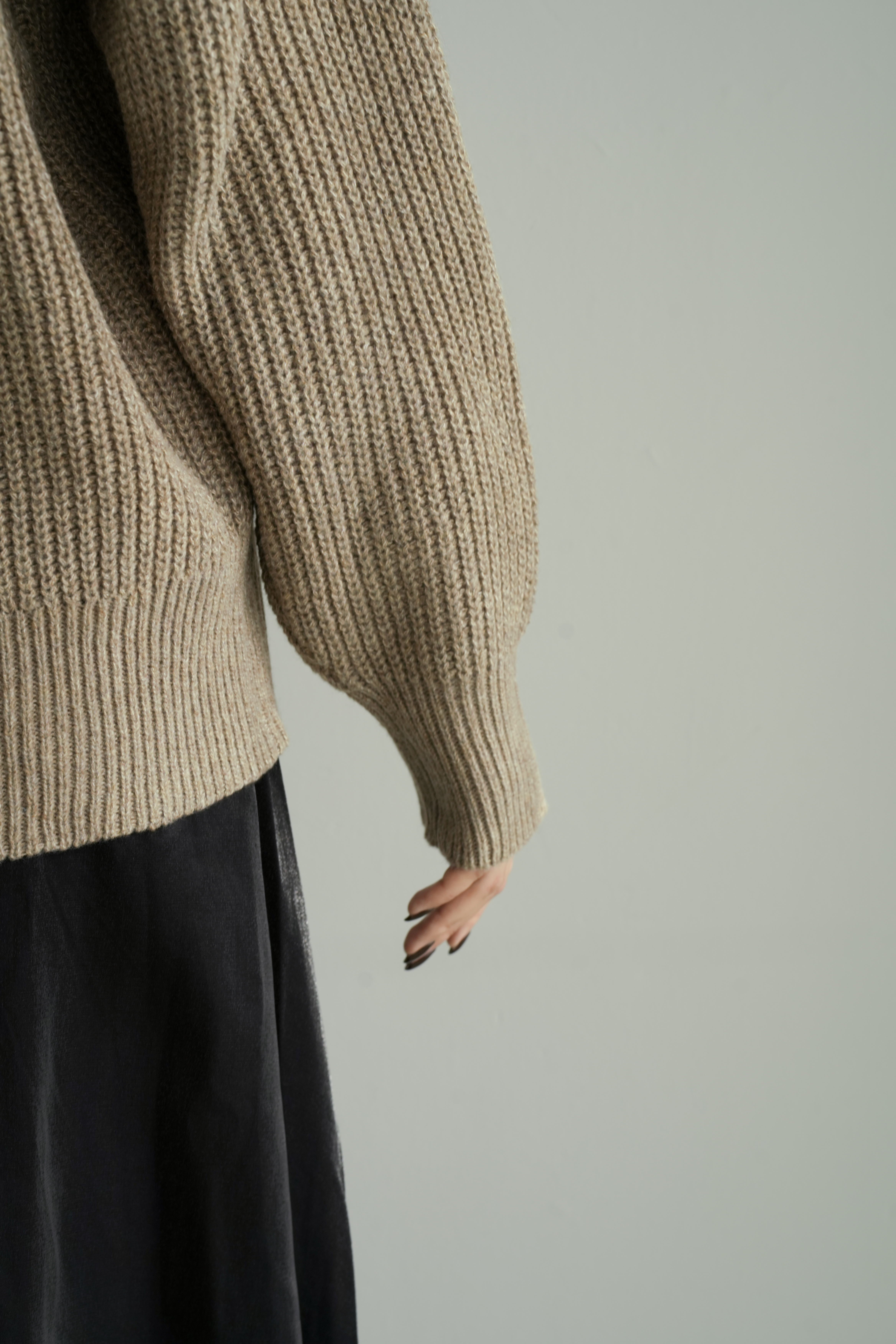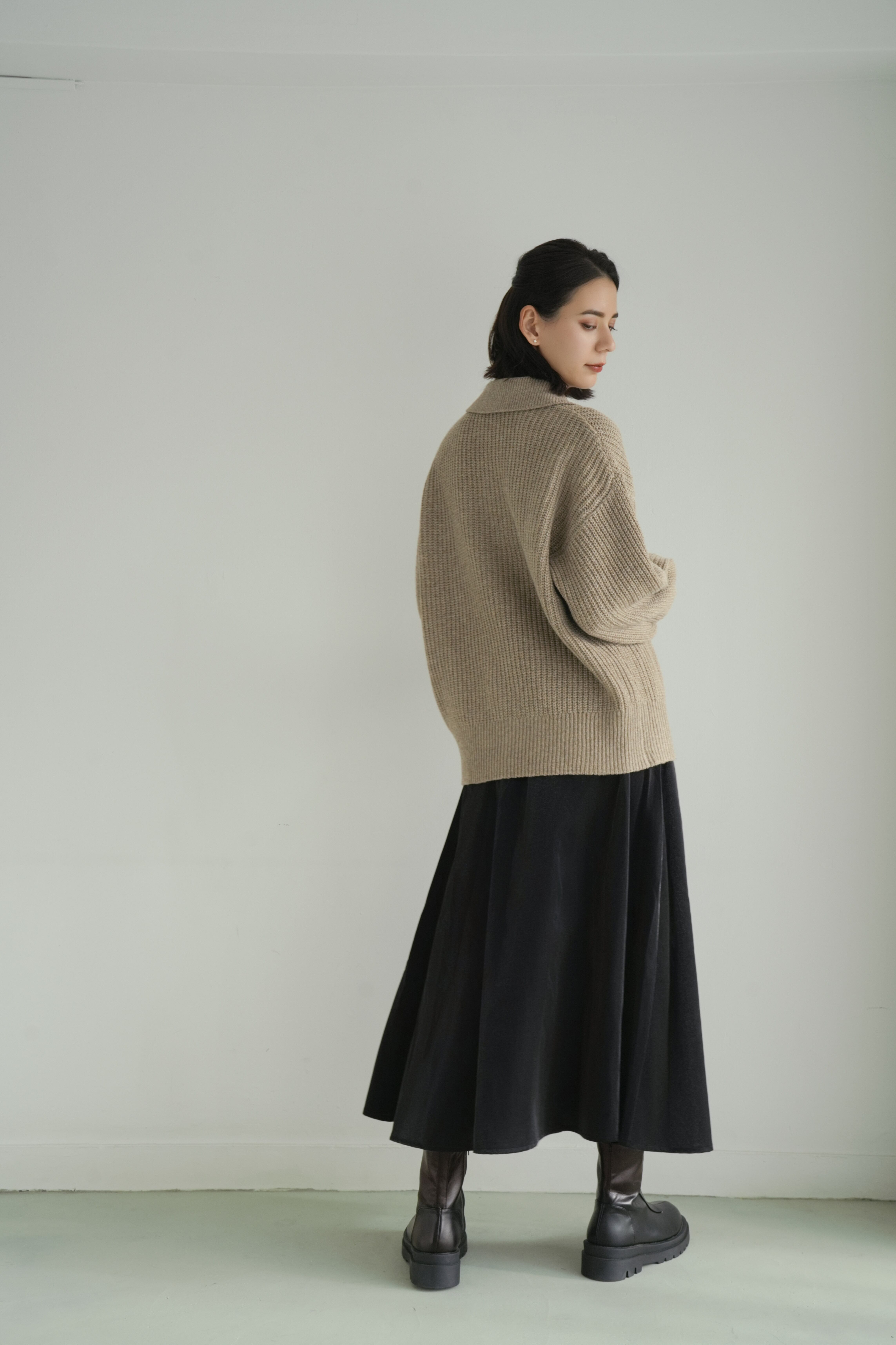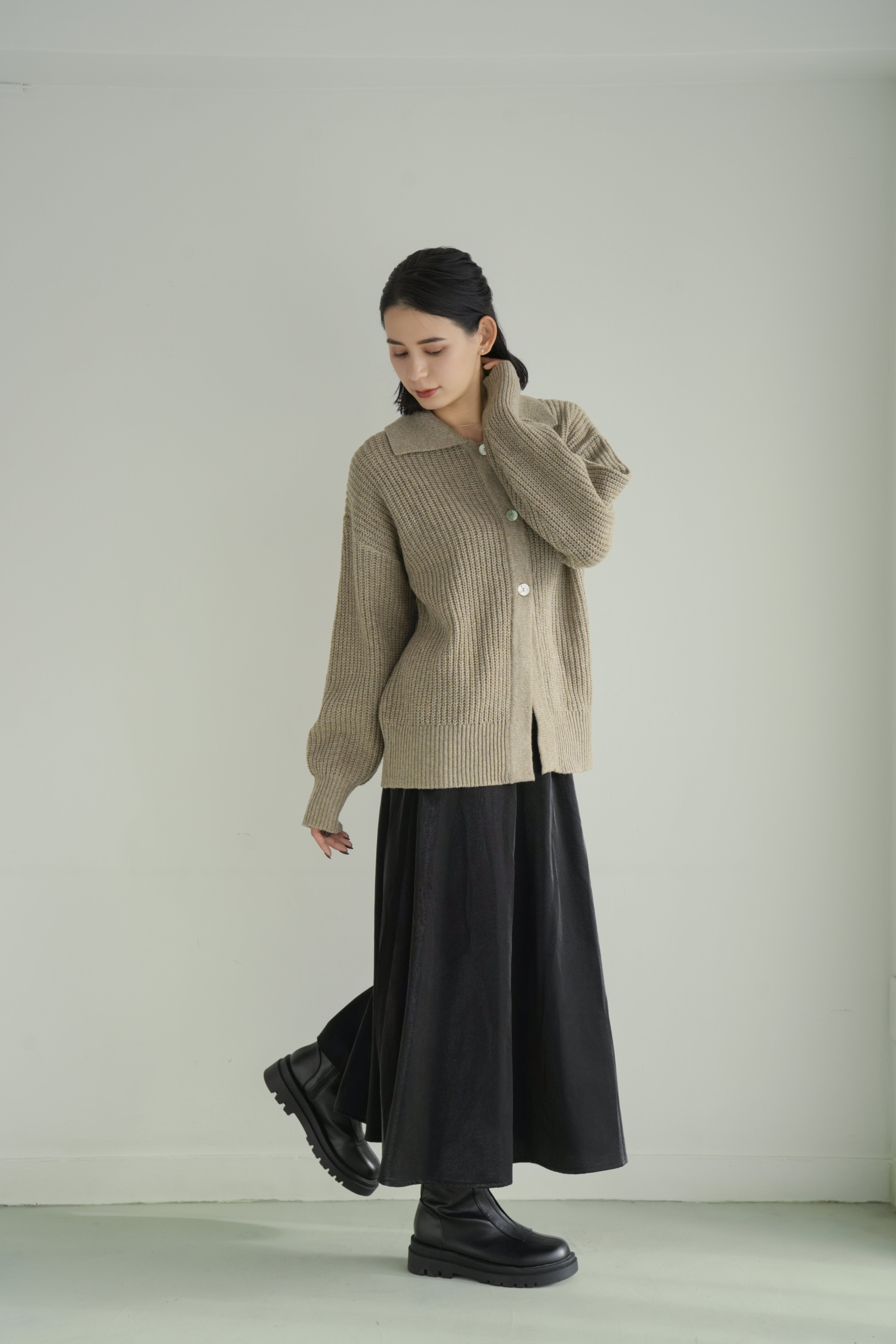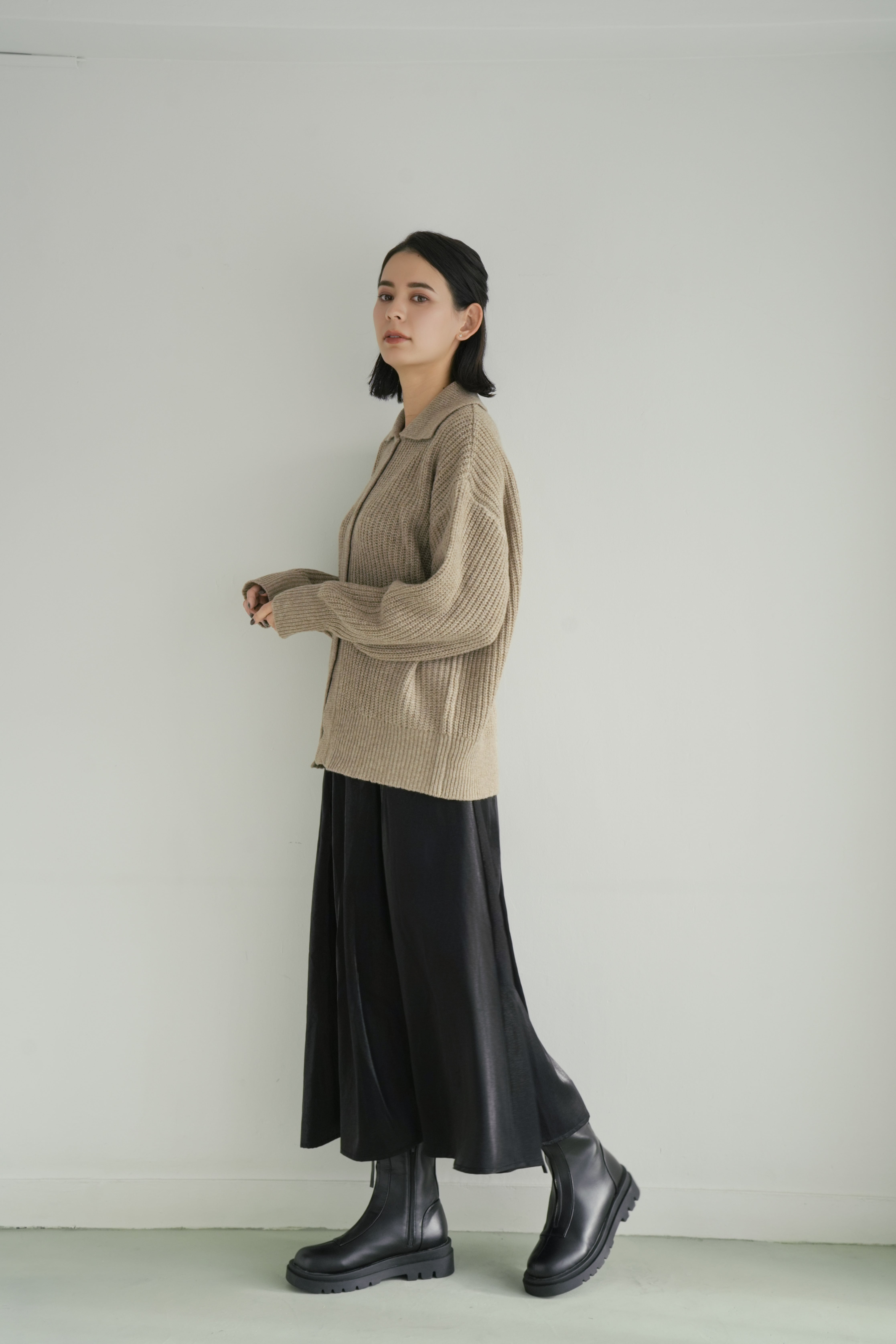 しっとりとした空気感を纏う、ゆとりのあるシルエットが魅力のリブ編みカーディガン。ベーシックでありながら、ほんのりモードを感じさせるオープンカラーと、抜け感のあるドロップショルダーが、装いに優しいリズムを加えます。深みのあるベージュトーンは、肌なじみも良く、さまざまな色と調和。ブラックの光沢スカートやブーツと合わせれば、日常に溶け込みながらも洗練された印象に仕上がります。肩肘張らないのにきちんと見える。そんな“ロゼ・ウィークエンド”にふさわしい、上質な一枚です。
