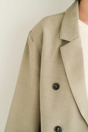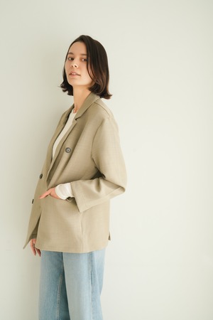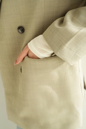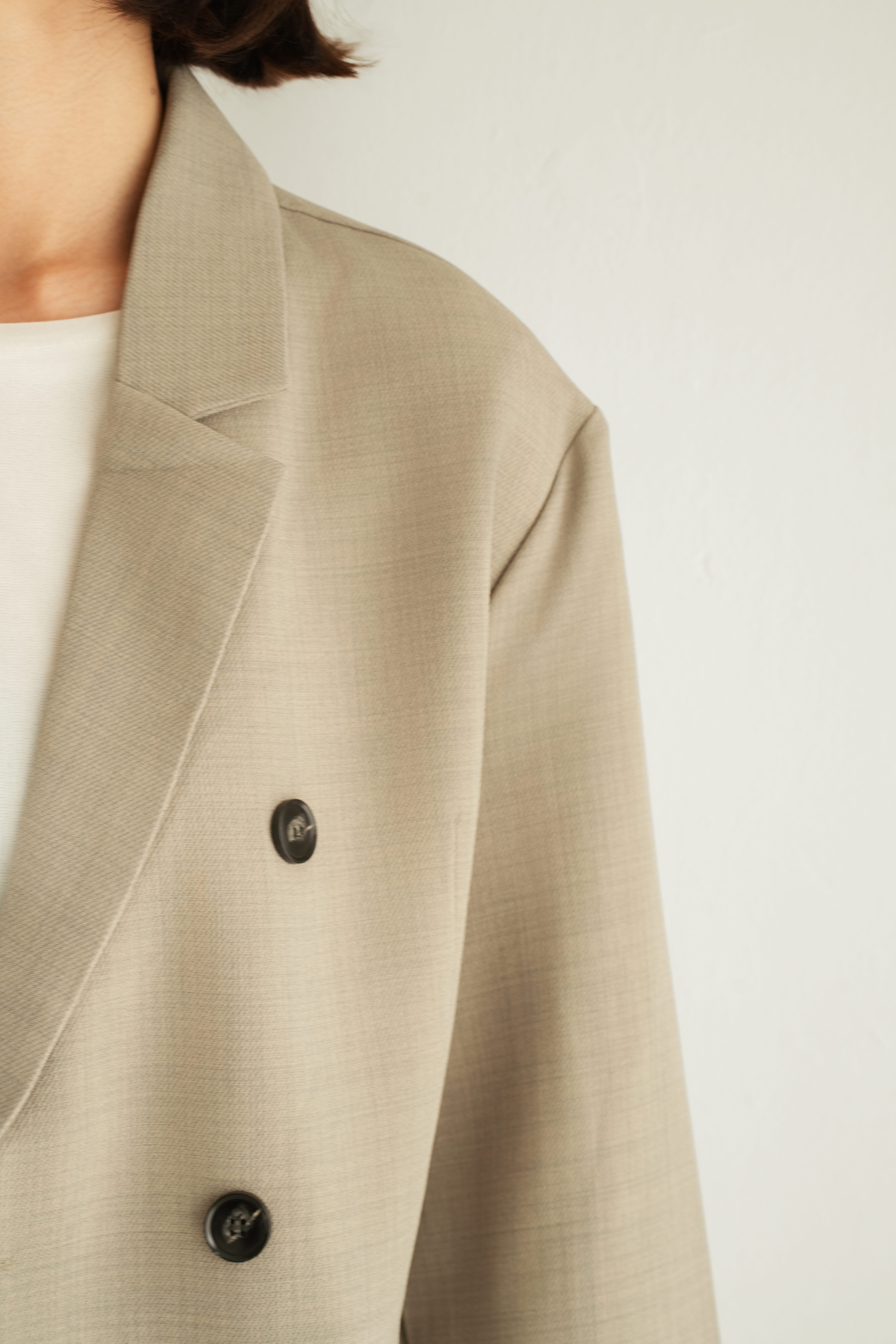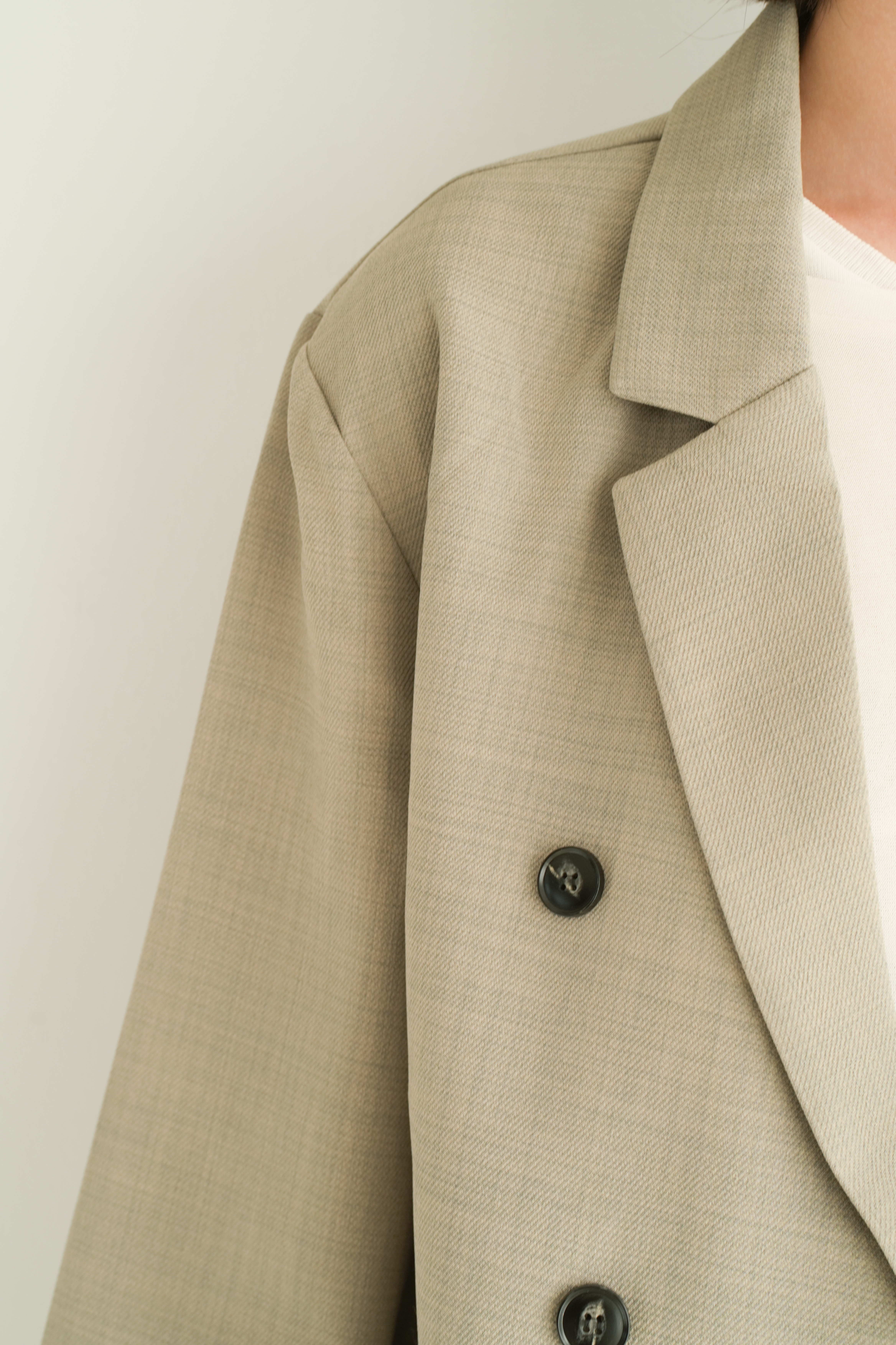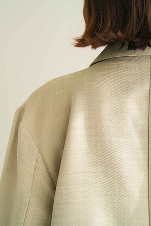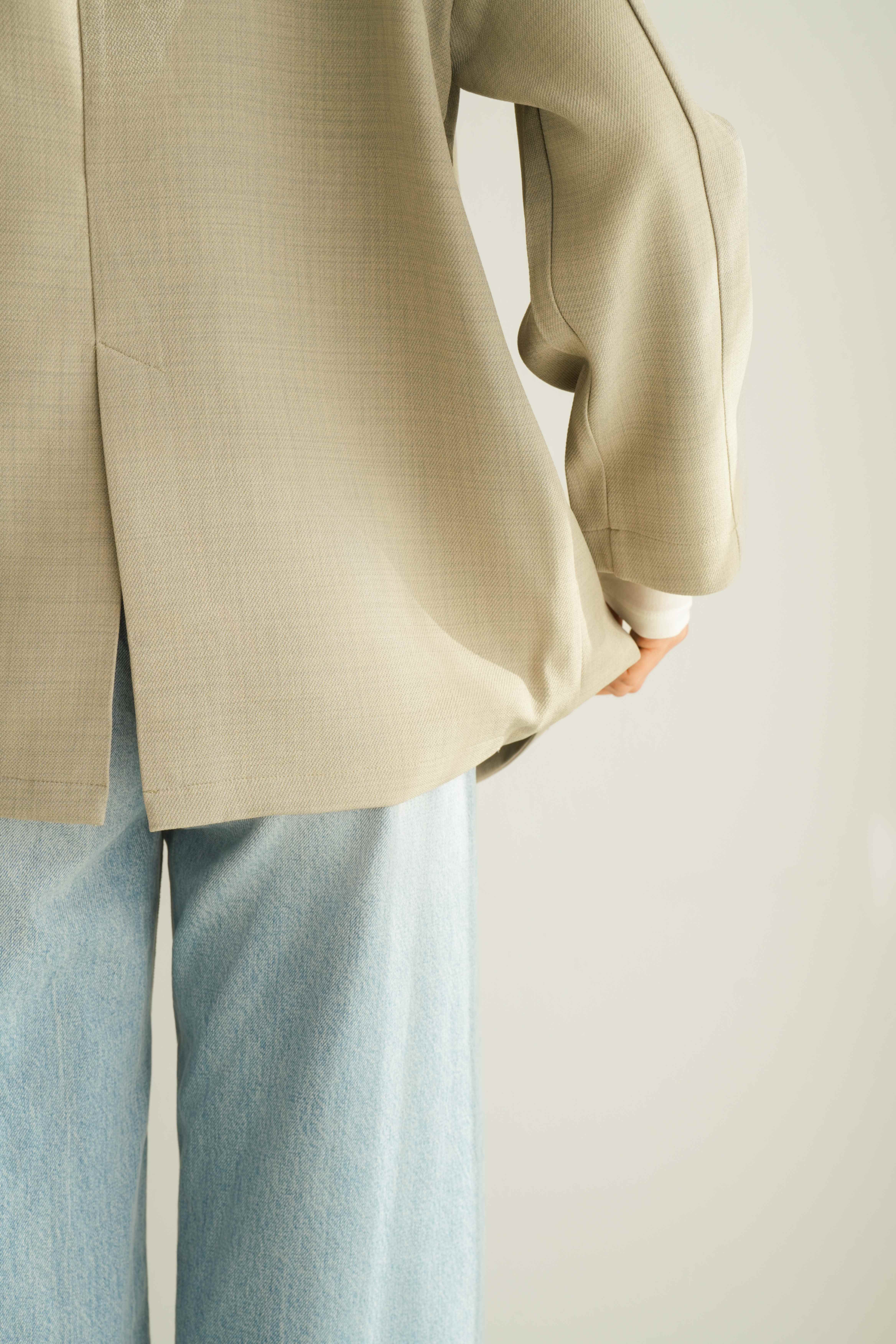 ポリツイルの素材感が魅力のオーバーサイズテーラードジャケット。ゆったりとしたフォルムとドロップショルダーが、こなれたムードを演出し、シンプルなインナーに羽織るだけでスタイルが完成します。ミニマルなディテールながら、ダブルボタンと背中のセンターベントが構築的な印象を与え、ジャケットながら堅すぎず、リラックスした着心地に。カジュアルなデニムにも、スラックスにも合わせやすく、オンオフ問わず活躍するタイムレスな一着です。