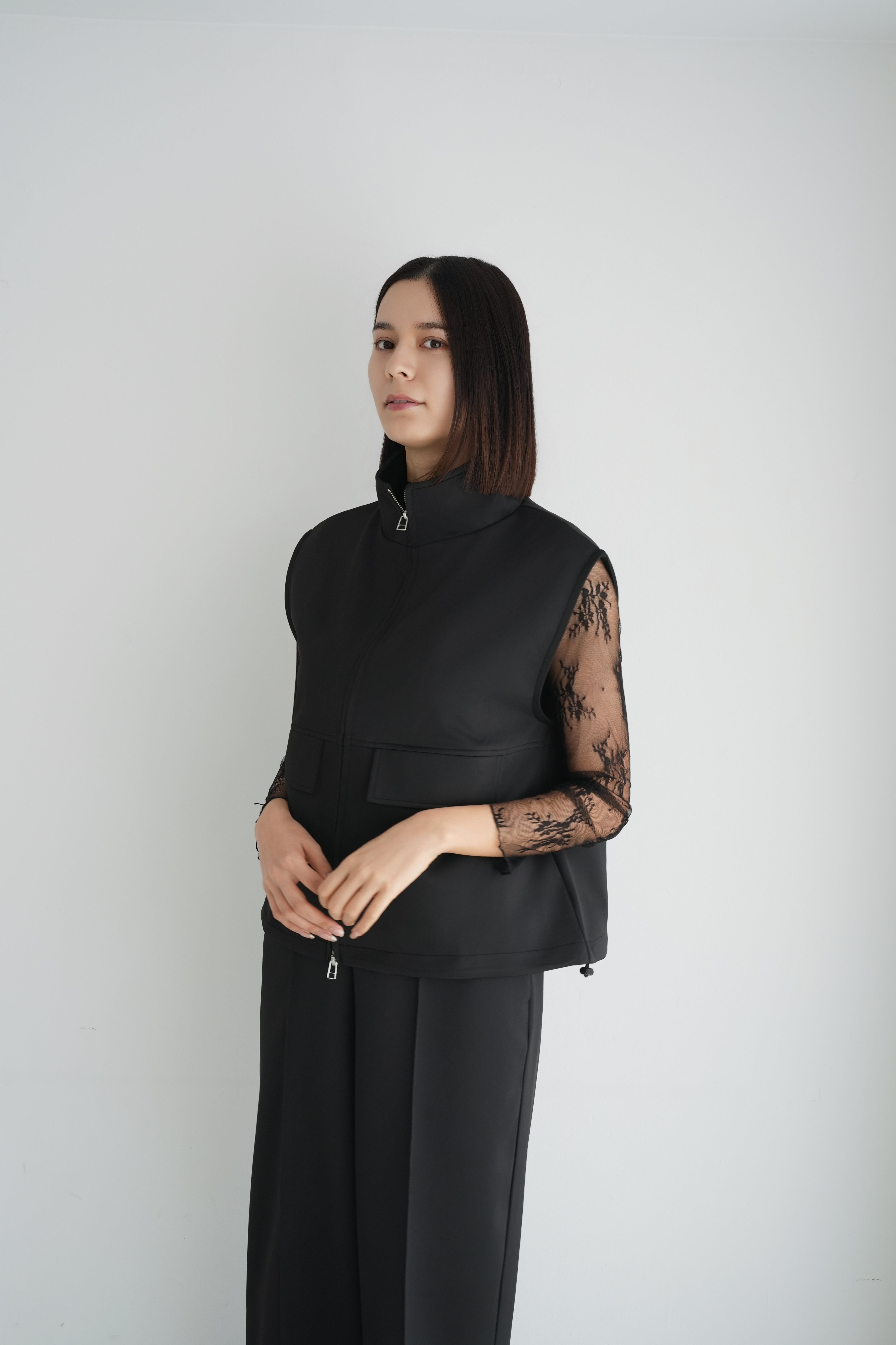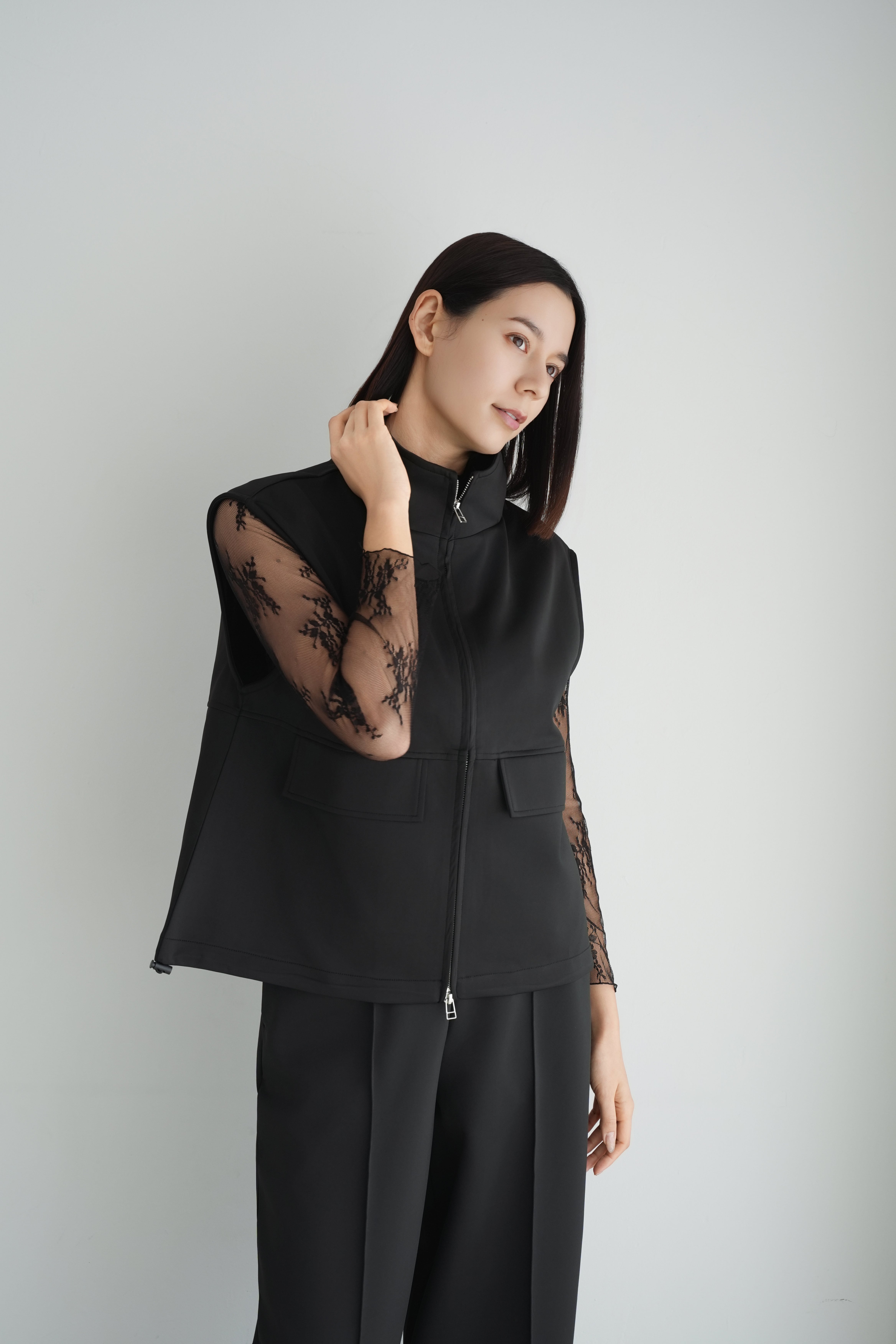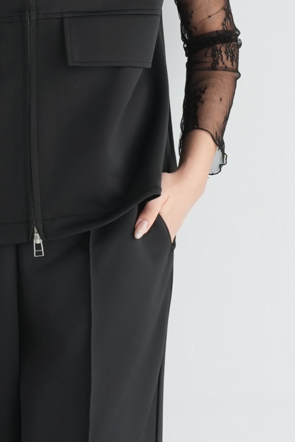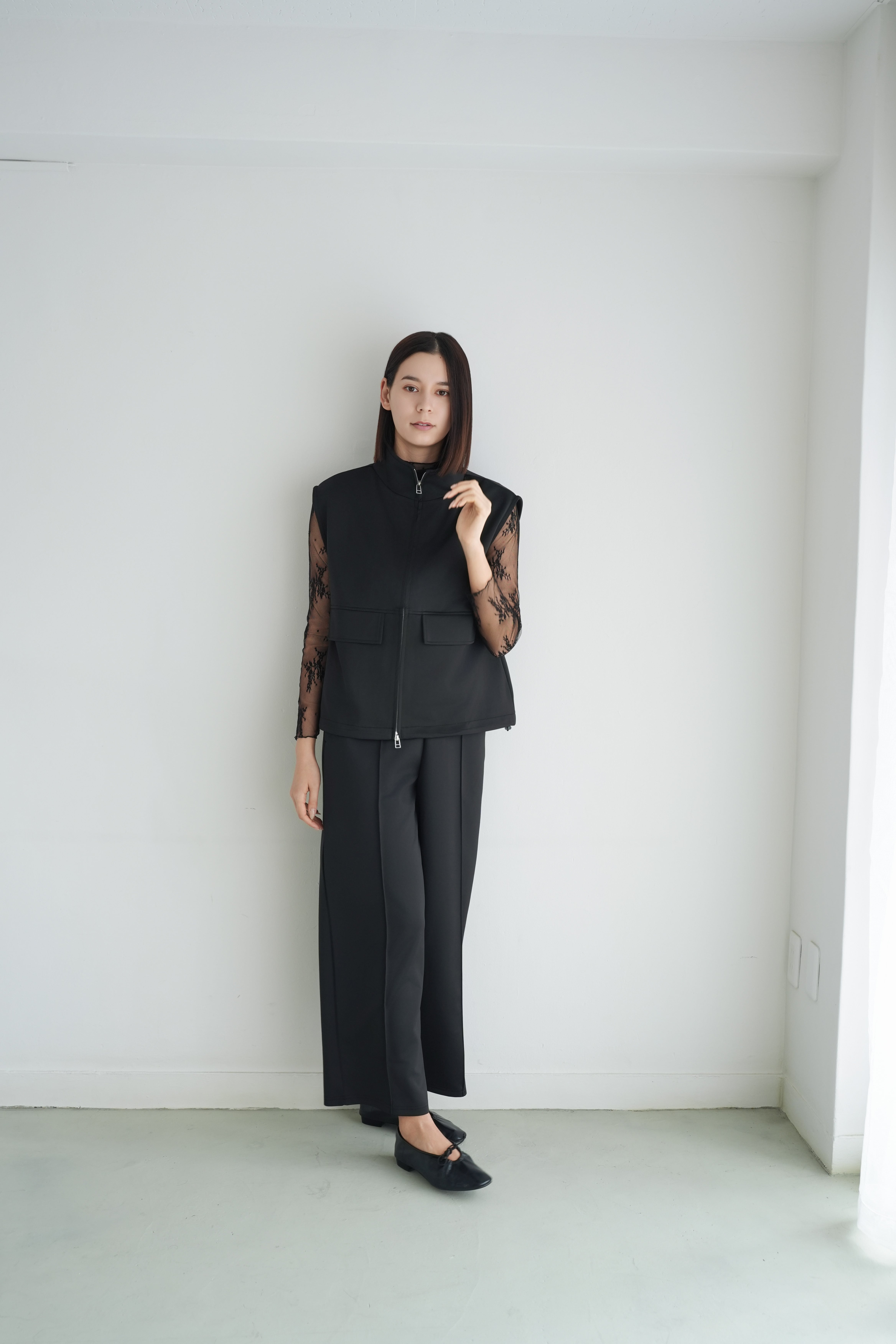 ロゼの「タイムレス・シンプル」を、セットアップで完成させるノワールの2ピース。シャープなスタンドネック×フロントジップのスリーブレスジャケットは、ミニマルな佇まいの中に、フラップポケットが程よい立体感を添えます。合わせるパンツは縦に落ちるラインが美しく、ワントーンでも間延びしない端正なバランスに。インナーはシアートップスで抜けを出したり、タンクで潔くまとめたりと、気分で表情チェンジ。フラットシューズで肩の力を抜けば「ロゼ・ウィークエンド」らしい洗練カジュアルに、ヒールや小物を足せばオンシーンにも。セットでも単品でも着回せる、長く頼れる一着です。