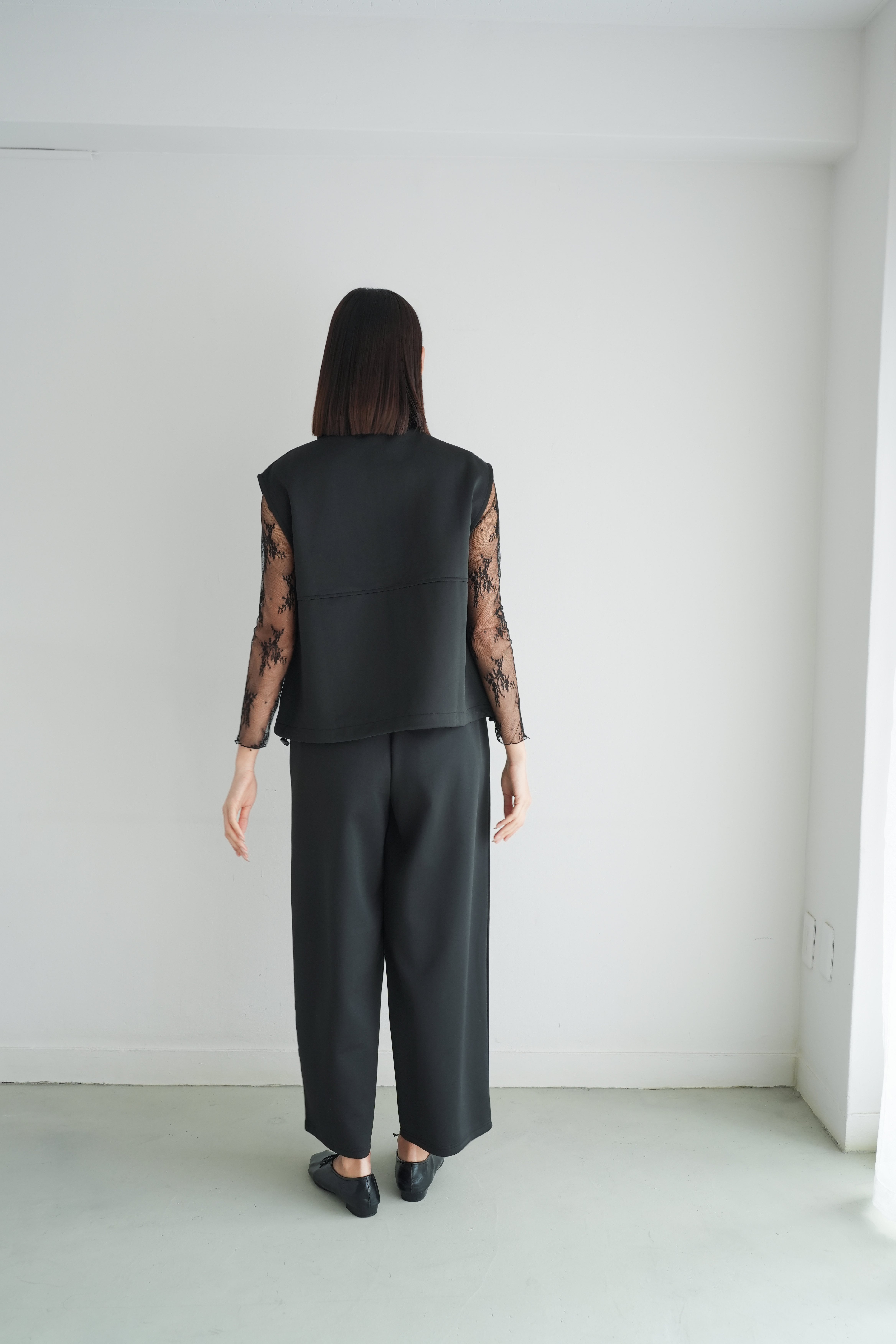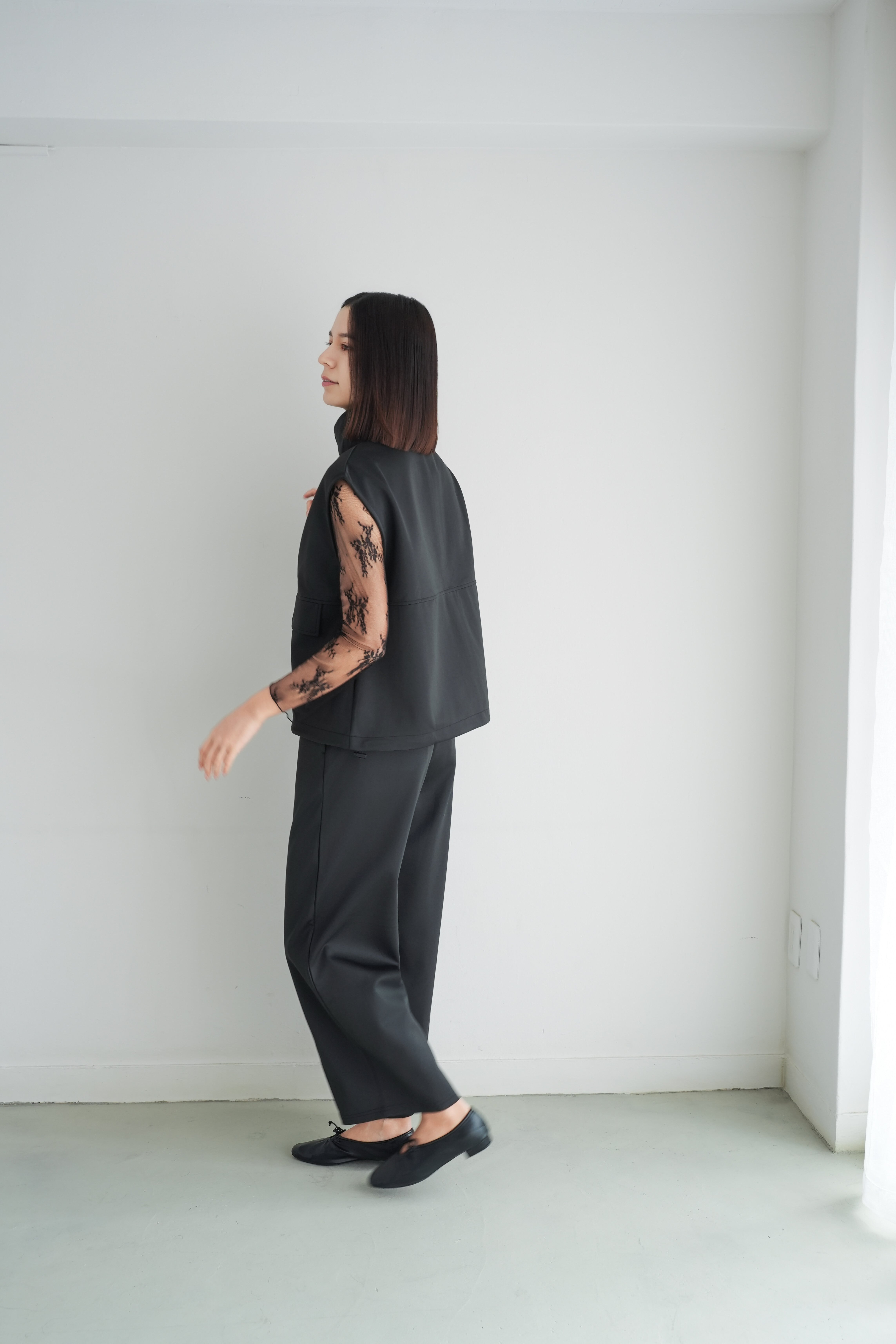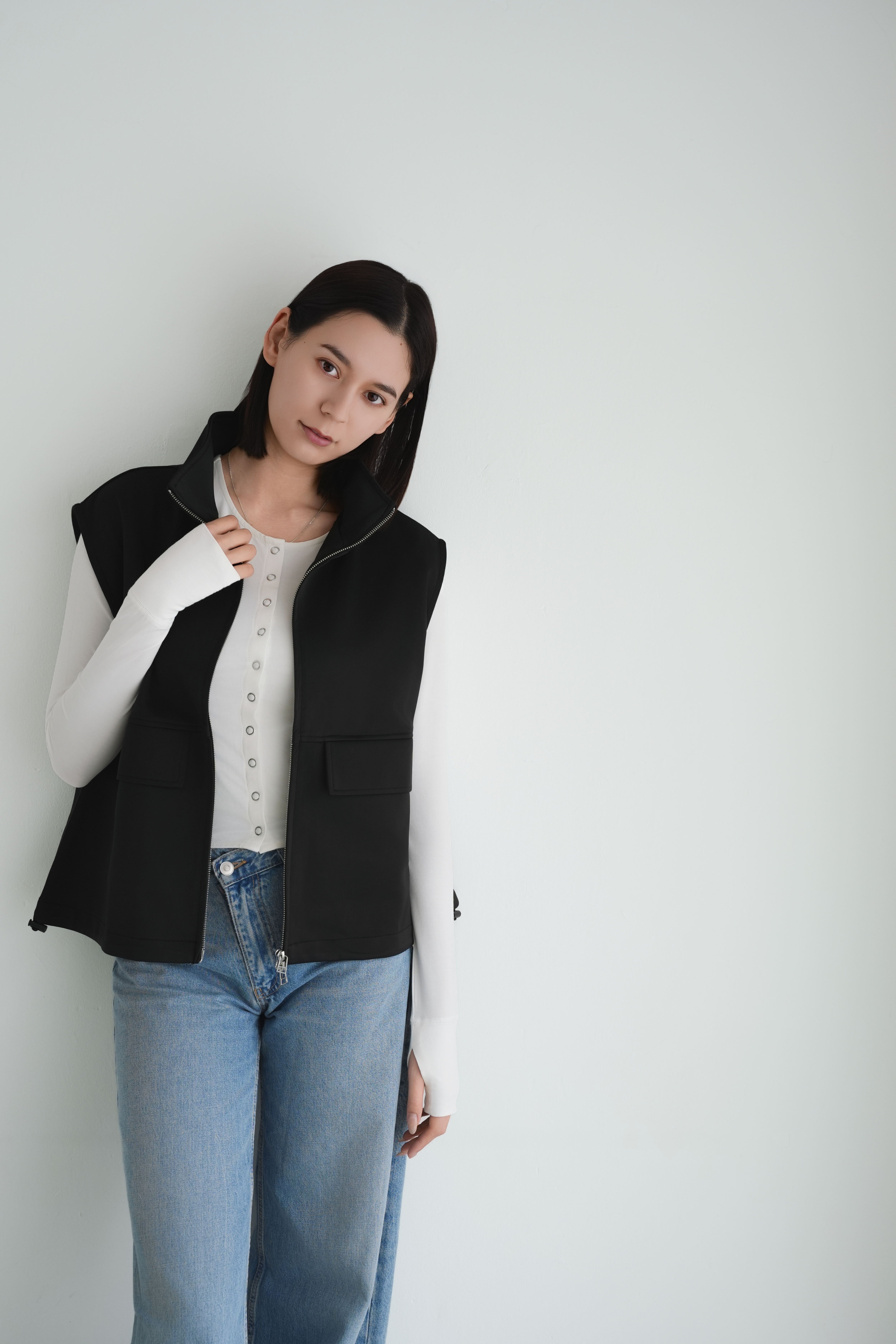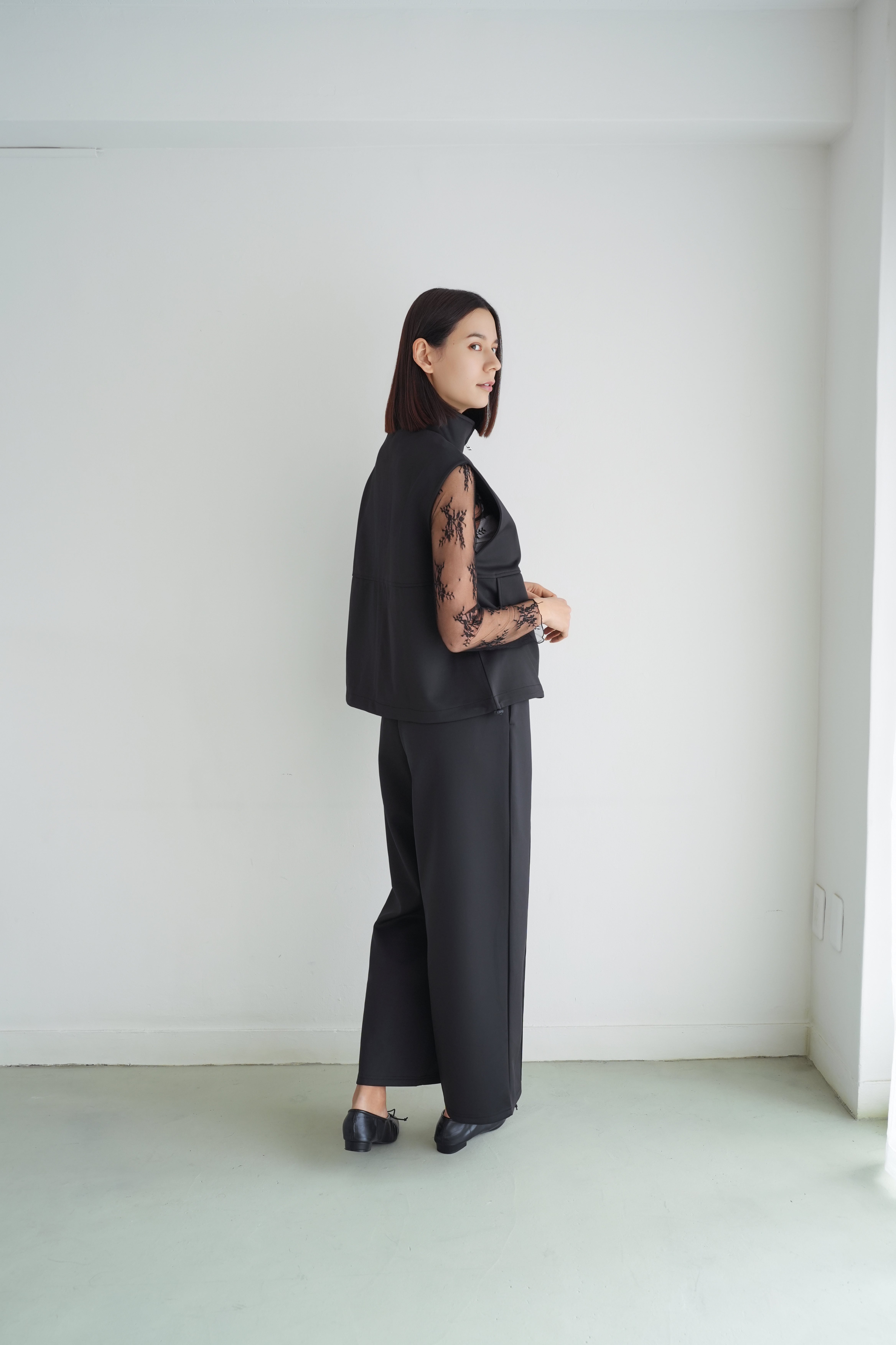 ロゼの「タイムレス・シンプル」を、セットアップで完成させるノワールの2ピース。シャープなスタンドネック×フロントジップのスリーブレスジャケットは、ミニマルな佇まいの中に、フラップポケットが程よい立体感を添えます。合わせるパンツは縦に落ちるラインが美しく、ワントーンでも間延びしない端正なバランスに。インナーはシアートップスで抜けを出したり、タンクで潔くまとめたりと、気分で表情チェンジ。フラットシューズで肩の力を抜けば「ロゼ・ウィークエンド」らしい洗練カジュアルに、ヒールや小物を足せばオンシーンにも。セットでも単品でも着回せる、長く頼れる一着です。