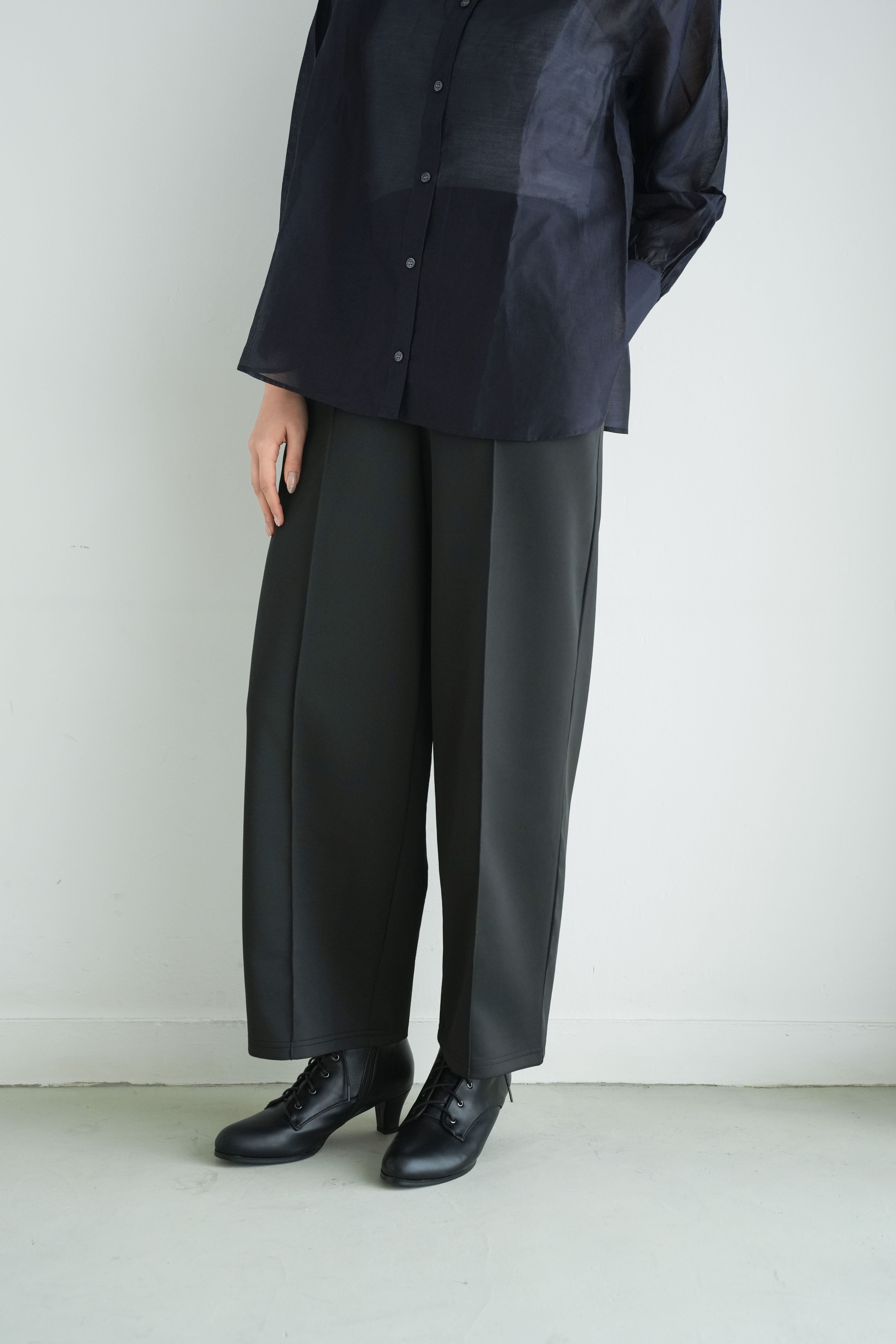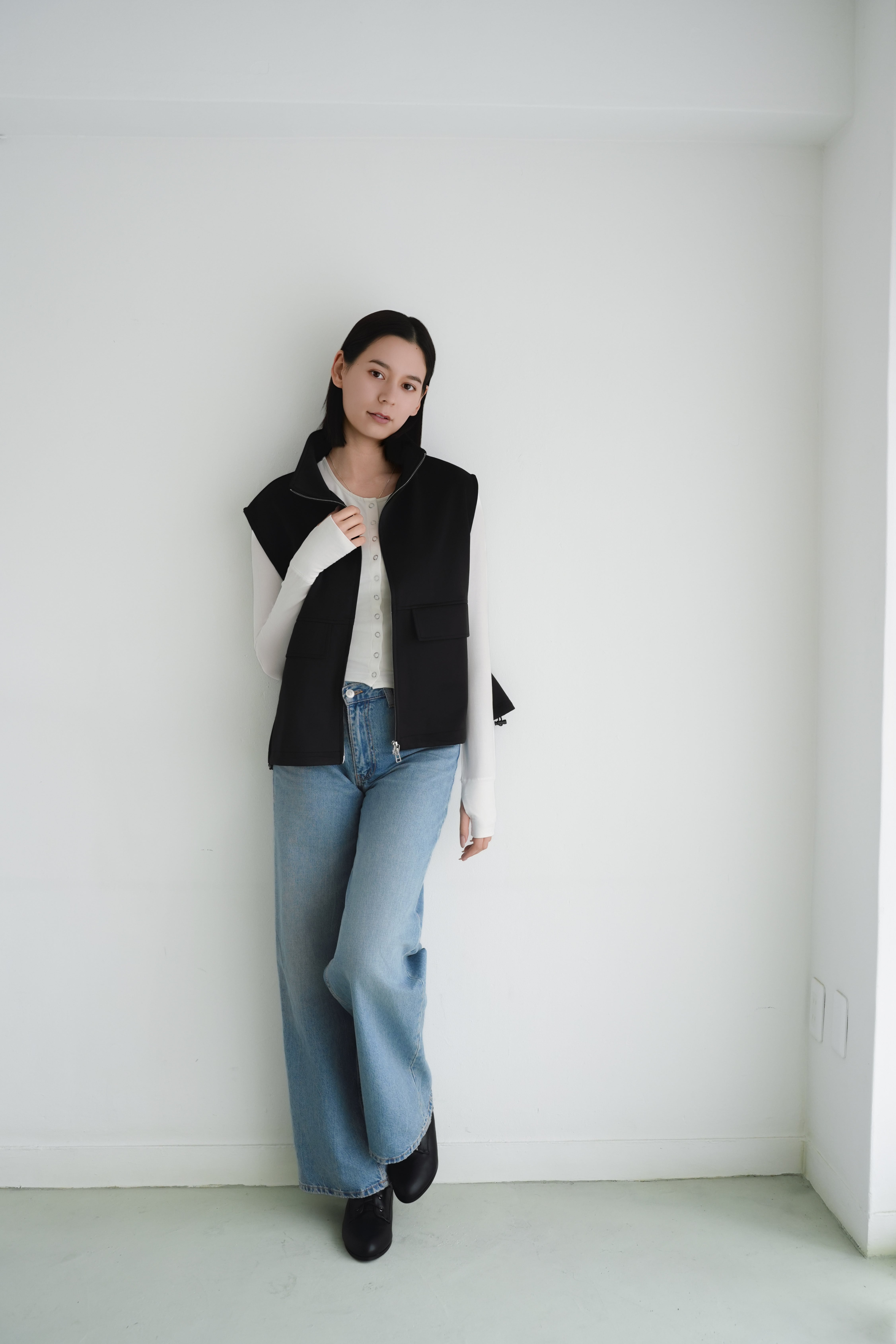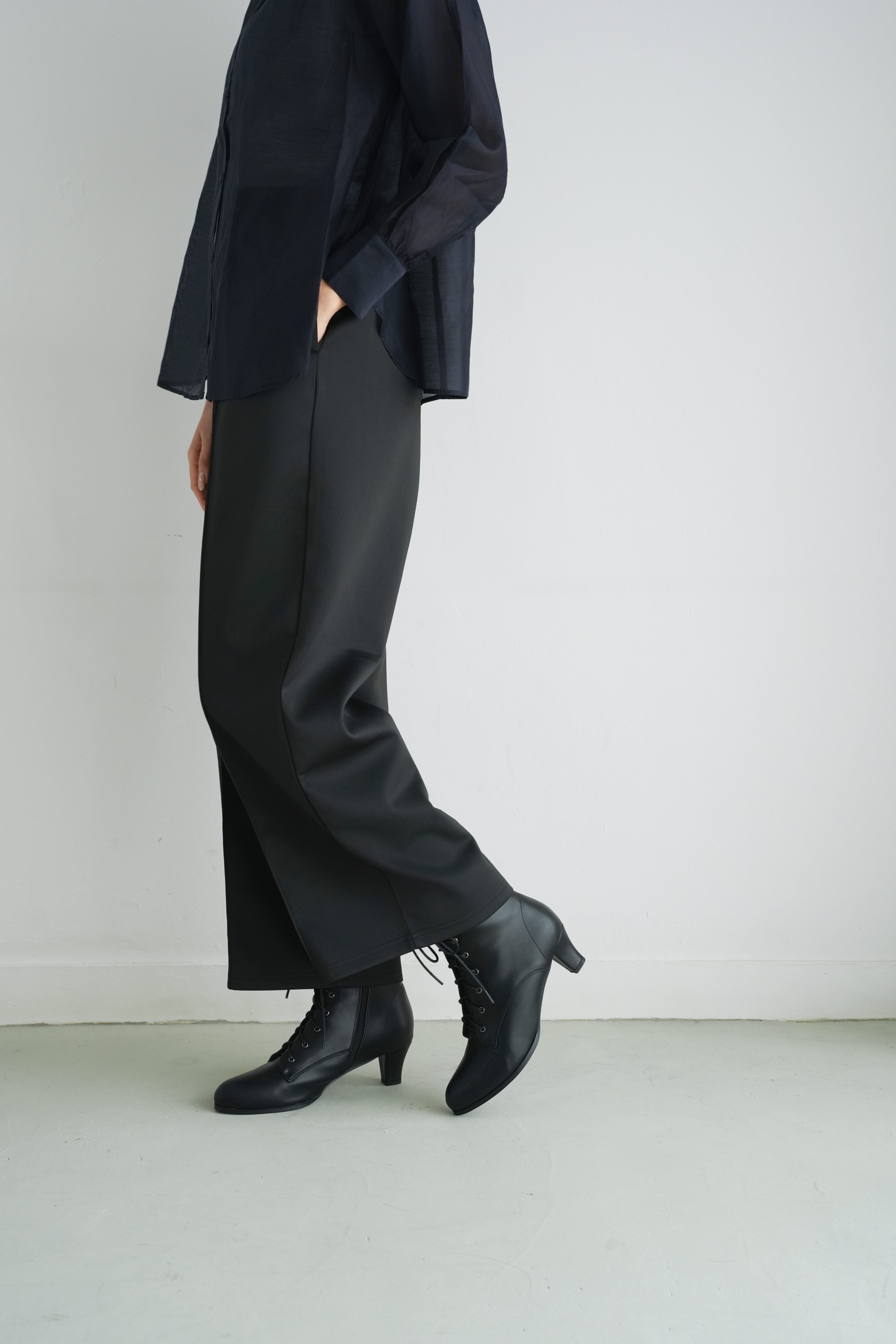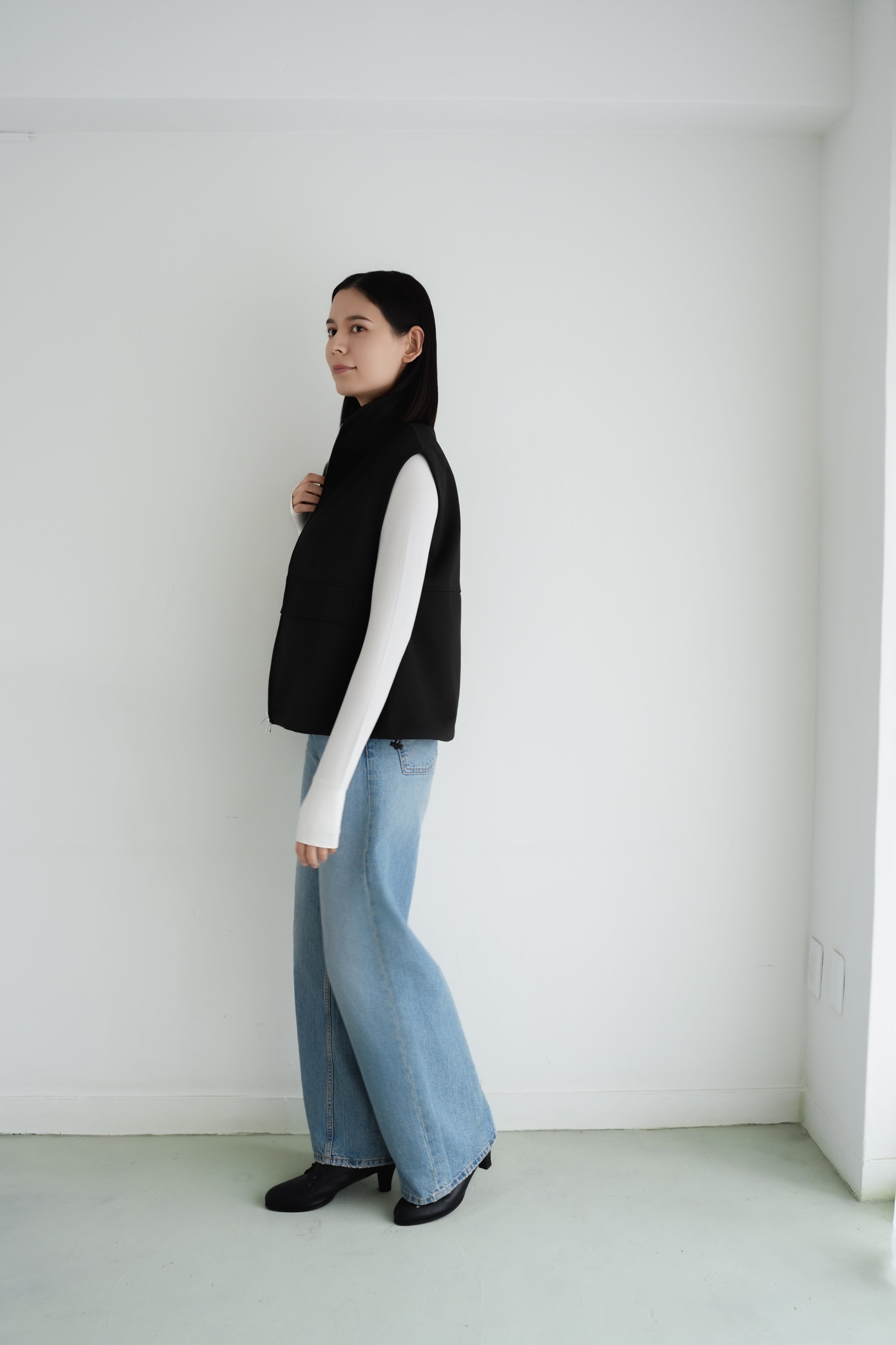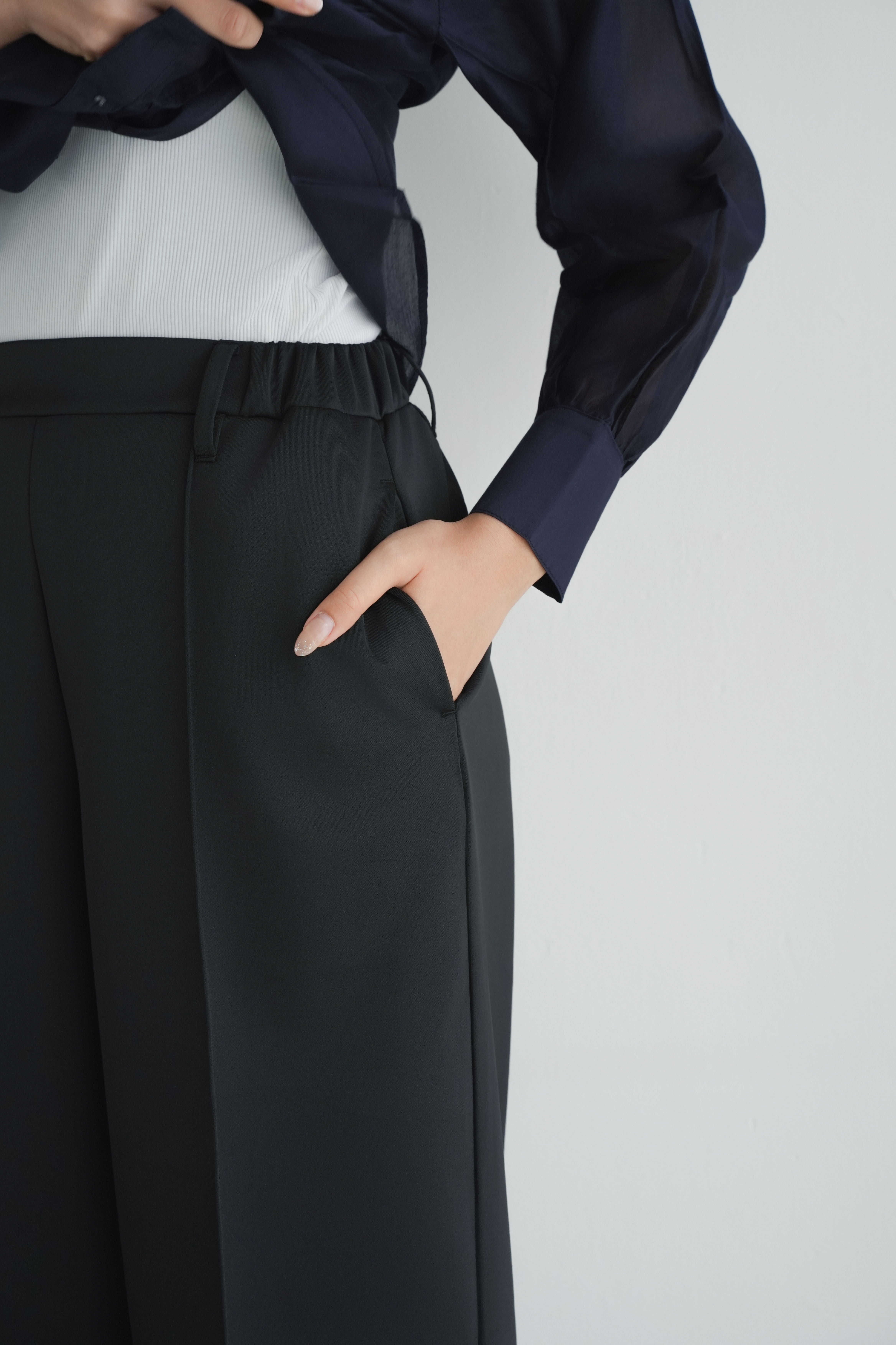 ロゼの「タイムレス・シンプル」を、セットアップで完成させるノワールの2ピース。シャープなスタンドネック×フロントジップのスリーブレスジャケットは、ミニマルな佇まいの中に、フラップポケットが程よい立体感を添えます。合わせるパンツは縦に落ちるラインが美しく、ワントーンでも間延びしない端正なバランスに。インナーはシアートップスで抜けを出したり、タンクで潔くまとめたりと、気分で表情チェンジ。フラットシューズで肩の力を抜けば「ロゼ・ウィークエンド」らしい洗練カジュアルに、ヒールや小物を足せばオンシーンにも。セットでも単品でも着回せる、長く頼れる一着です。