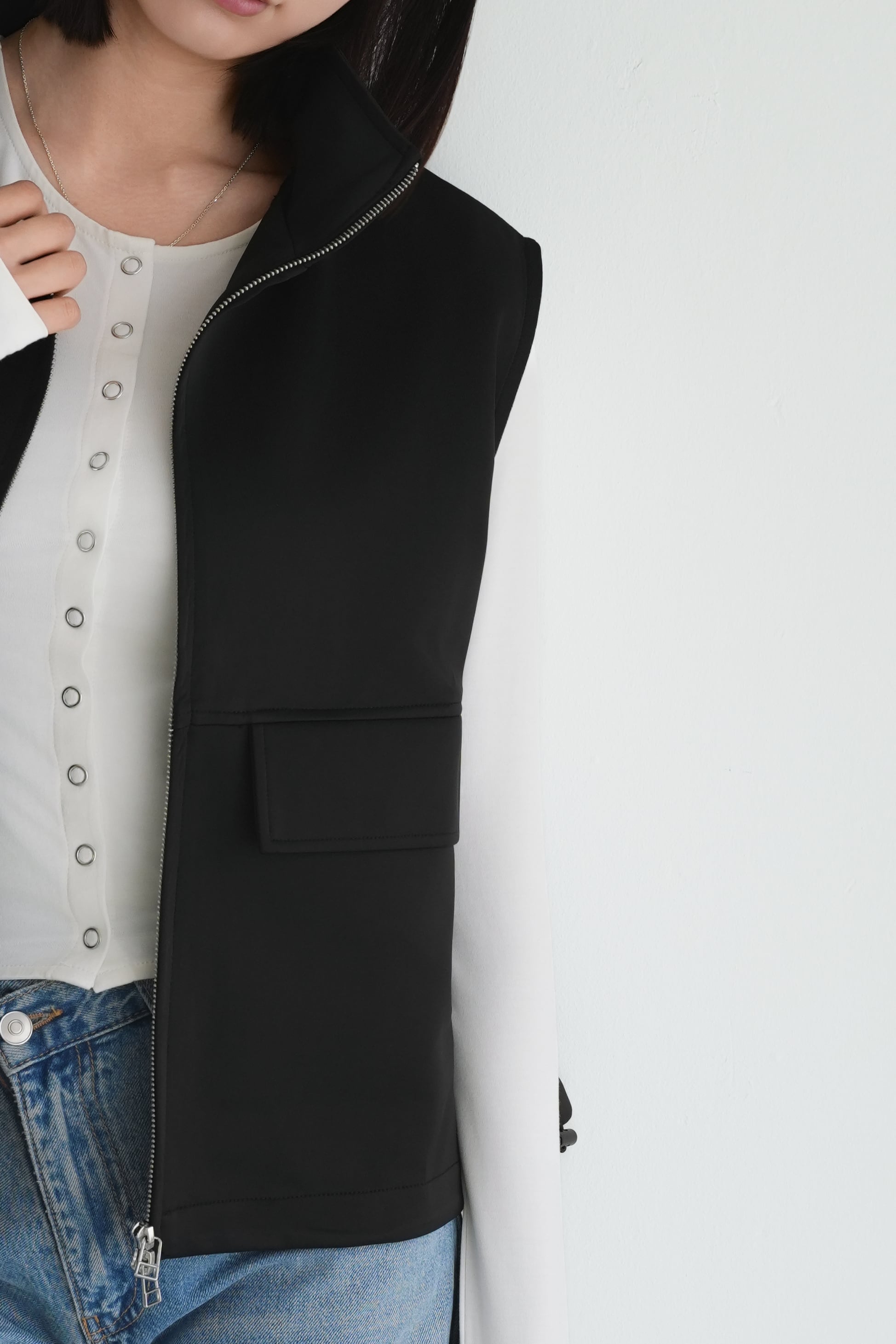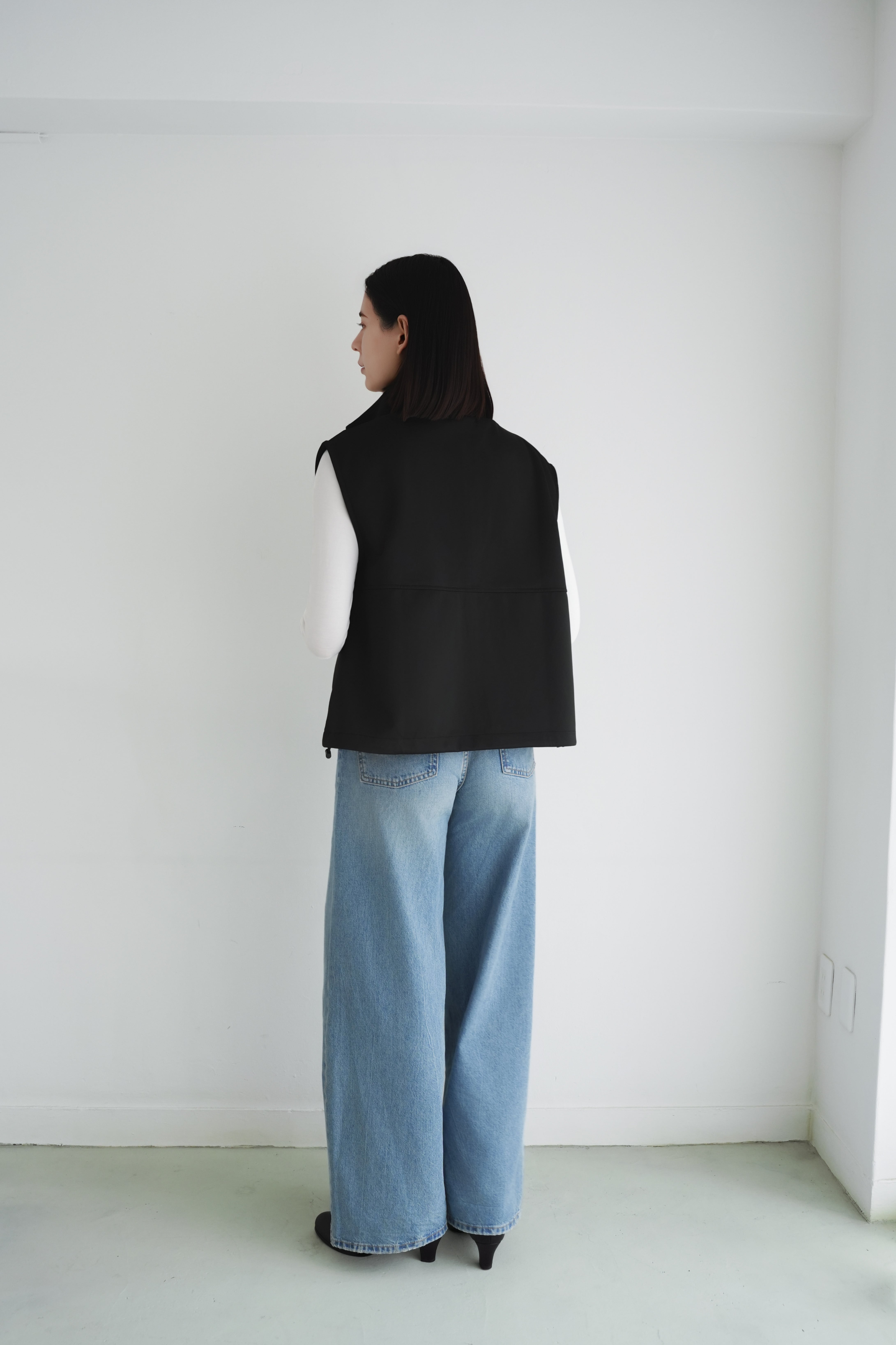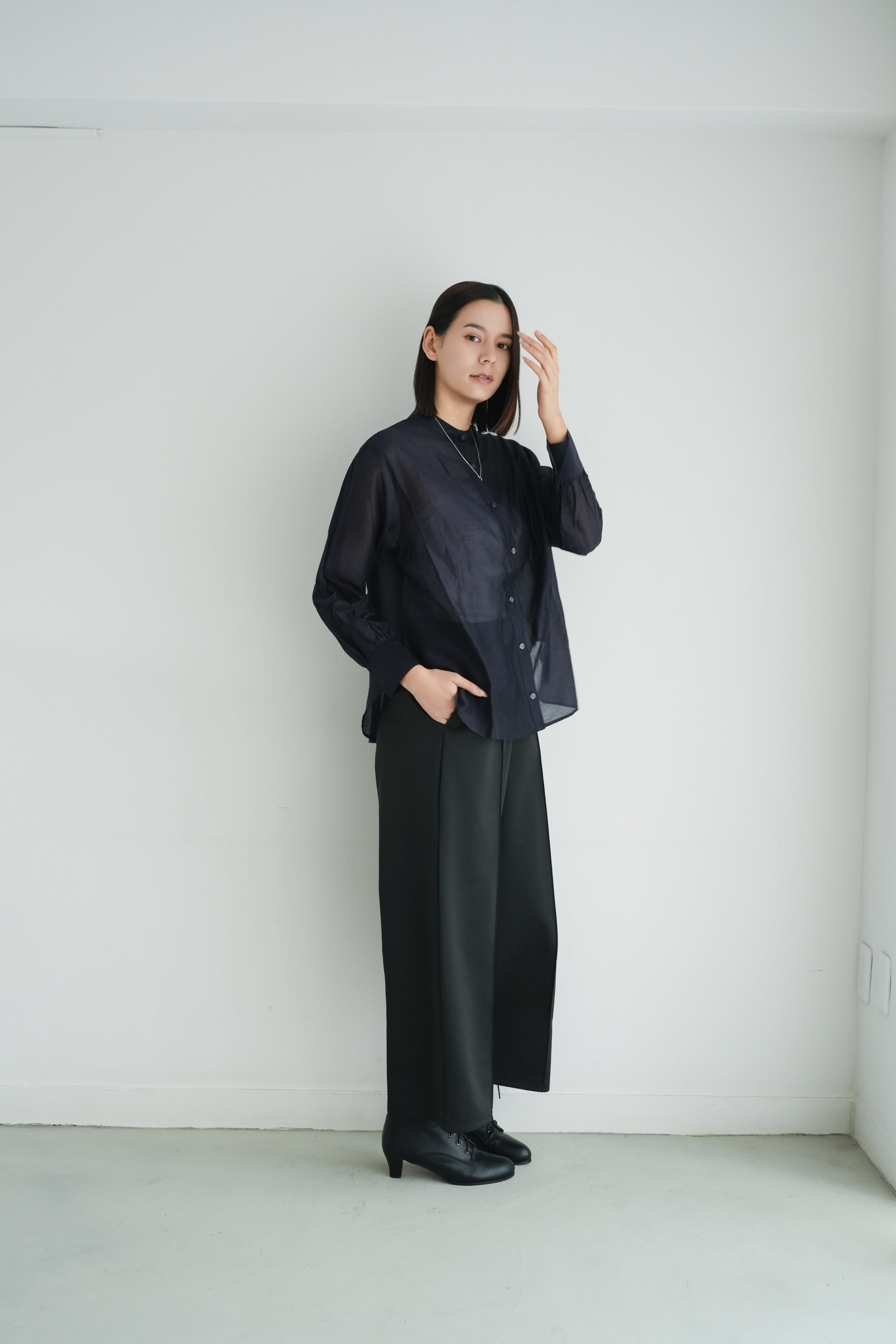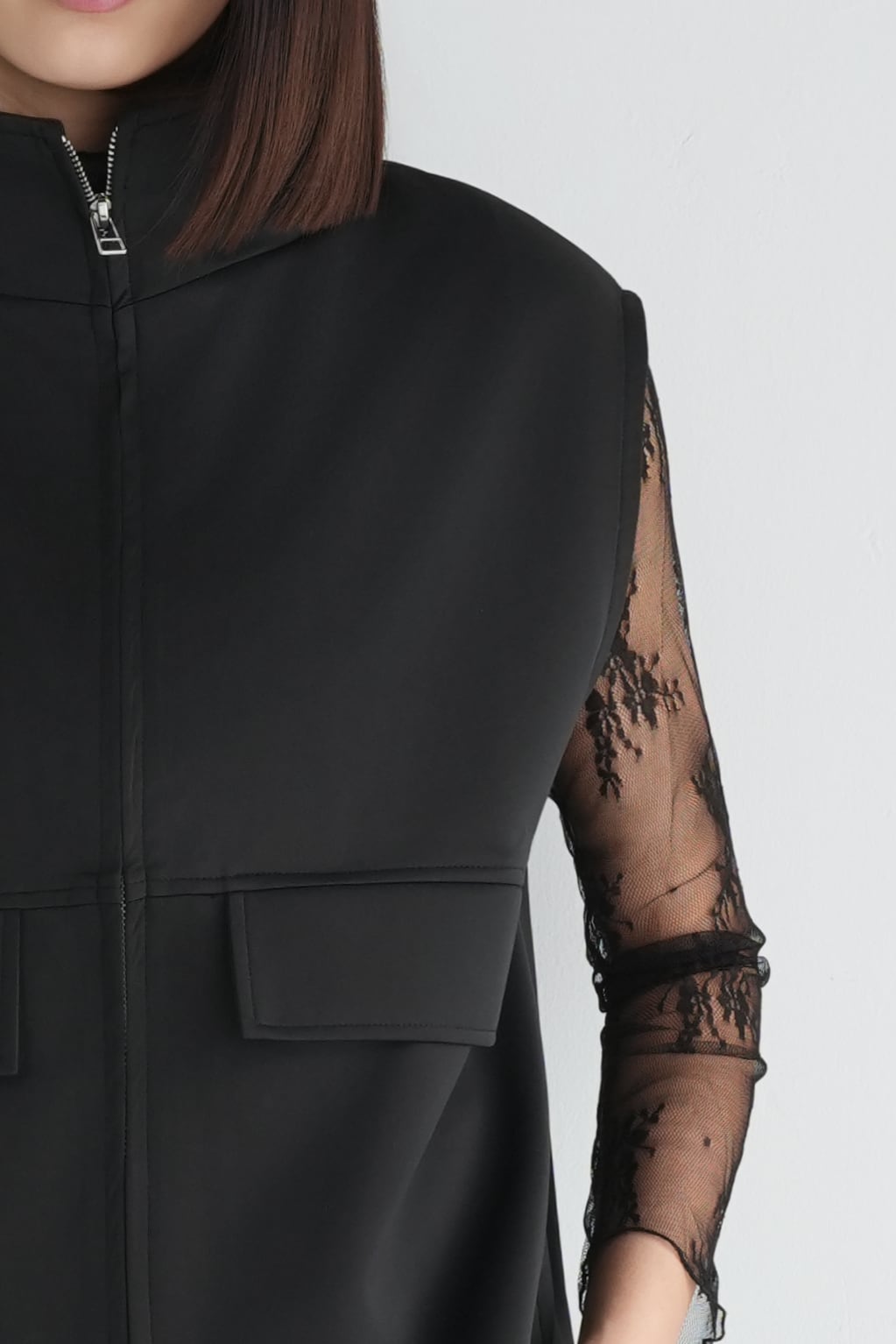 ロゼの「タイムレス・シンプル」を、セットアップで完成させるノワールの2ピース。シャープなスタンドネック×フロントジップのスリーブレスジャケットは、ミニマルな佇まいの中に、フラップポケットが程よい立体感を添えます。合わせるパンツは縦に落ちるラインが美しく、ワントーンでも間延びしない端正なバランスに。インナーはシアートップスで抜けを出したり、タンクで潔くまとめたりと、気分で表情チェンジ。フラットシューズで肩の力を抜けば「ロゼ・ウィークエンド」らしい洗練カジュアルに、ヒールや小物を足せばオンシーンにも。セットでも単品でも着回せる、長く頼れる一着です。