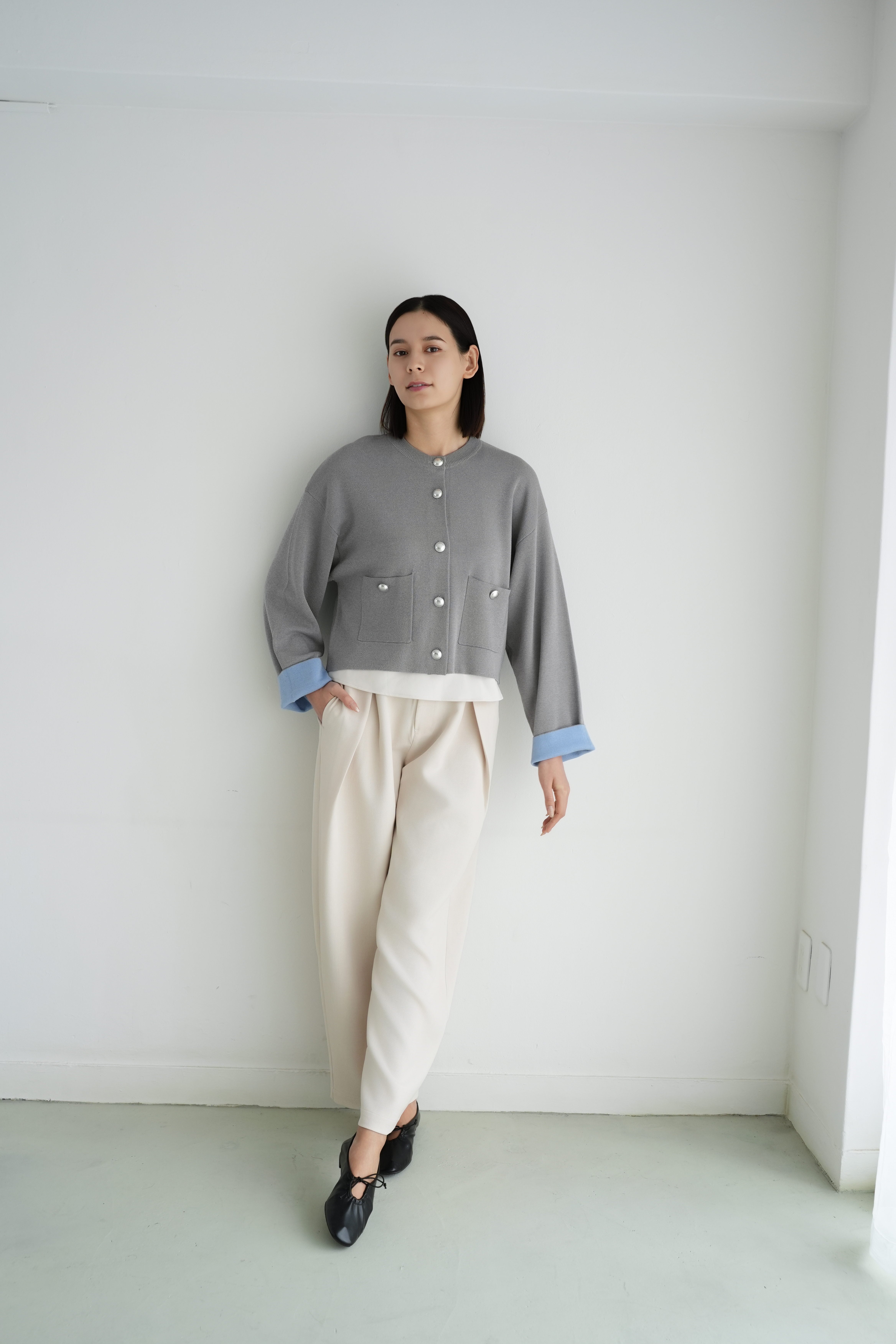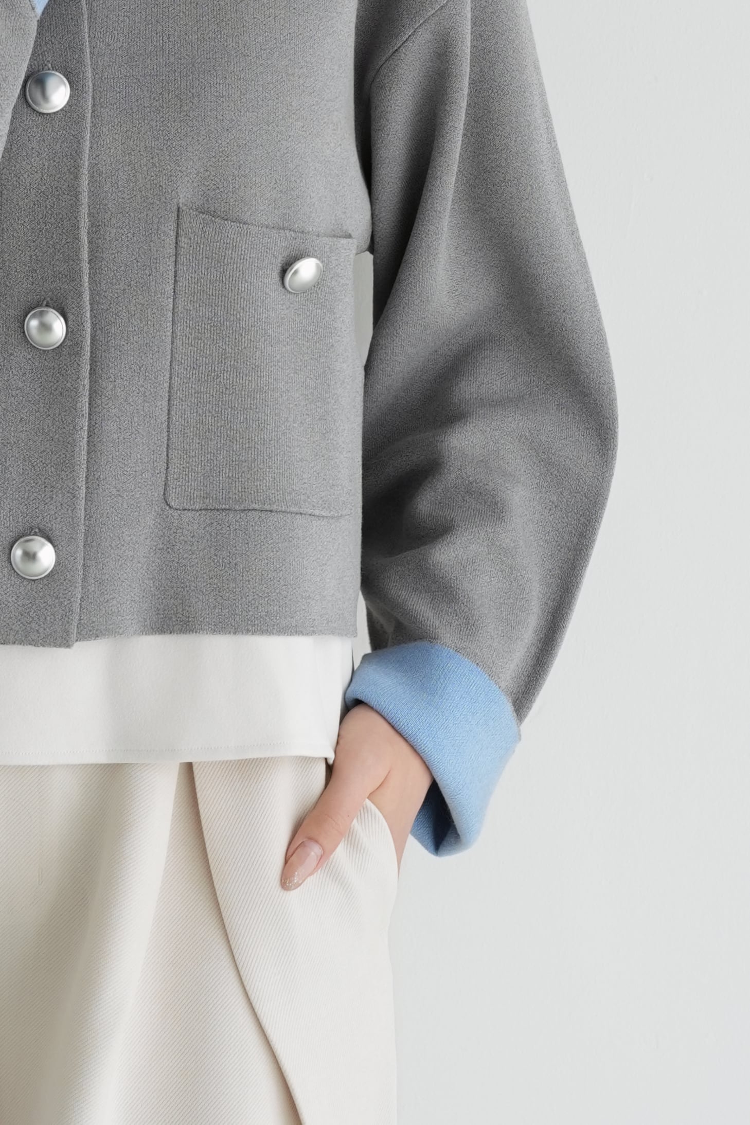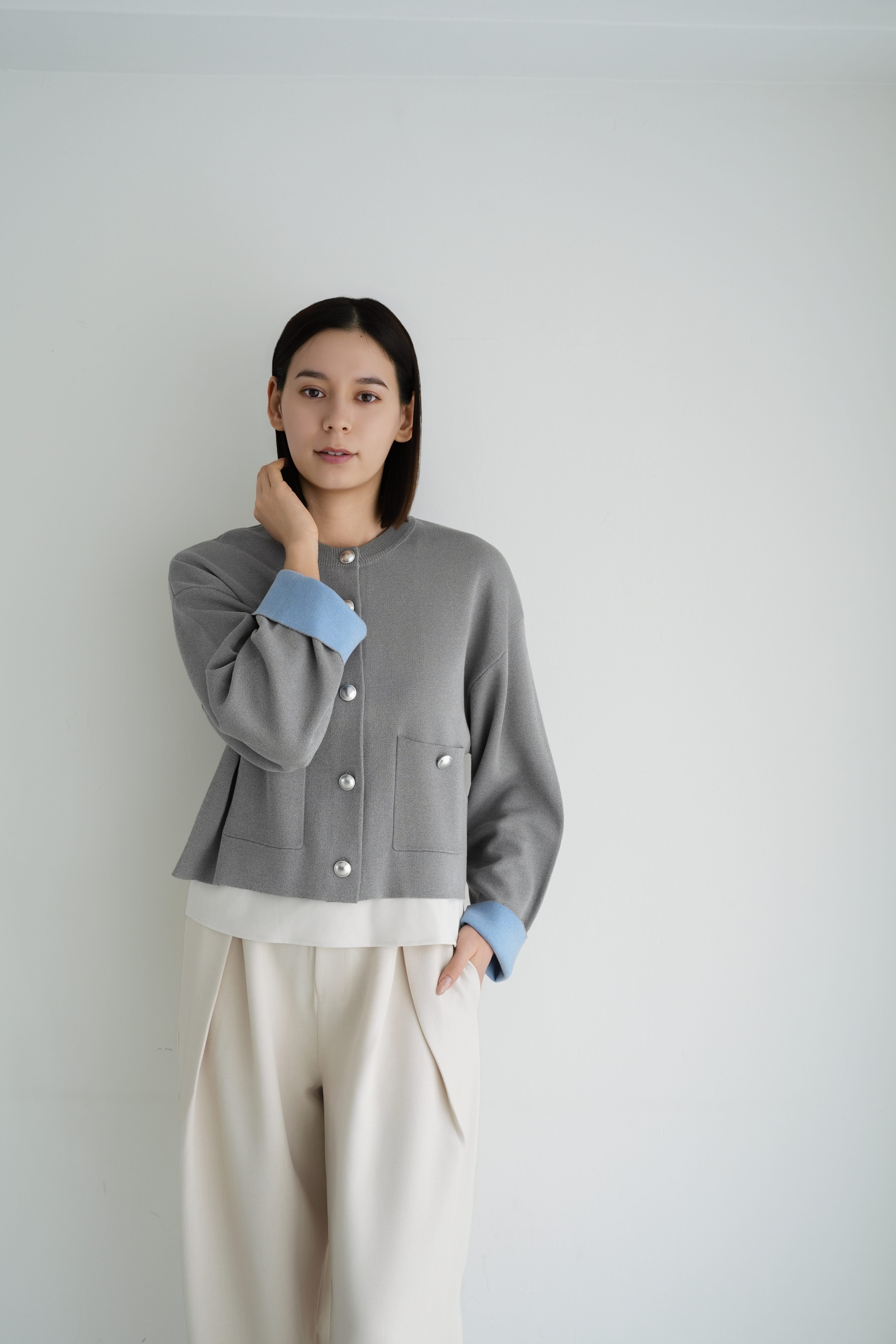 ロゼの「タイムレス・シンプル」を、ニュアンスグレーで柔らかく表現したショート丈カーディガンジャケット。丸みのあるクルーネックと、シルバーボタンの端正な輝きが顔まわりをすっきり見せ、きれいめにもカジュアルにも寄り添います。袖口のパステルブルーがさりげないアクセントになり、ワントーンコーデを軽やかに更新。程よくゆとりのあるシルエットに、フロントポケットで立体感を添えました。ハイウエストのパンツに合わせれば脚長バランスに、ワンピースの上に羽織れば週末の「ロゼ・ウィークエンド」らしい上品な抜け感へ。長く愛せる、気負わない上質さが魅力です。