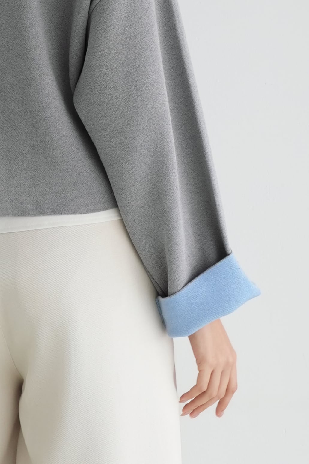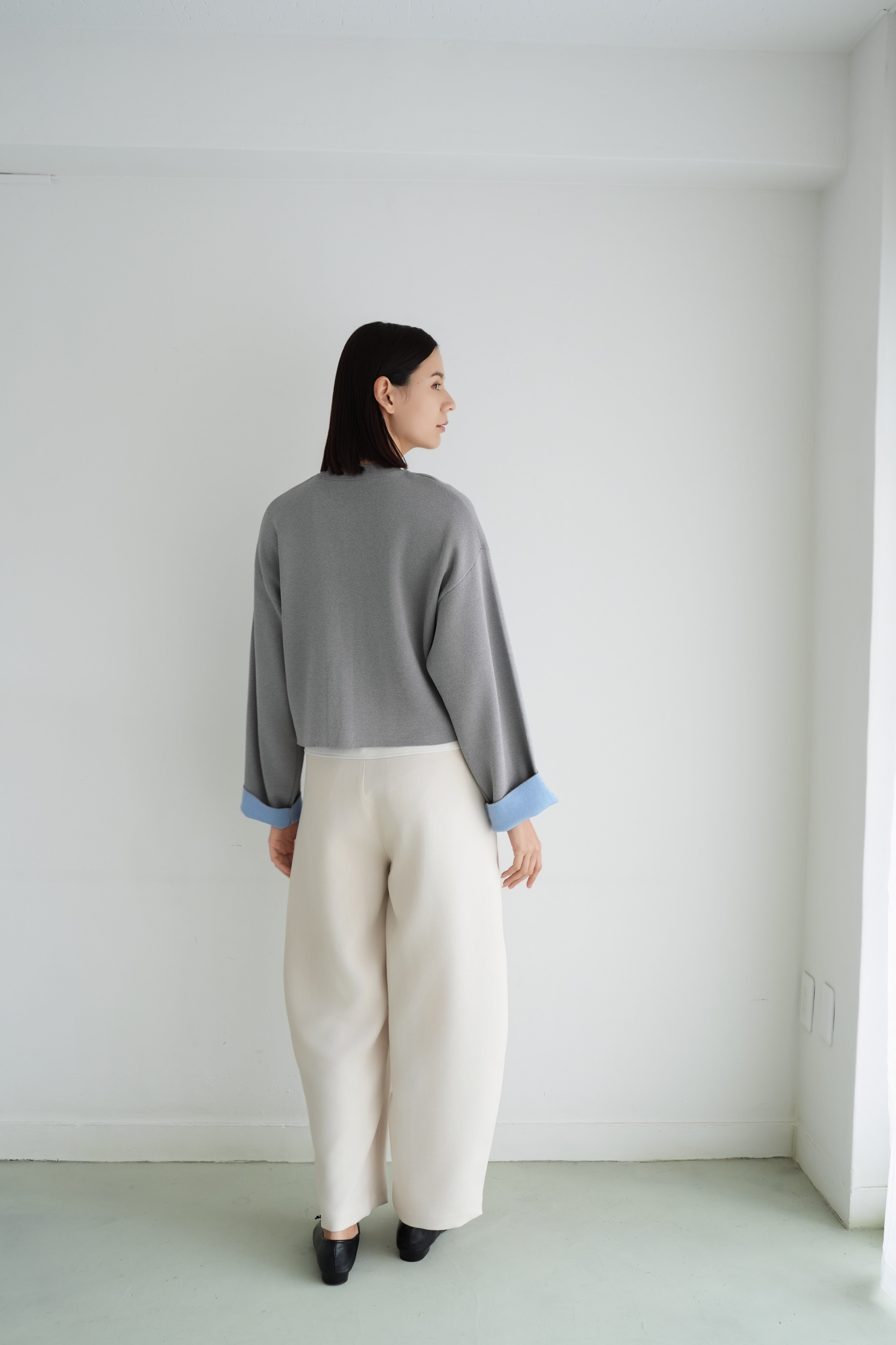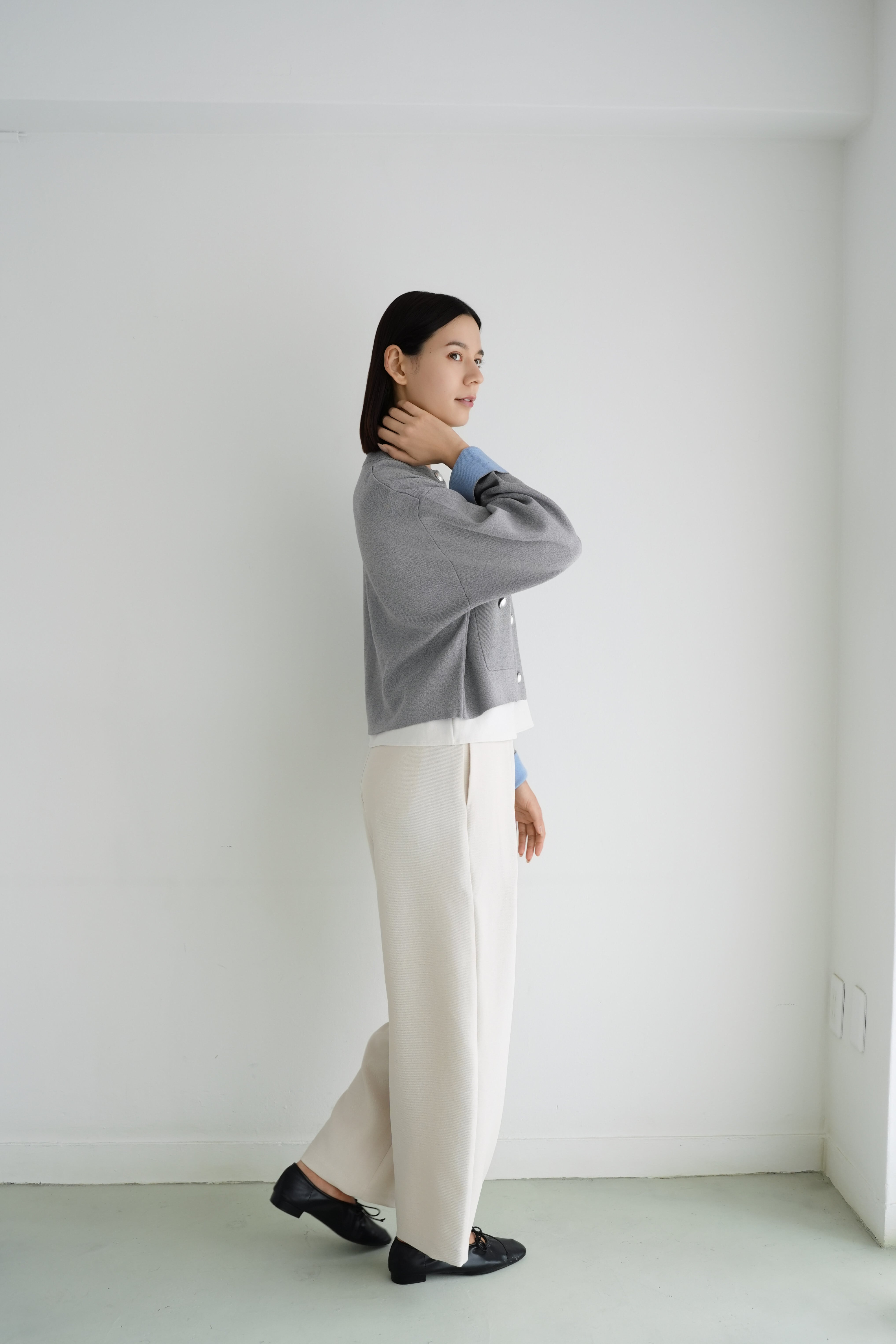ロゼの「タイムレス・シンプル」を、ニュアンスグレーで柔らかく表現したショート丈カーディガンジャケット。丸みのあるクルーネックと、シルバーボタンの端正な輝きが顔まわりをすっきり見せ、きれいめにもカジュアルにも寄り添います。袖口のパステルブルーがさりげないアクセントになり、ワントーンコーデを軽やかに更新。程よくゆとりのあるシルエットに、フロントポケットで立体感を添えました。ハイウエストのパンツに合わせれば脚長バランスに、ワンピースの上に羽織れば週末の「ロゼ・ウィークエンド」らしい上品な抜け感へ。長く愛せる、気負わない上質さが魅力です。